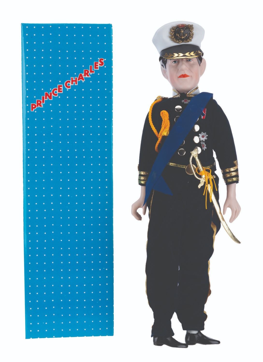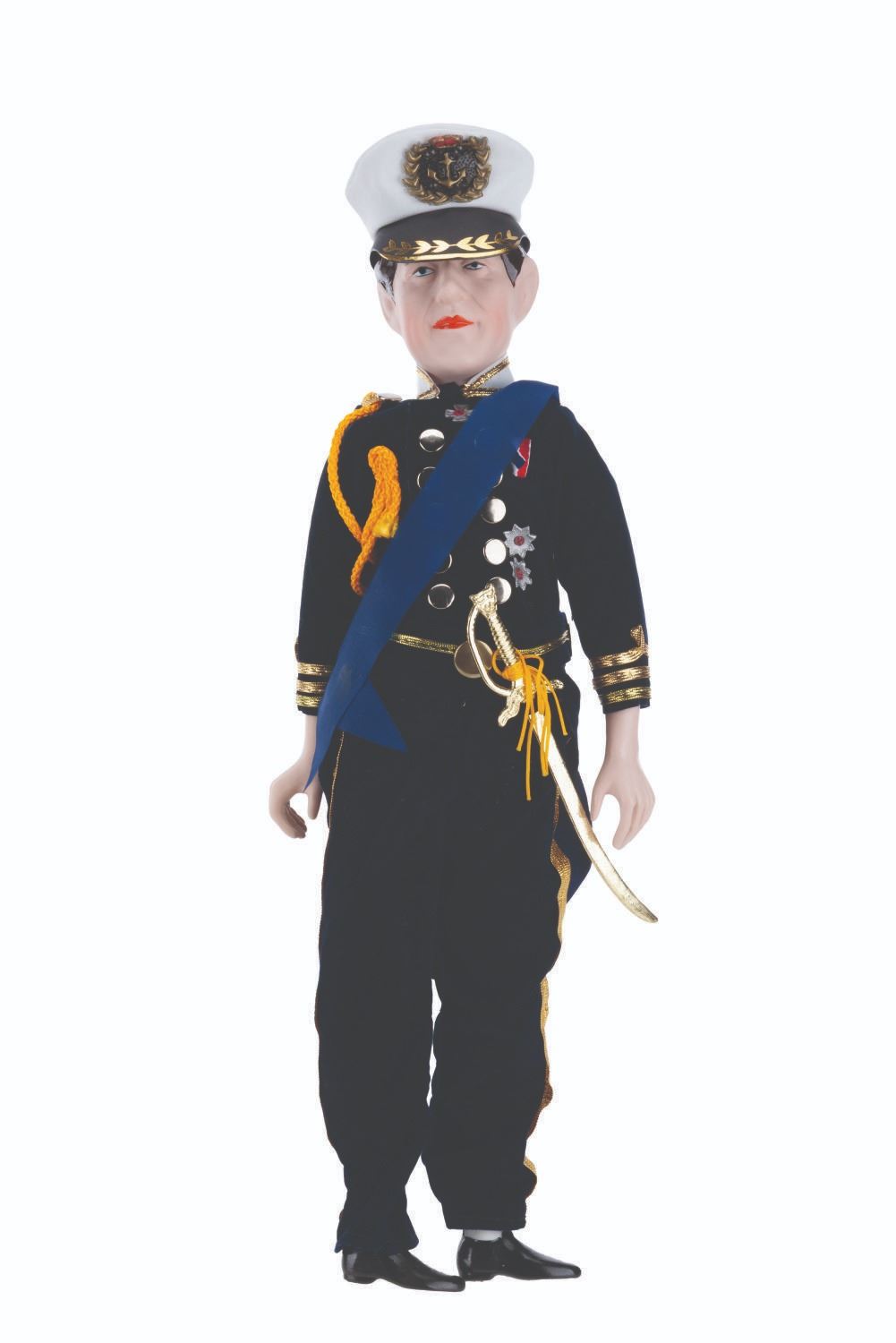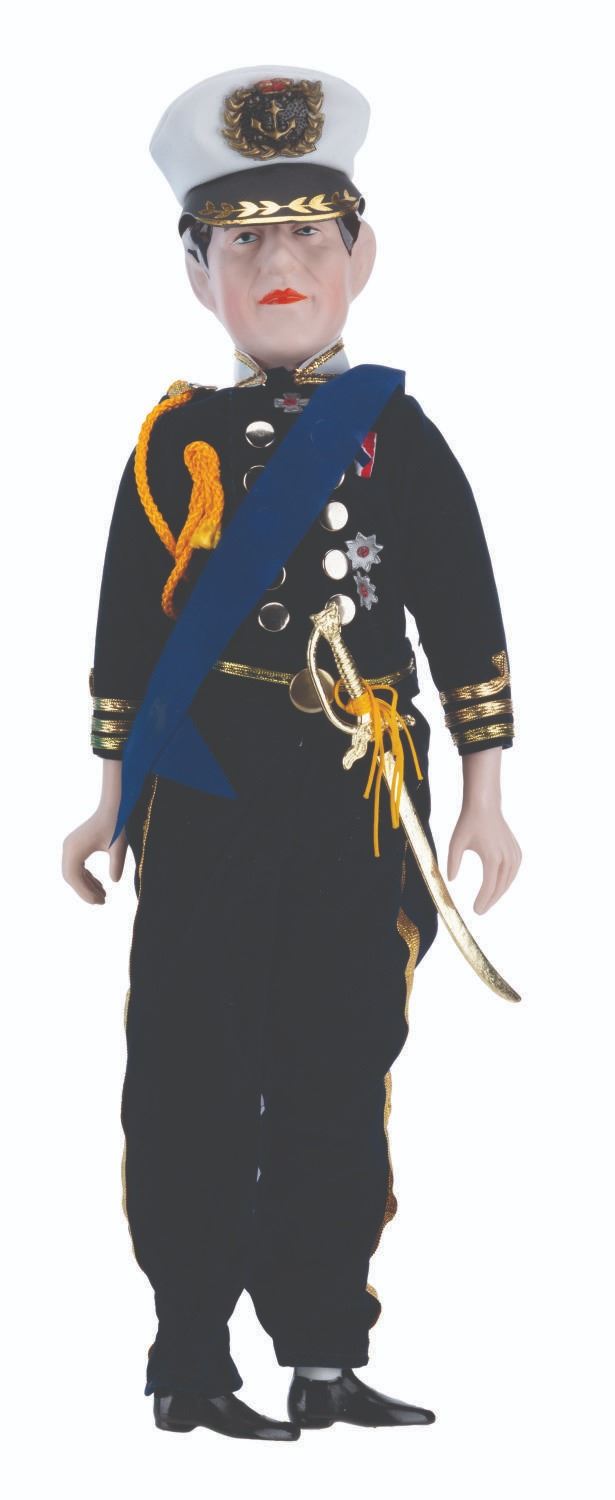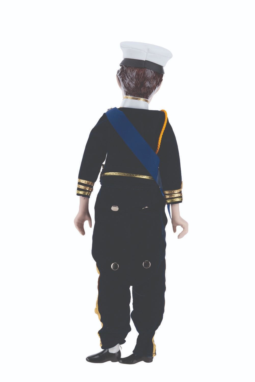 (Unknown) A Prince Charles porcelain doll dressed in a navy uniform with a light blue sash, hat, and sword accessory. Measuring 16.6 " tall, the doll is in fine condition with light wear to plastic decorative badges from age.