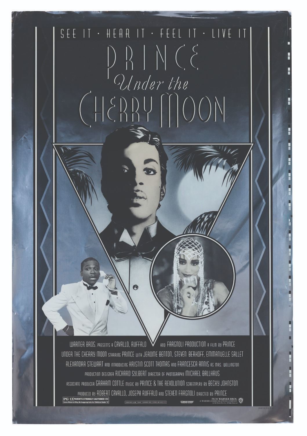 (Warner Bros., 1986) A rare metallic poster for the musical film "Under the Cherry Moon," directed by and starring Prince. Measuring 28" x 41", the poster is uncut on the right side and in good condition with creases throughout, a spot of discoloration at the top right, and edge wear.
