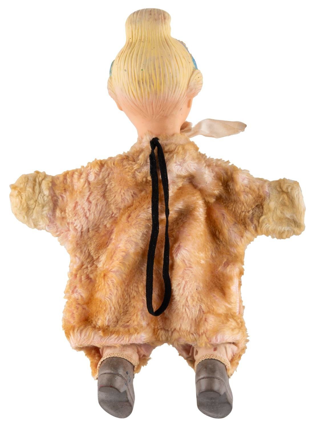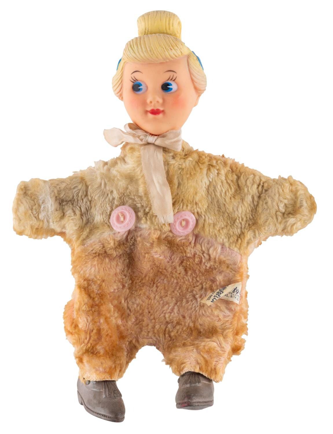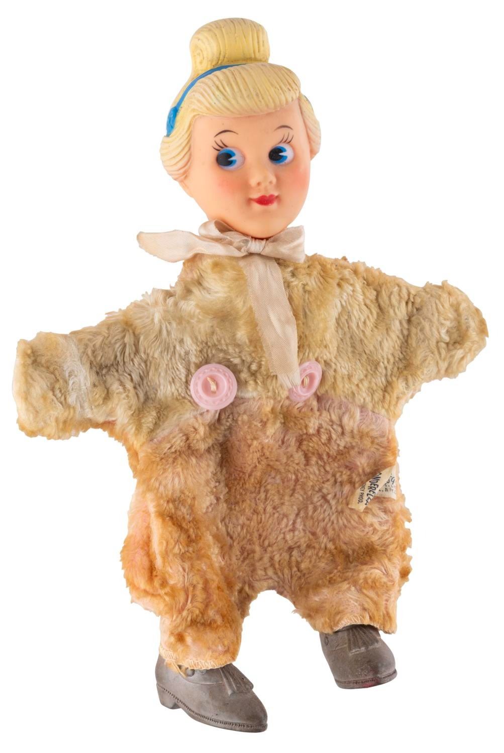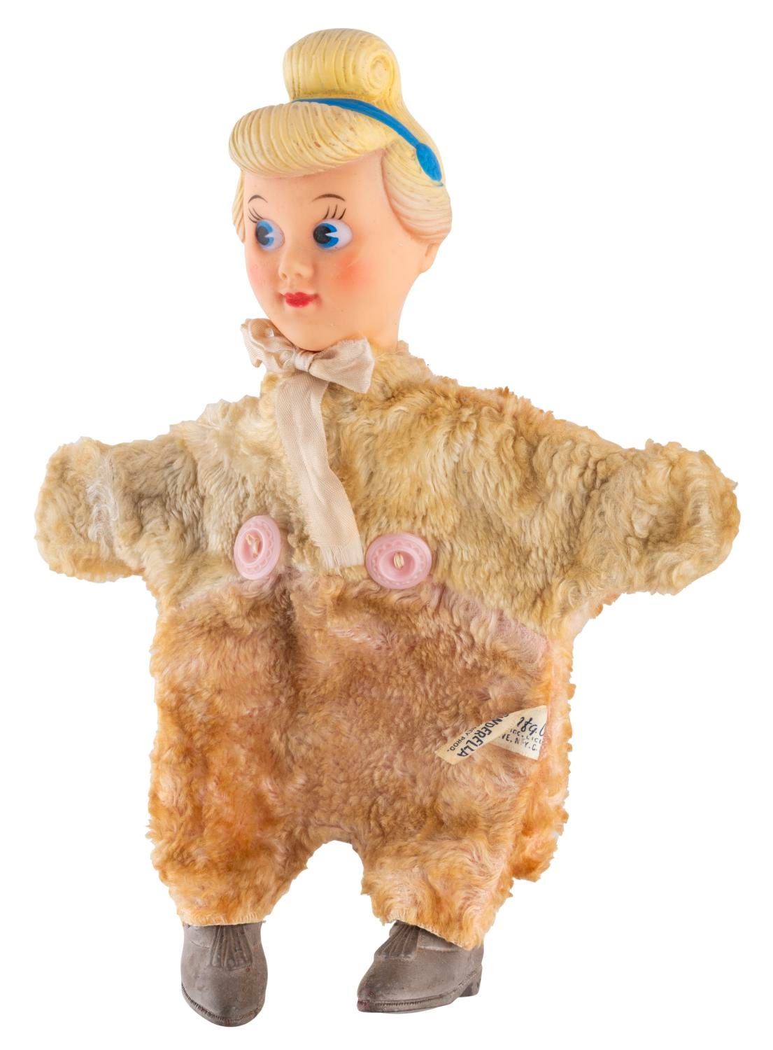 (Gund, 1950s) An unusual "Princess Cinderella " plush hand puppet with a molded-plastic head and rubber shoes on a general fuzzy body. The puppet is in good condition with wear and discoloration from age and use.