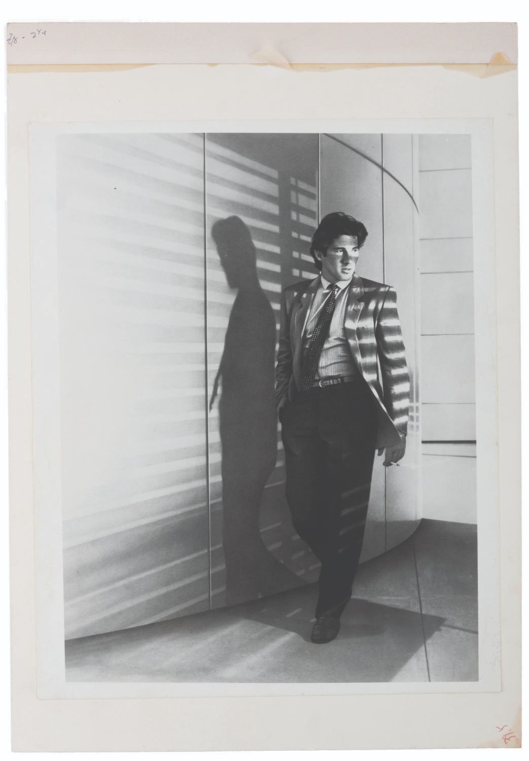(Paramount, 1980) A print of the iconic image of Richard Gere in the poster art for "American Gigolo." With an image size of 10" x 13" mounted to 12.5 x 17.5" art board, the photo displays in very good condition, with wear from production use to the art board.