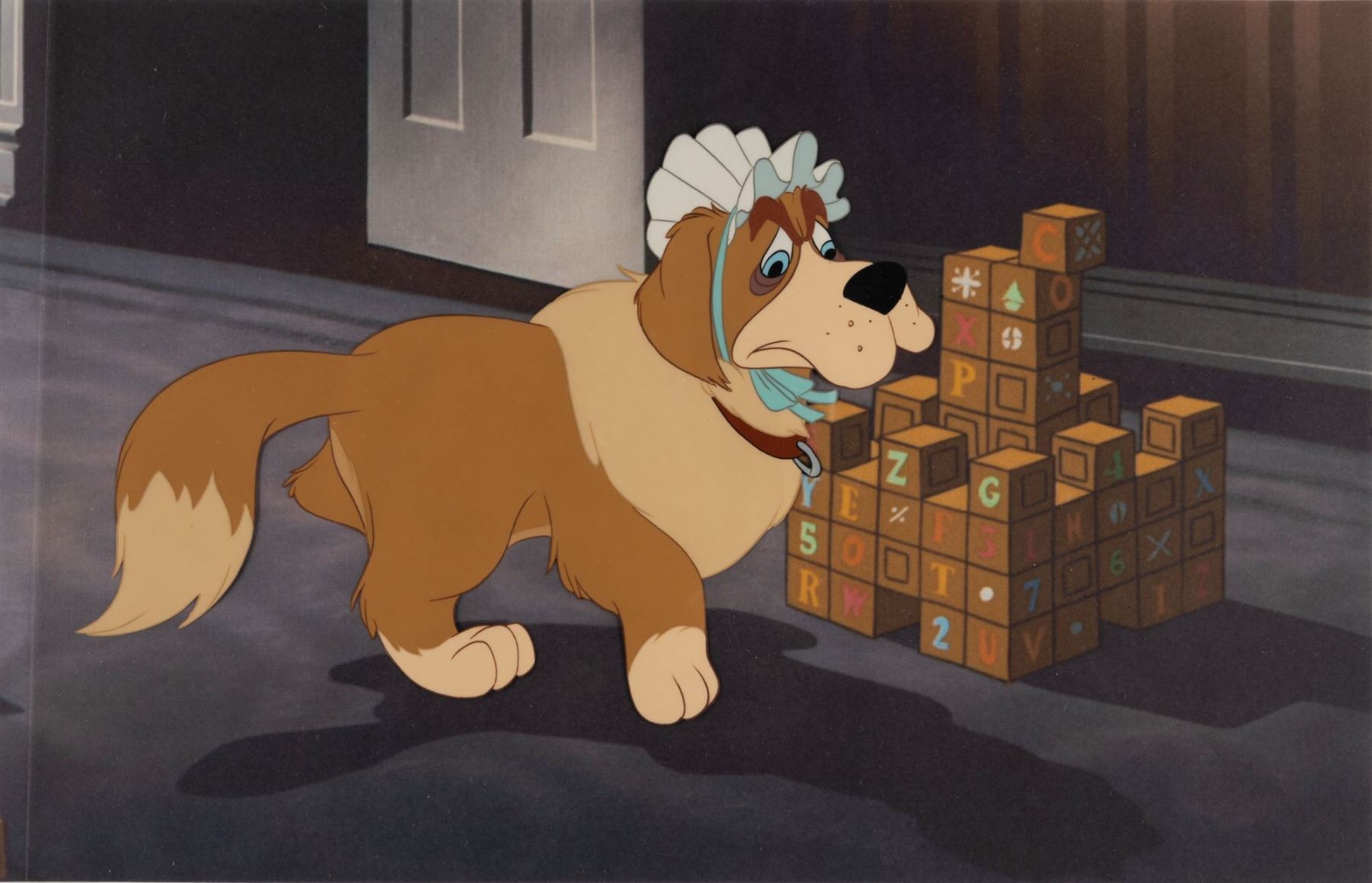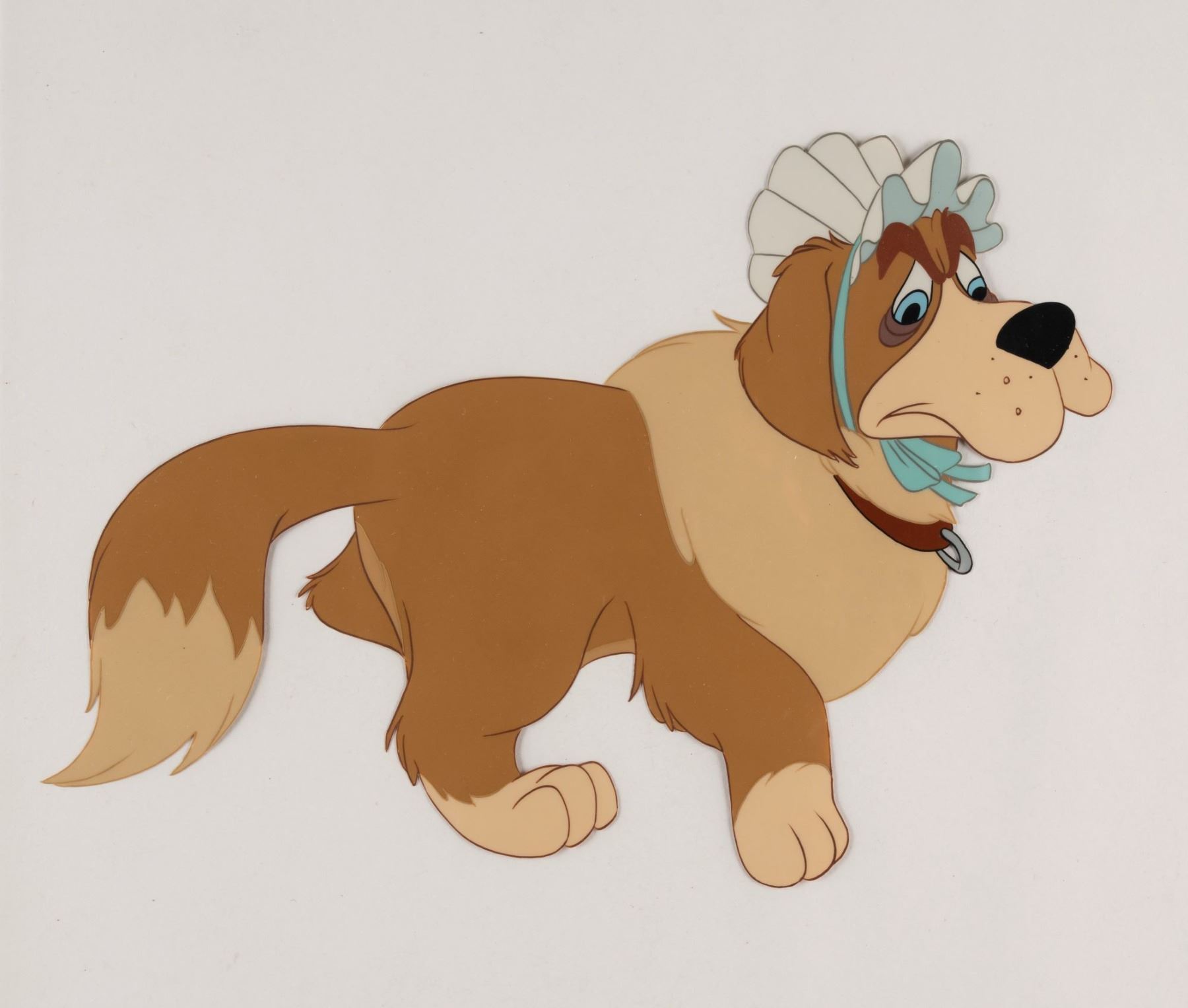 Disney, 1953) An original production cel of Nana from Walt Disney's"Peter Pan." Nana has an image size of 8.5"x6" on an untrimmed 16"x12.5" cel. The cel has been paired with a color copy background for presentation. The cel is in very good condition with all paint intact.