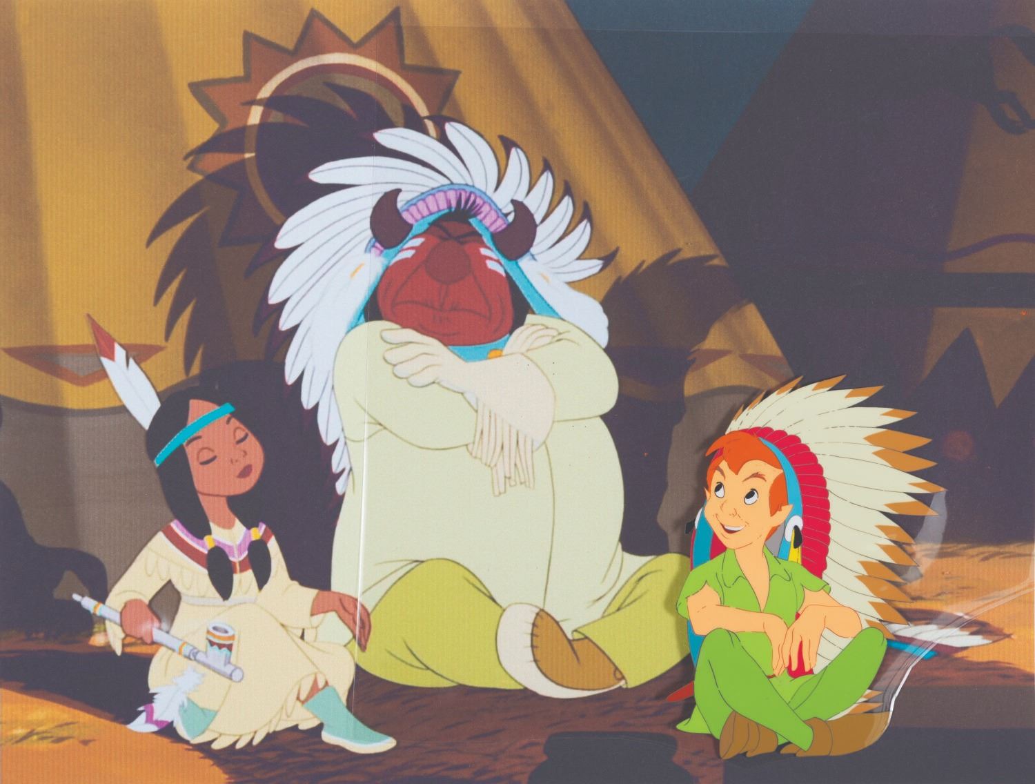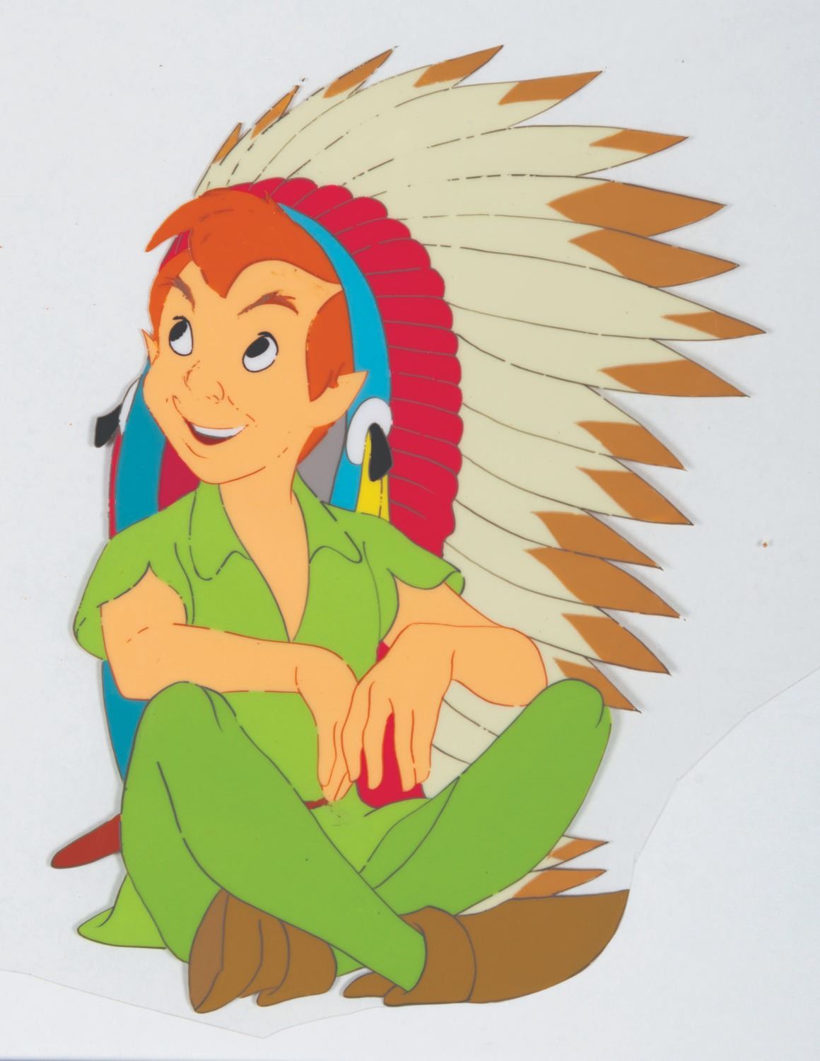 Disney, 1953) An original production cel of Peter Pan from Walt Disney's"Peter Pan." Peter has an image size of 3.5"x5" on an unevenly trimmed 10.5"x10" cel. The cel has been paired with a color copy background featuring Tiger Lily and the Chief. The cel is in good condition with all paint intact and wear to the ink lines throughout.