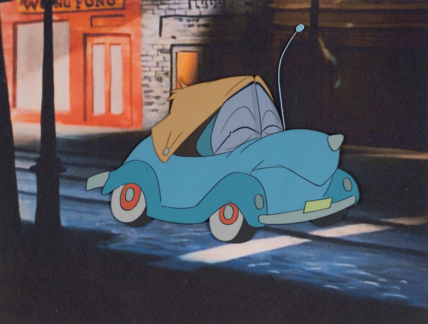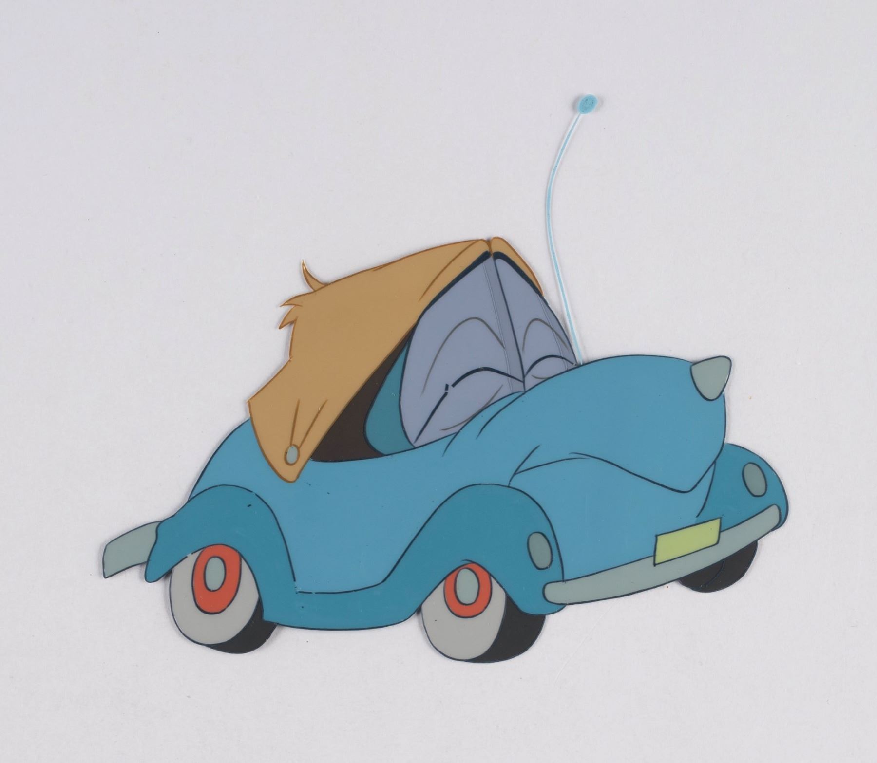 (Disney, 1952) An original production cel of Susie from Walt Disney's 1952 short,"Susie The Little Blue Coupe." Susie has an image size of 5"x4" on an untrimmed 12"x10" cel. The cel has been placed on a color copy background for presentation. The cel is in fine condition with all paint intact.