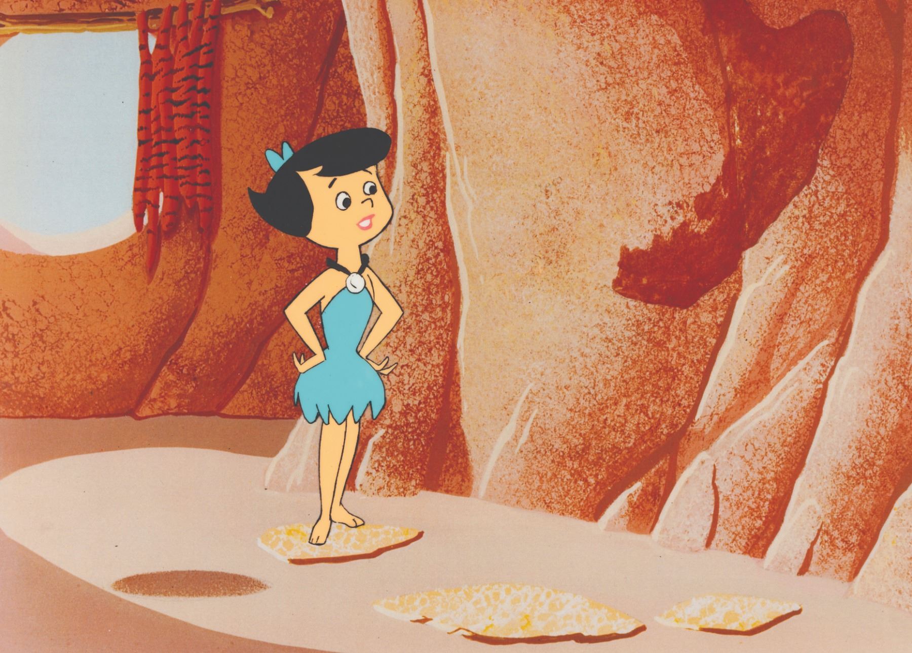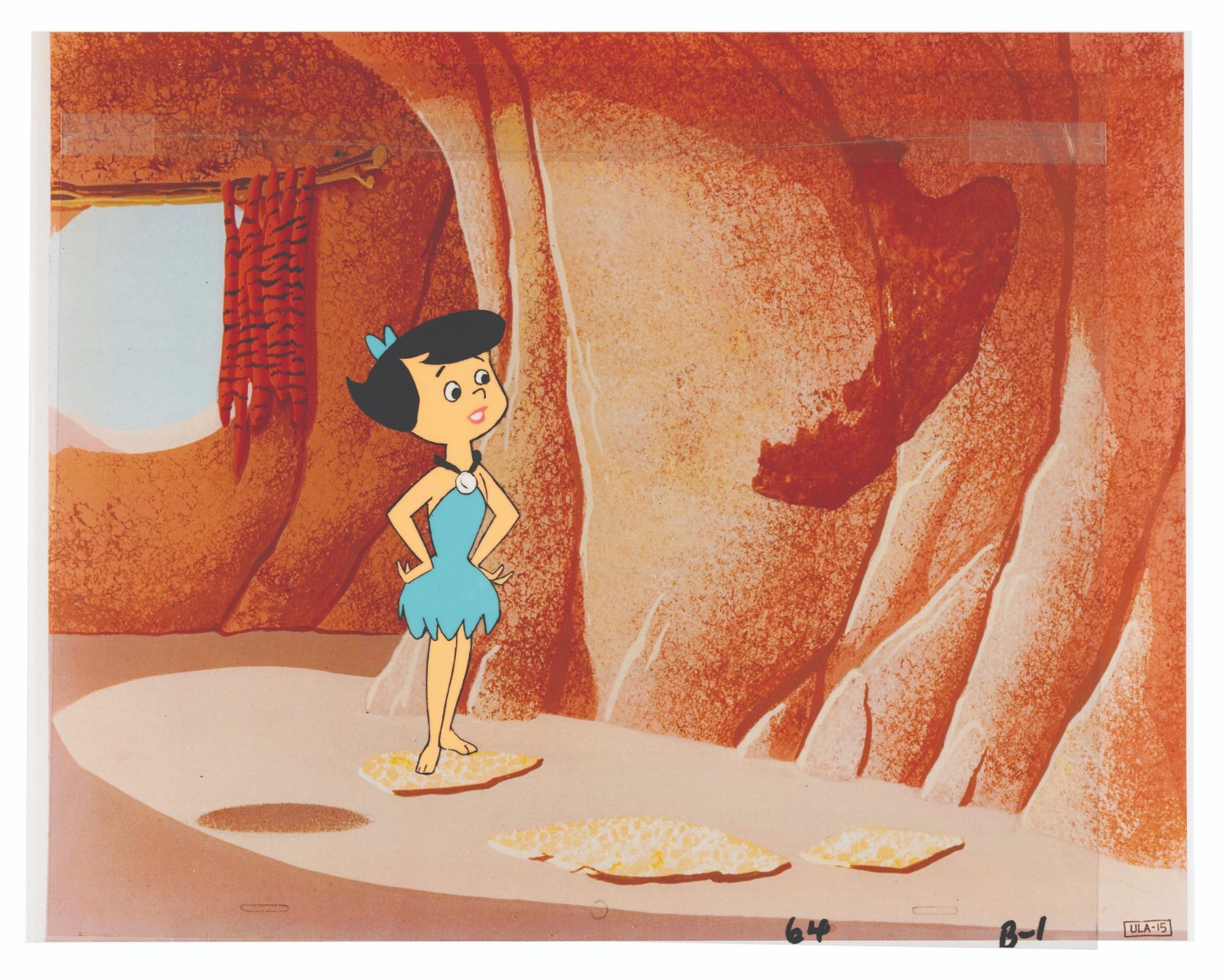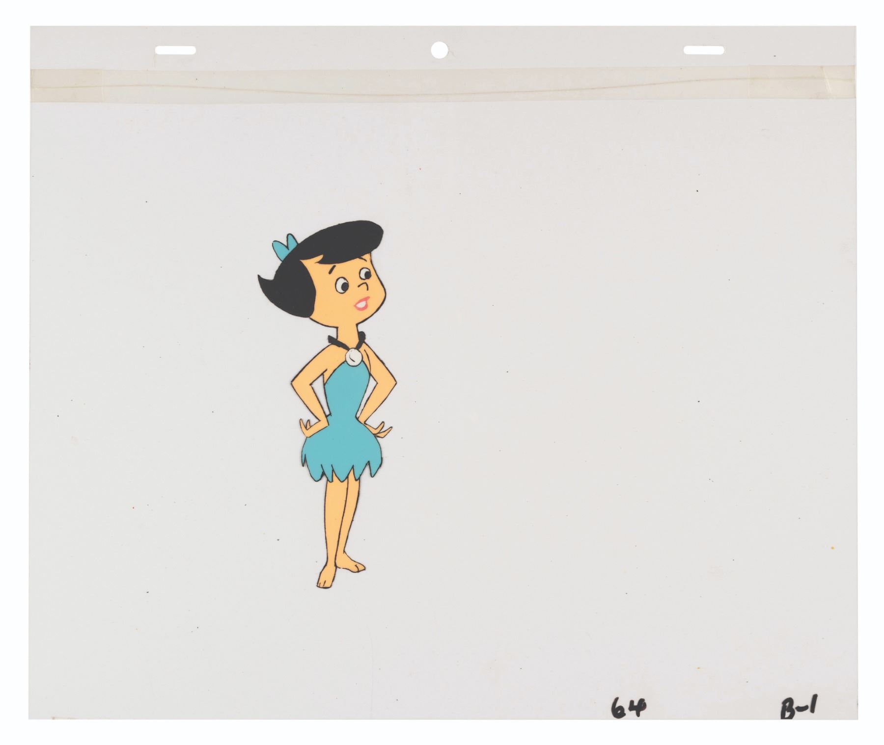 (Hanna-Barbera, 1980) An original production cel from “The Flintstones Comedy Hour” featuring Betty Rubble. Measuring 10.5” x 12.5” with a character image size of 5.5” x 2.25” and paired with a color copy background, the cel displays in good condition with the top 1” trimmed off and reattached with tape which does not affect the image.
