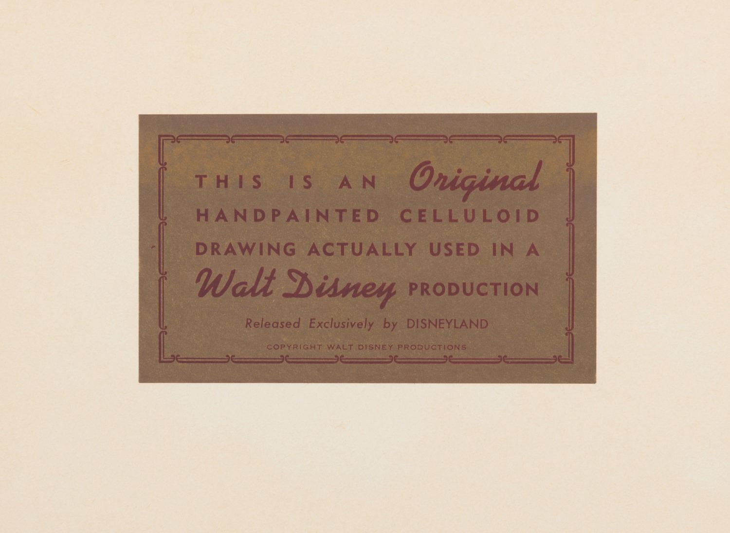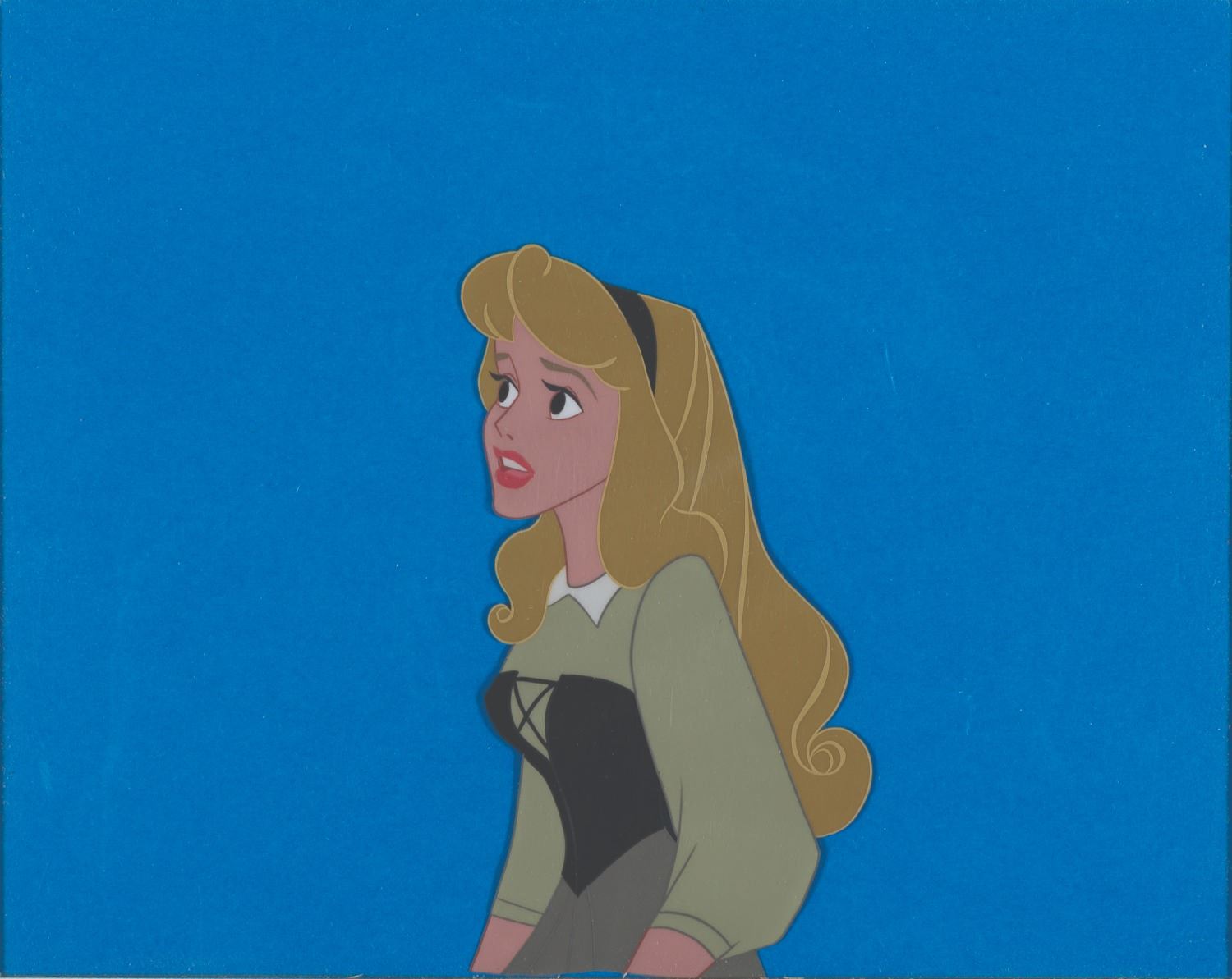 (Disney, 1959) An original production cel of Briar Rose from Walt Disney's "Sleeping Beauty." This cel was originally sold at The Art Corner in Disneyland and has been slightly trimmed to 8.25"x6.5" and placed on a color background as prepared by the Studio for sale. The cel retains a Disneyland Gold Label on the reverse and is presented in a 10.25"x8.75" mat. The character's total image size is 2.5"x4.5". The cel is in very good condition.