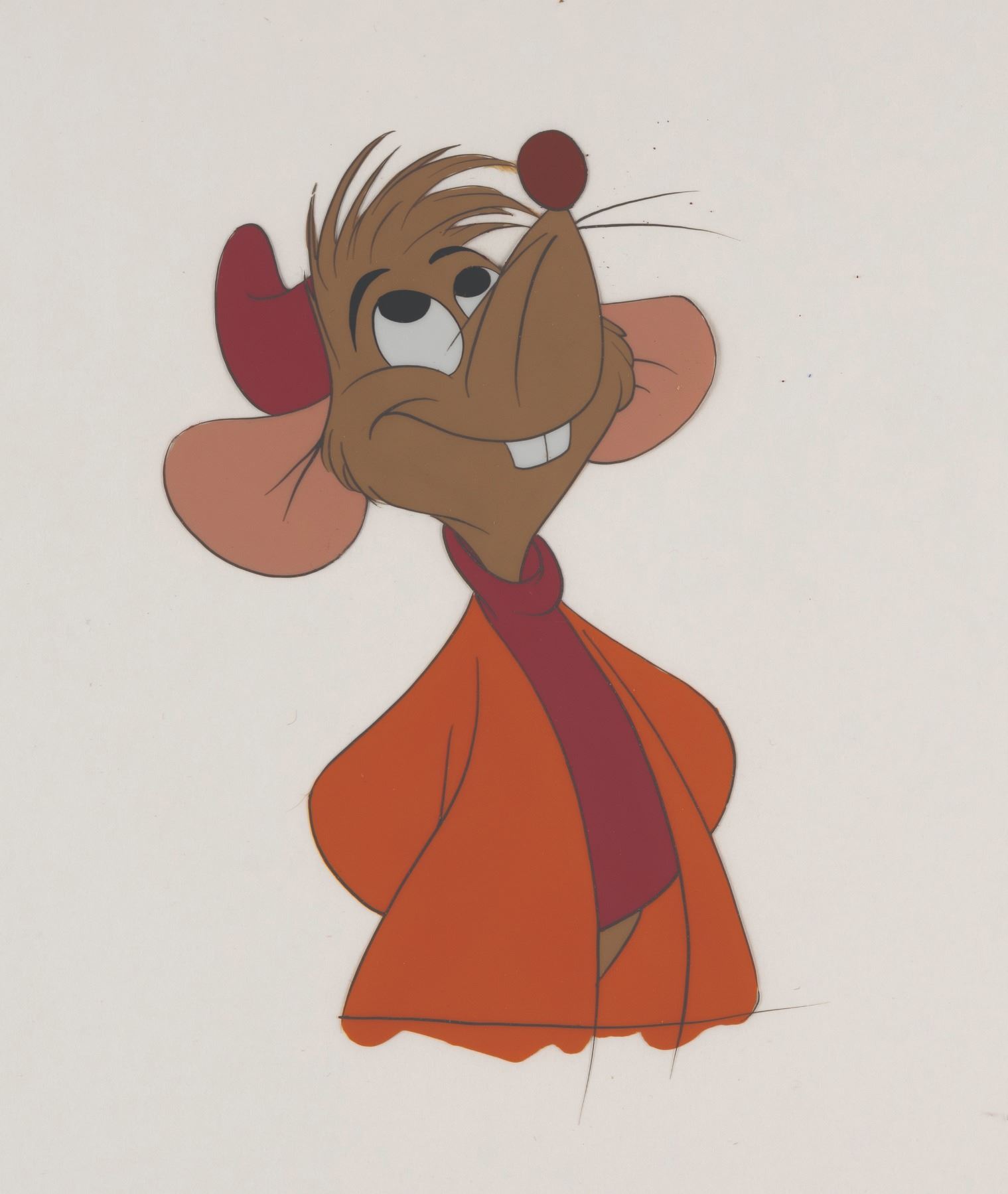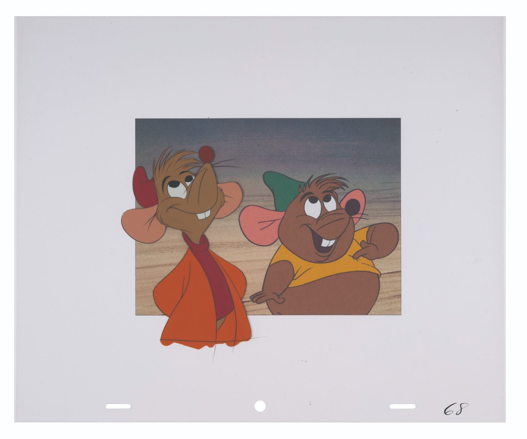(Disney, 1950) An original production cel of Jaq from Walt Disney's 1950 feature film,"Cinderella." Jaq's image size is 5"x3" on an untrimmed 12"x10" cel. The cel is in fine condition and has been placed on a color copy background for presentation.
