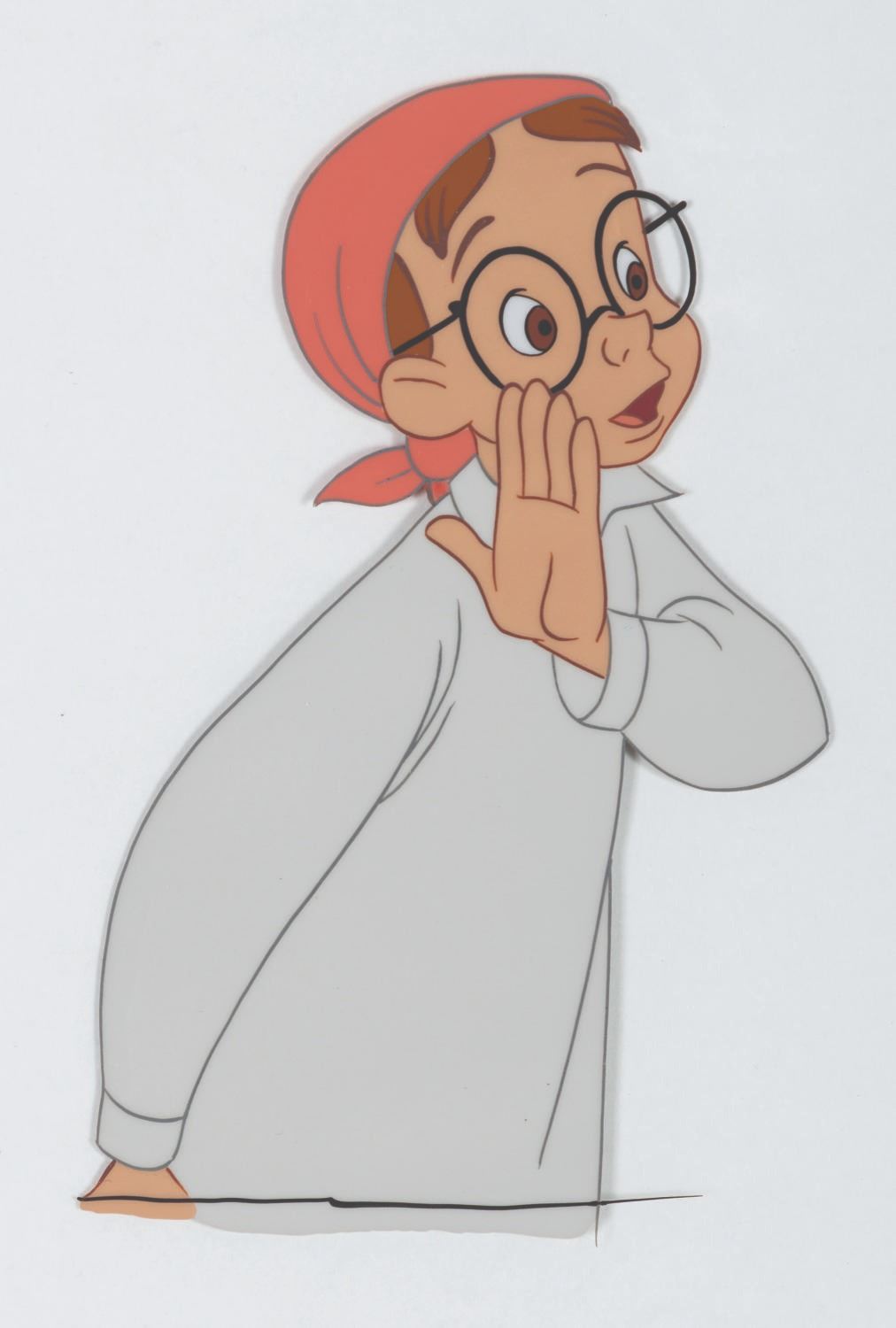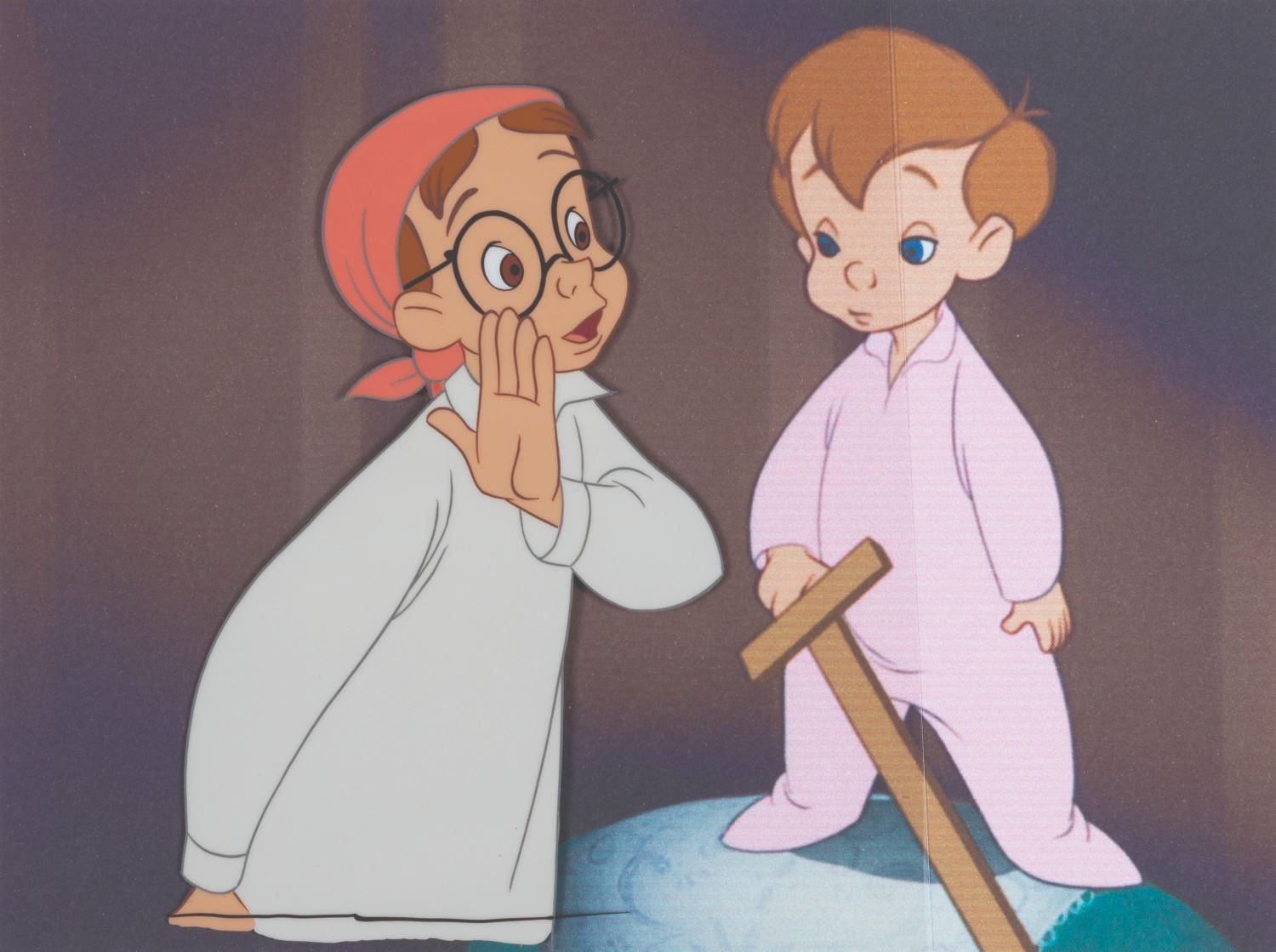 (Disney, 1953) An original production cel of John from Walt Disney's "Peter Pan."  John has an image size of 3"x5" on a a trimmrd 6"x8.5" cel. The cel has been paired with a color copy background featuring Michael. The cel is in very good condition with all paint intact.
