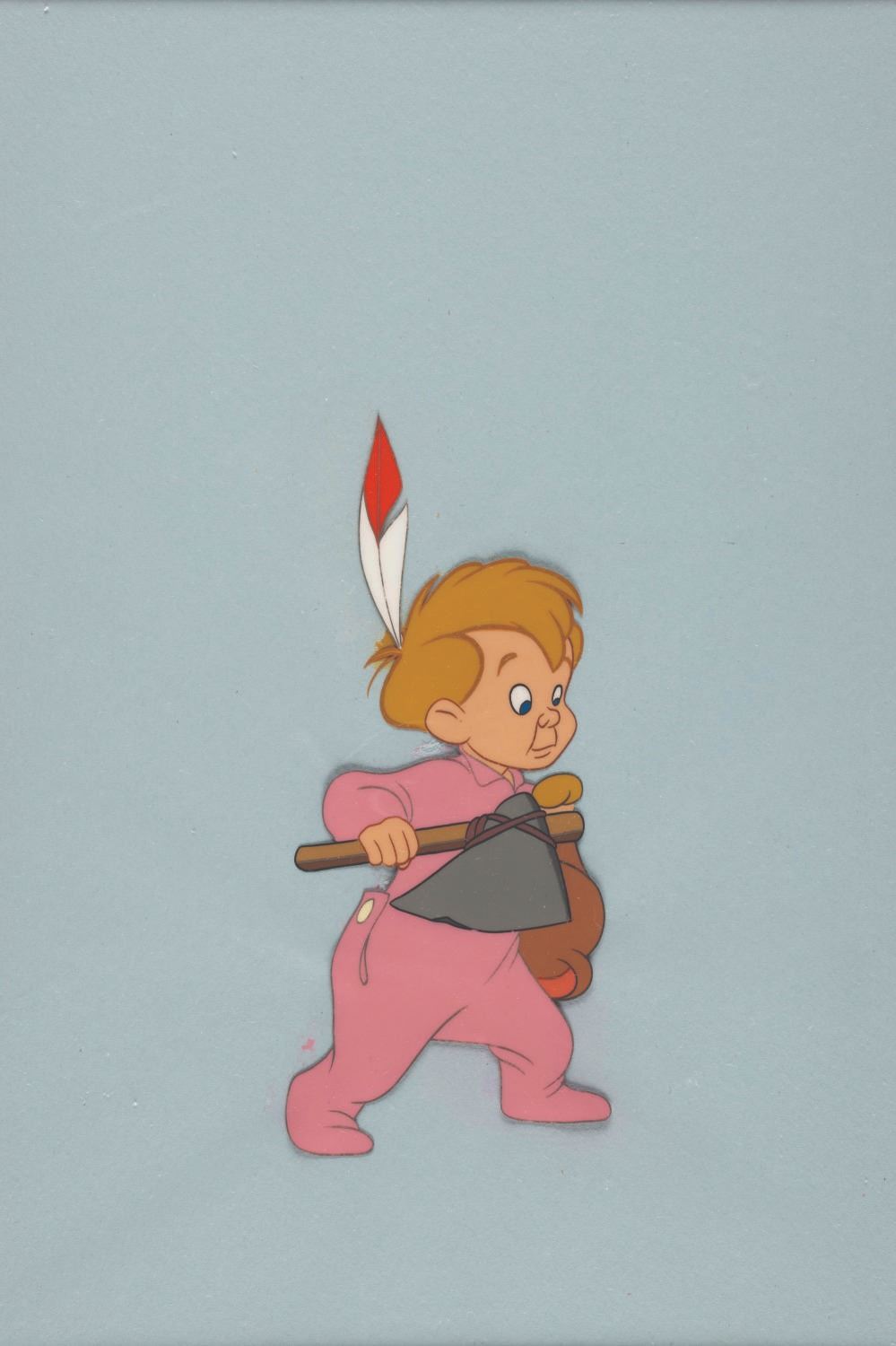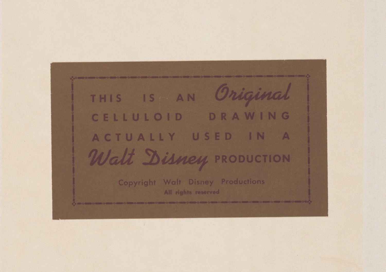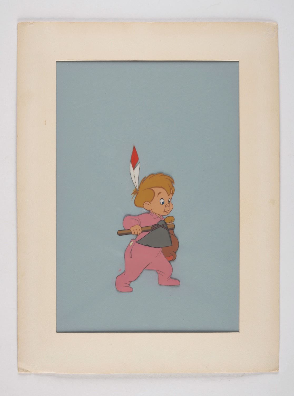 (Disney, 1953) An original production cel of Michael from Walt Disney's"Peter Pan." This cel was originally sold at The Art Corner in Disneyland and has been slightly trimmed to 7.5"x10" as prepared by the Studio for sale. The cel retains a Disneyland Gold Label on the reverse and is still sealed in its original 9"x12" mat. The character's image size is 2.25"x5". The cel is in very good condition with faint areas of wear to some ink lines, and paint stuck to the background.