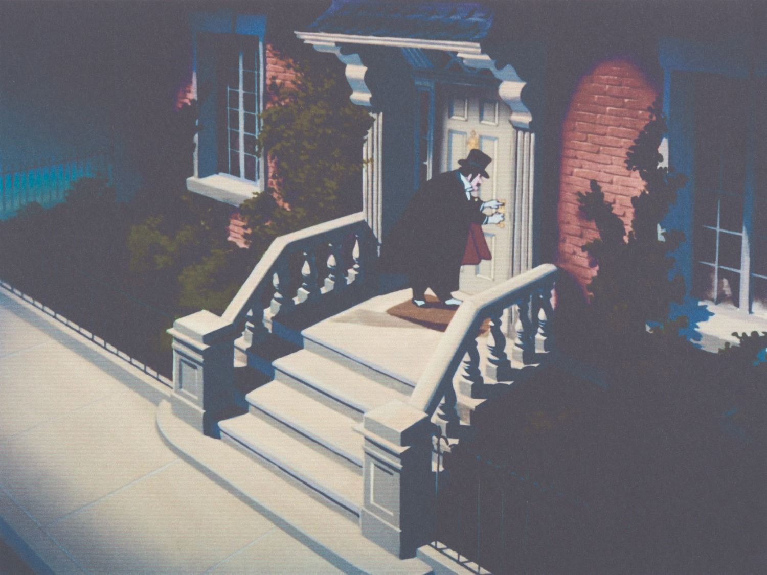 (Disneyland, 1953) An original production cel of Mary Darling from "Peter Pan," presented with a color copy background. The cel has a character image size of 1"x2.75" on its 16"x12.5" slightly-trimmed cel and is in fine condition. The color copy background contains the image of Mr. Darling.