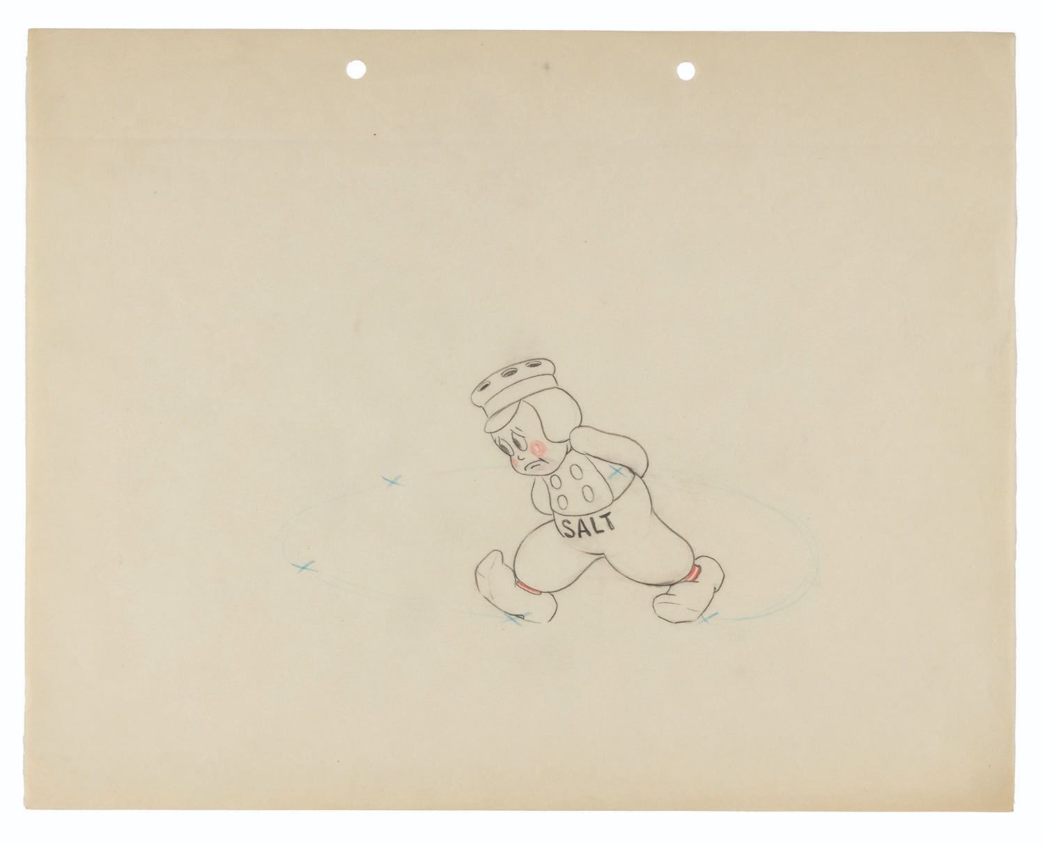 (Schlesinger, 1935) An original concept drawing from the Merrie Melodies short “Little Dutch Plate.” With an image size of 3” x 3.25” on 9.5” x 12” animation paper, the graphite and colored pencil drawing displays in very good condition with creases and a full horizontal fold near the top.