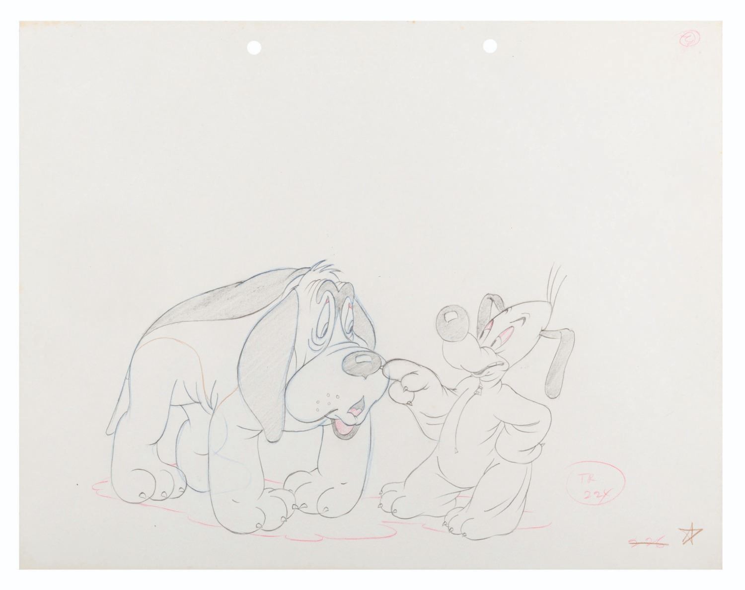 (Schlesinger, 1940) An original production drawing of George the Fox and Willoughby from the Merrie Melodies short "Of Fox and Hounds.” Measuring 5” x 8” on a 9.5” x 12” piece of drawing paper, the graphite drawing is in very good condition with light spotting and discoloration from age.