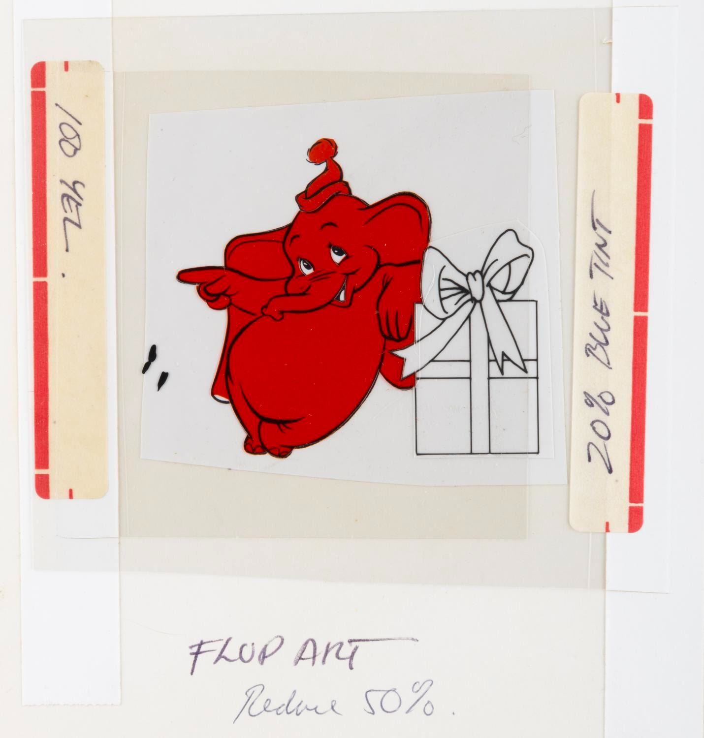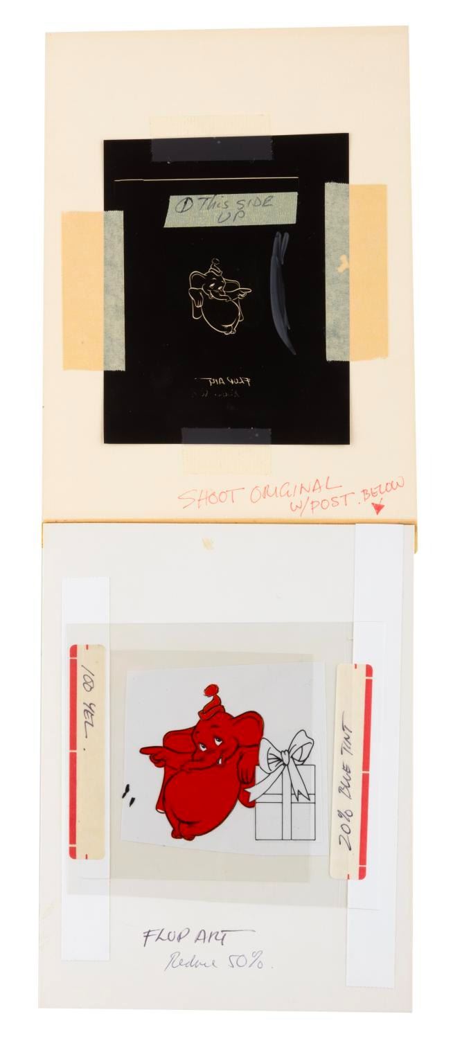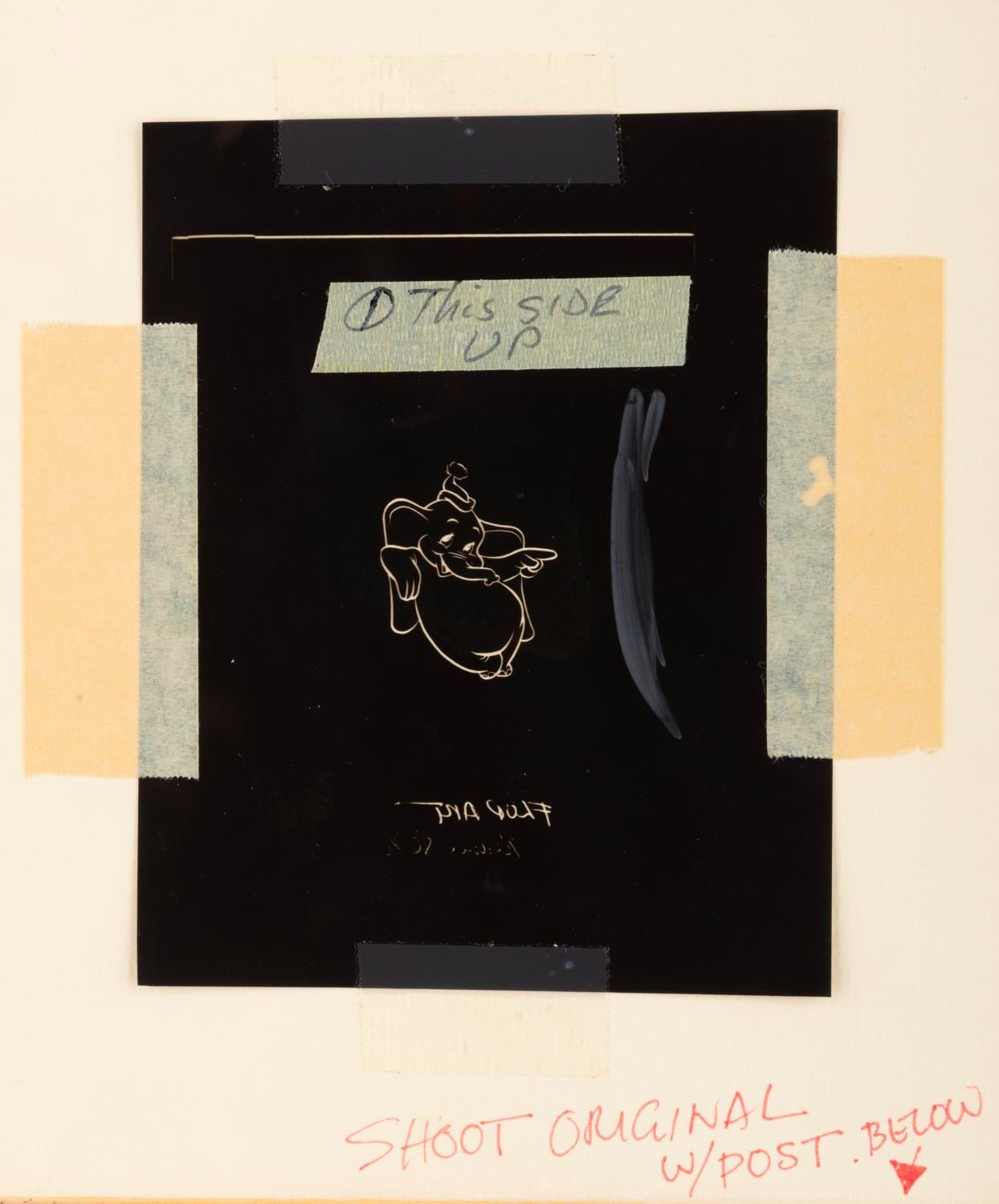 (Disney, 1980s) An original production-used print and printing negative of Dumbo used in the creation of a Disney publication. The print is affixed to illustration board with production notes written in ink and two red transparency overlays hinged on the sides with tape. A 4” x 5” photo negative of the artwork is attached with tape to the inside of the protective paper cover hinged at the top of the board. Measuring 7.75” x 6” with a character image size of 2.5” x 3”, the print and negative are in very good condition with light stains and discoloration.