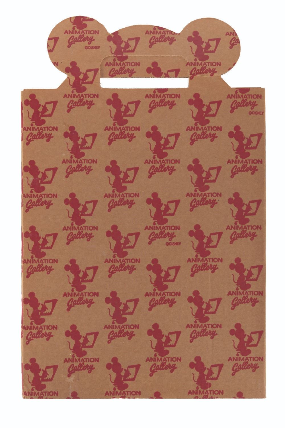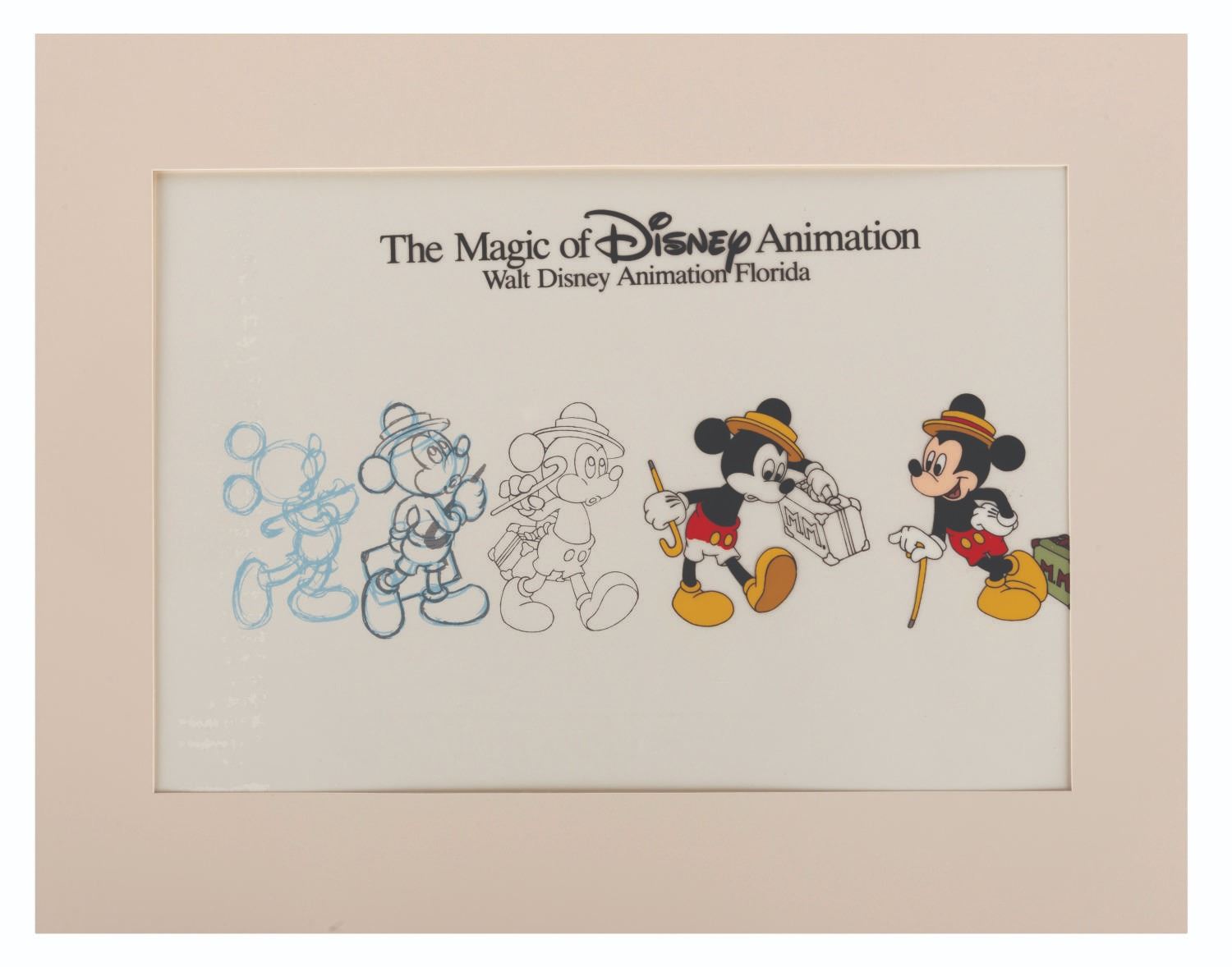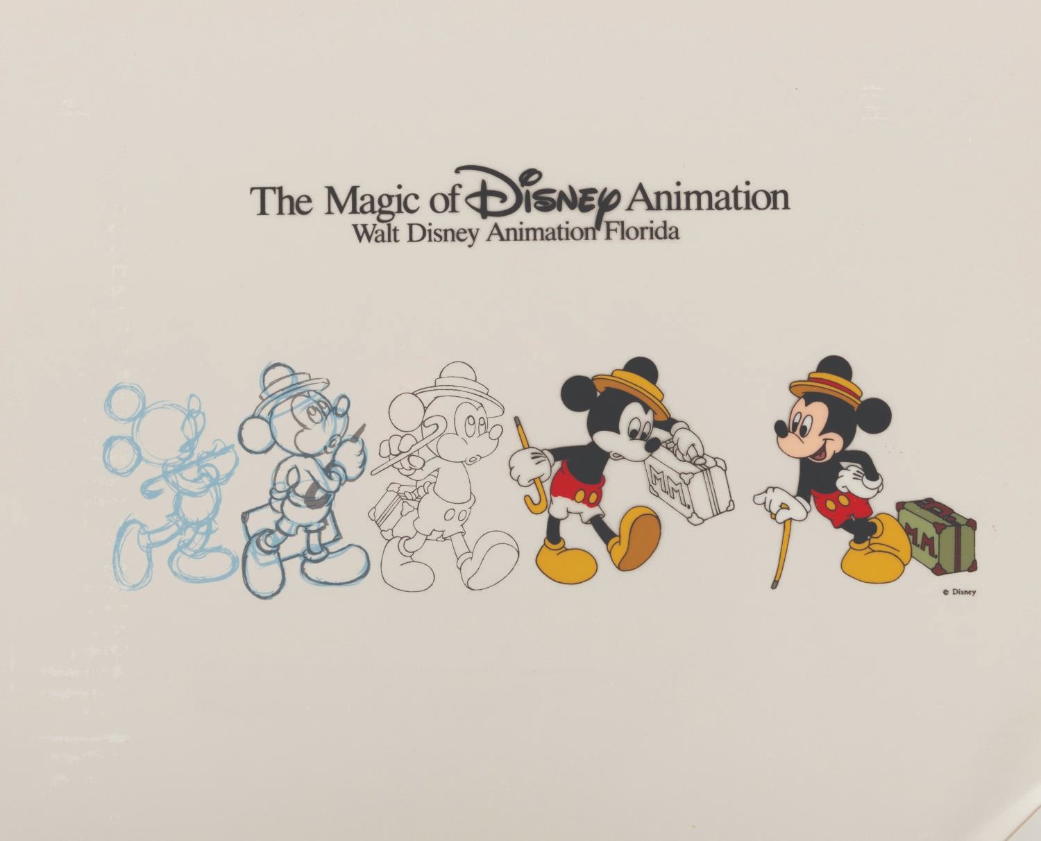 (Disney-MGM Studios, 1992) A “Progressive Mickey” cel from The Magic of Disney Animation illustrating the main steps in the traditional animation process. Three drawings on the background show Mickey in rough, detail, and clean-up drawn stages, and the sericel features Mickey Mouse in the Xerographic and final painting steps. This piece comes with a two-page description of the process illustrated. With an image size of 3” x 5.5” on a 10.5” x 13” cel with its original 11.25” x 14.75” Animation Gallery-branded cardboard packaging, the art displays in good condition with scratches, edge wear, and 6” of tape residue stains.