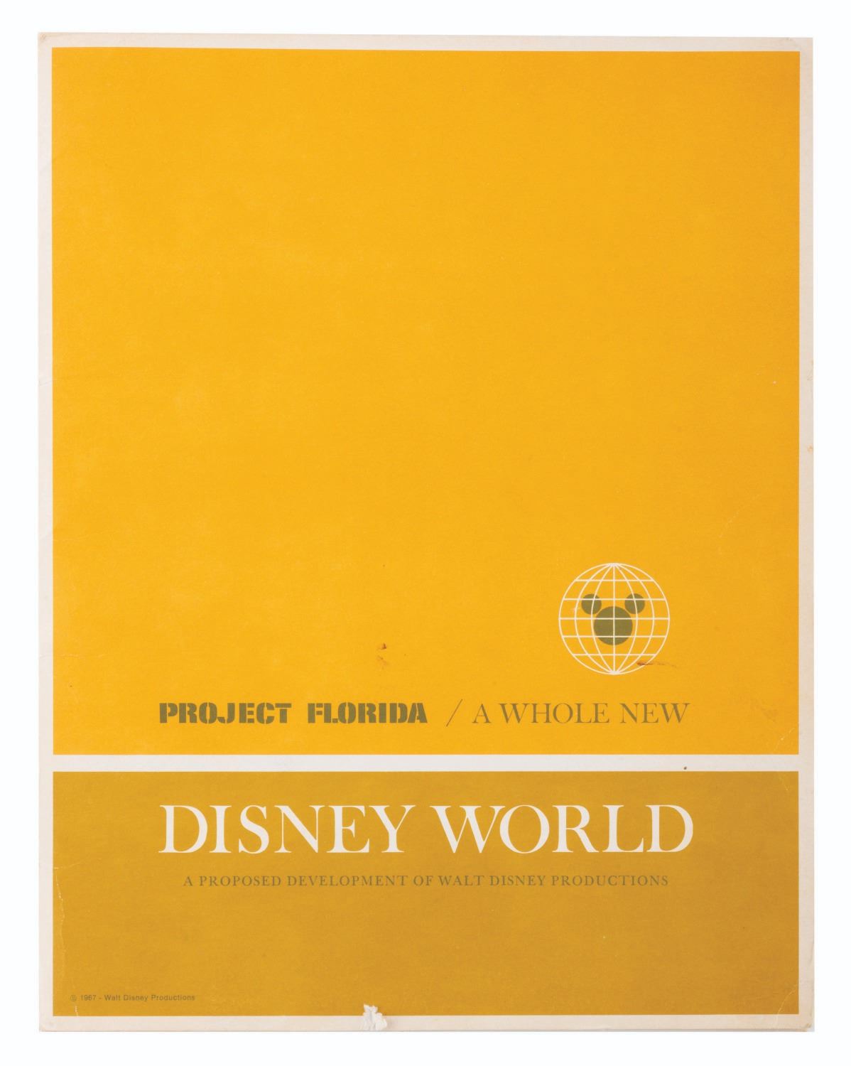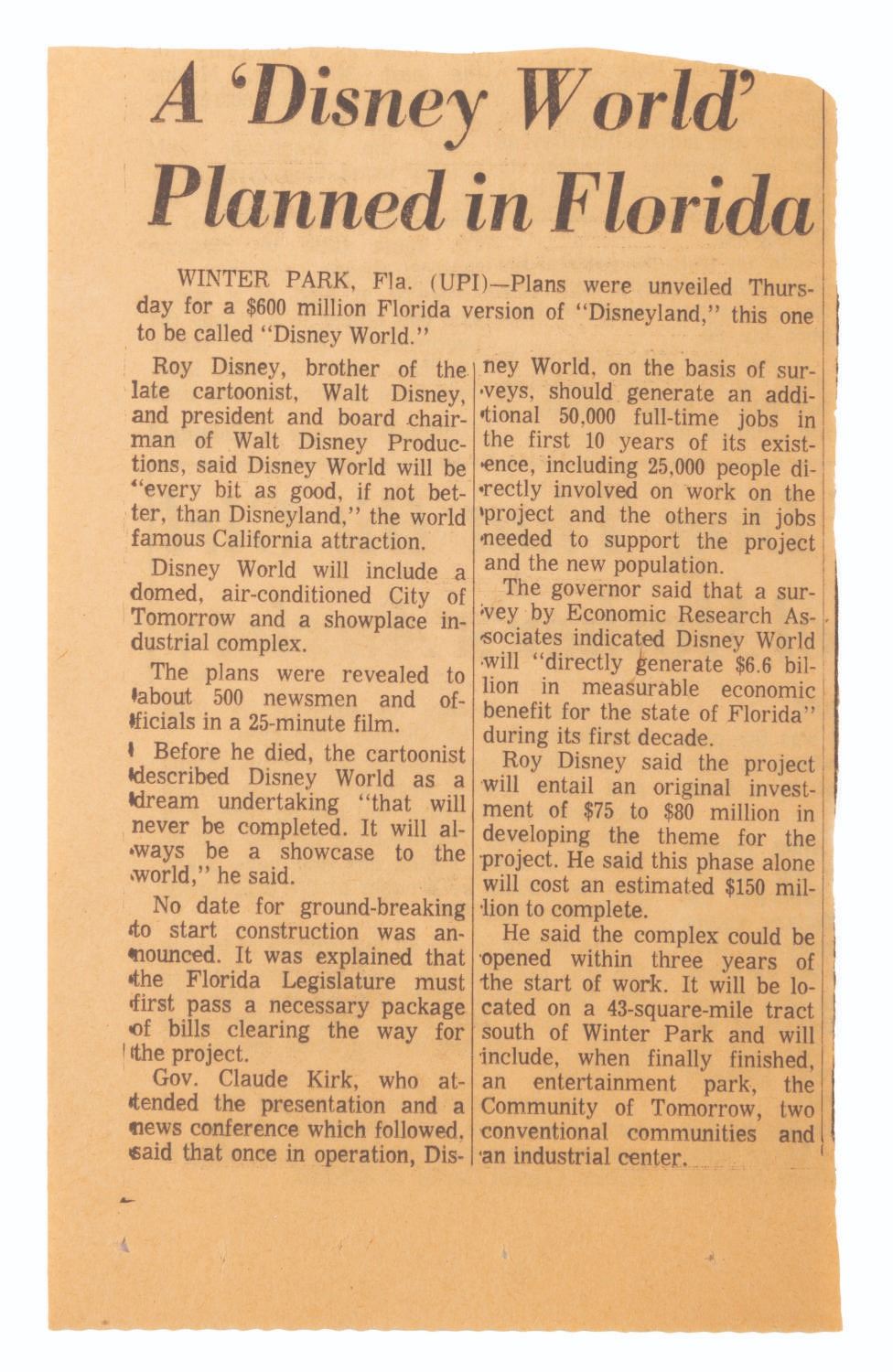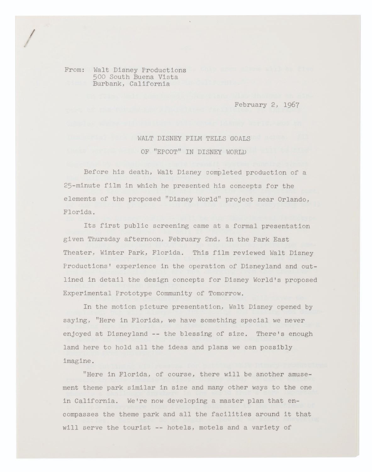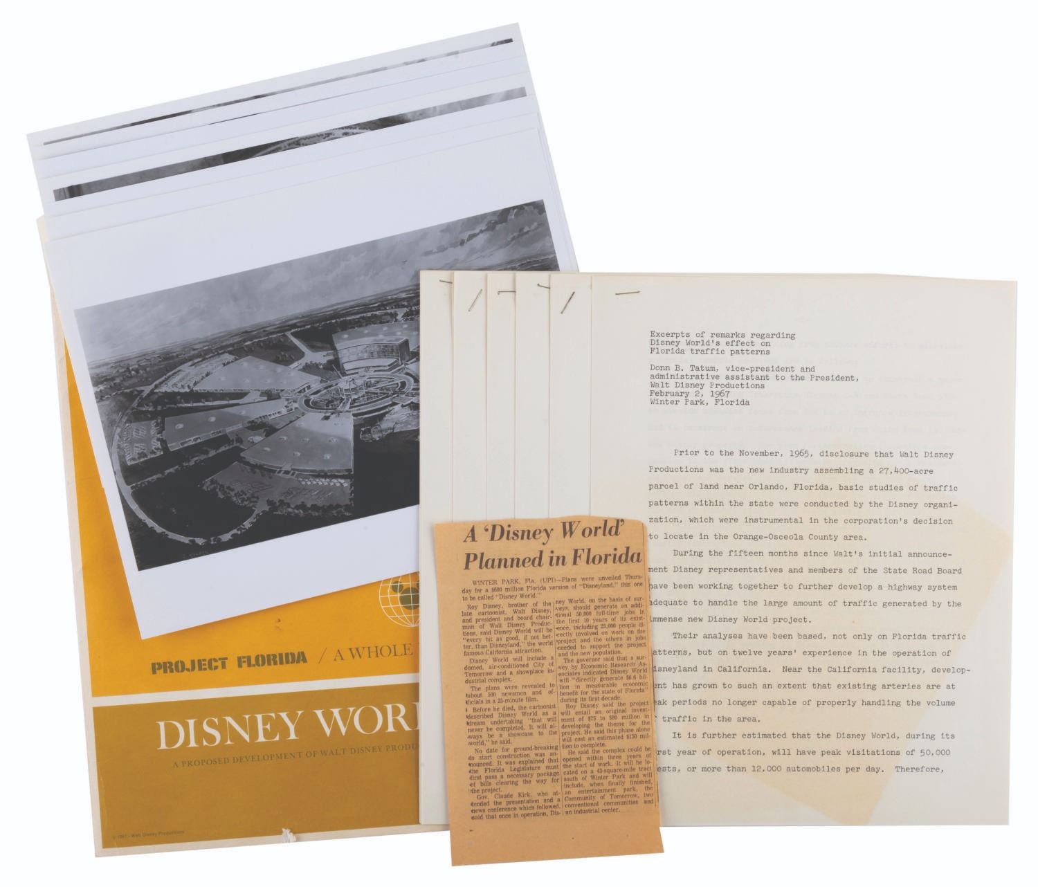 (Walt Disney World, 1967) An early press kit for the development of Walt Disney World. Included are six press release documents covering Florida Traffic Patterns, legislative proposals, remarks from the Florida Governor, EPCOT information, a memo to the press regarding Disney departments involved in the project, notes from the official Park announcement meeting, and a newspaper clipping announcing the new"Disney World." Also included are seven press photos, including Walt with maps of the development and concept art. The reverse of the folder features hand-written notes regarding VPs of the project, Gen. Joe Potter, Joe Fowler, and Jack Sayers. Measuring 9" x 11.5", the kit is in good condition with light edge wear, scratches, smudges, soiling, creases, a small tear to the bottom edge, and discoloration to the interior.