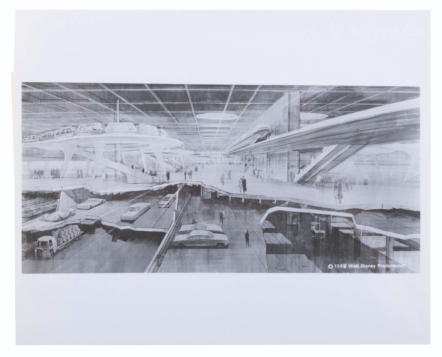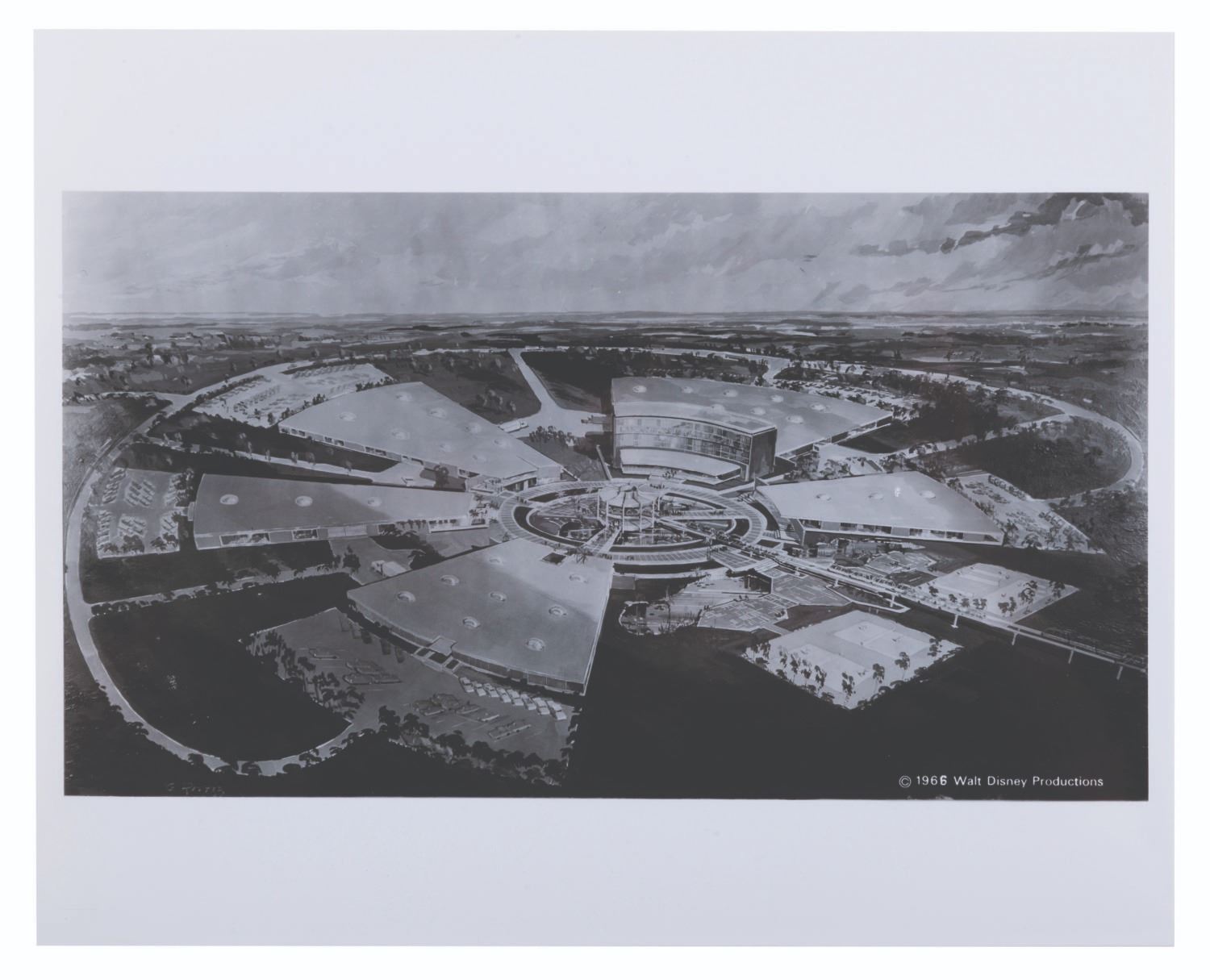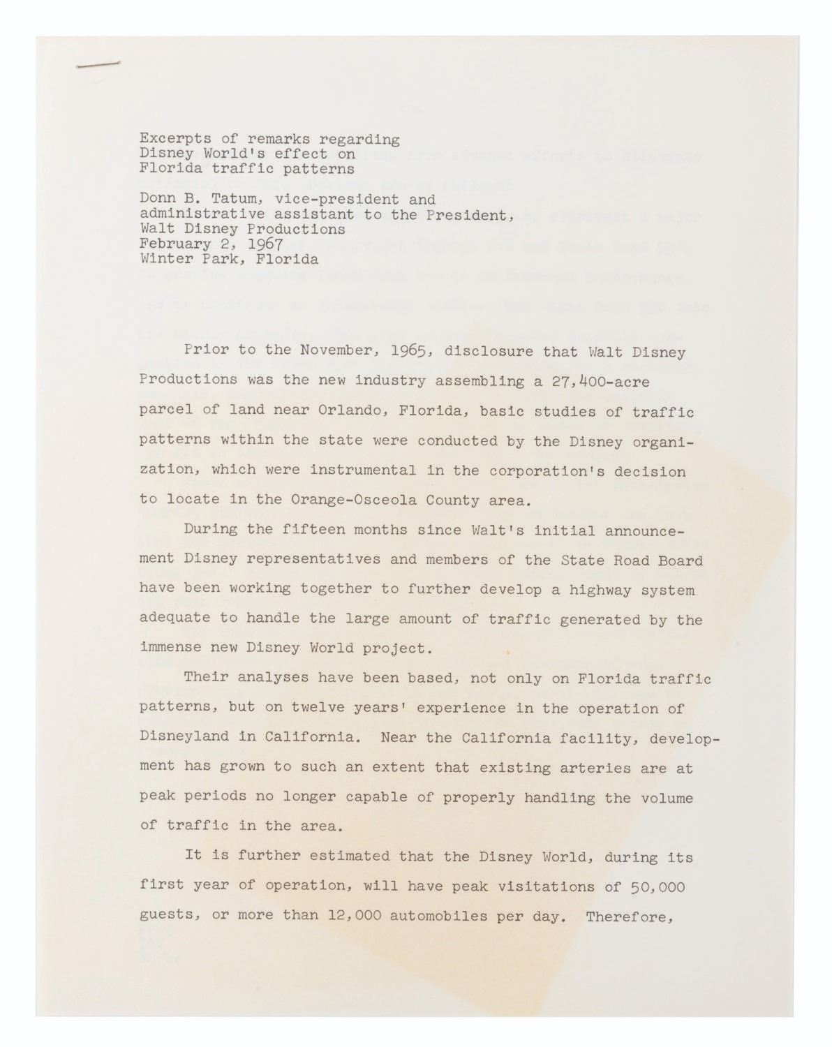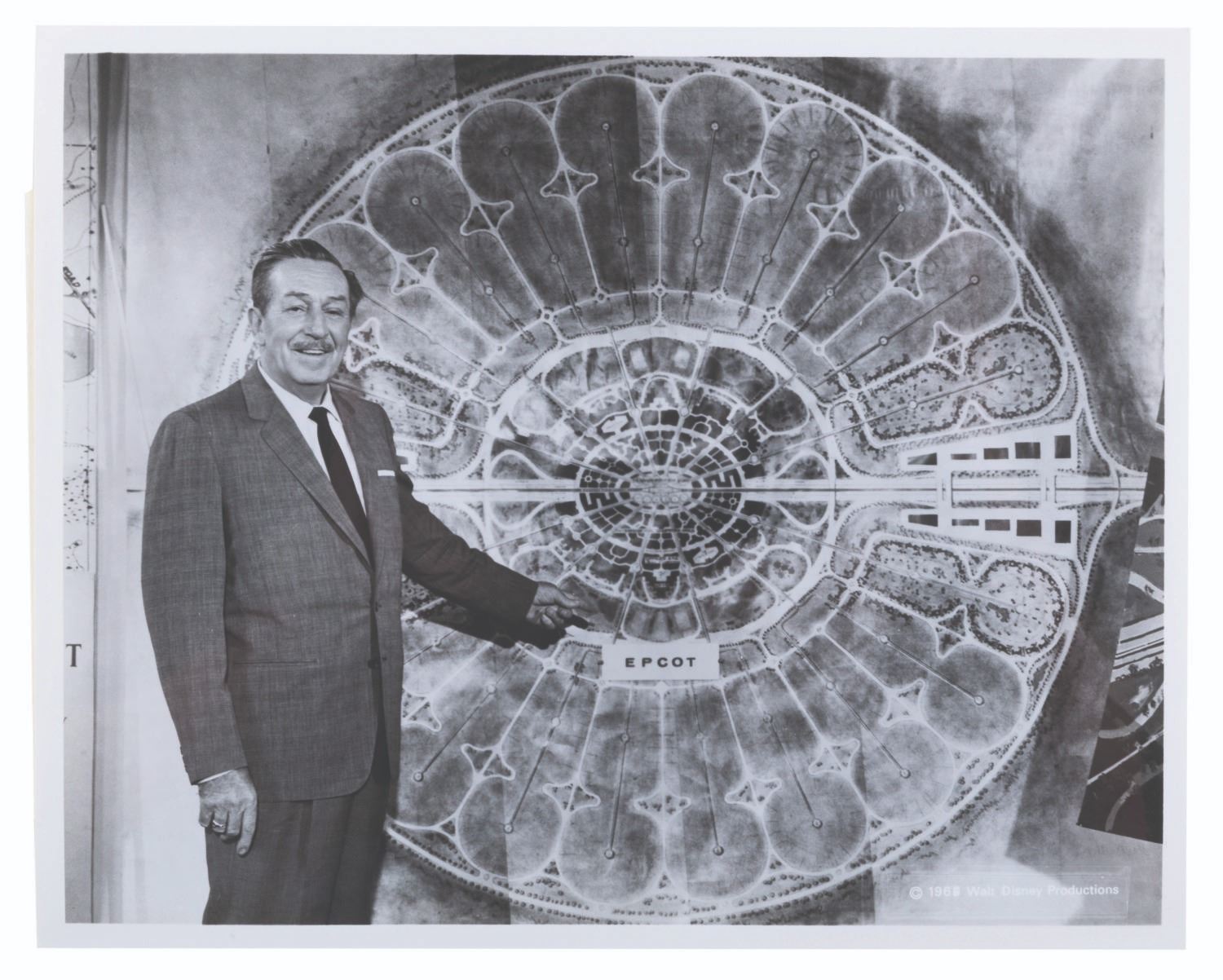 (Walt Disney World, 1967) An early press kit for the development of Walt Disney World. Included are six press release documents covering Florida Traffic Patterns, legislative proposals, remarks from the Florida Governor, EPCOT information, a memo to the press regarding Disney departments involved in the project, notes from the official Park announcement meeting, and a newspaper clipping announcing the new"Disney World." Also included are seven press photos, including Walt with maps of the development and concept art. The reverse of the folder features hand-written notes regarding VPs of the project, Gen. Joe Potter, Joe Fowler, and Jack Sayers. Measuring 9" x 11.5", the kit is in good condition with light edge wear, scratches, smudges, soiling, creases, a small tear to the bottom edge, and discoloration to the interior.