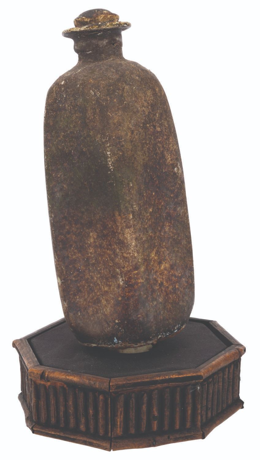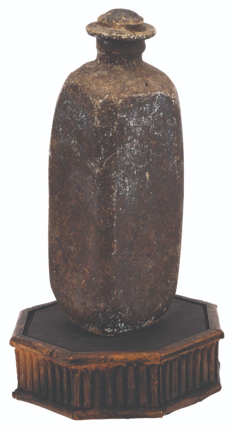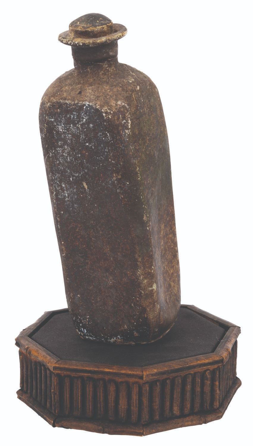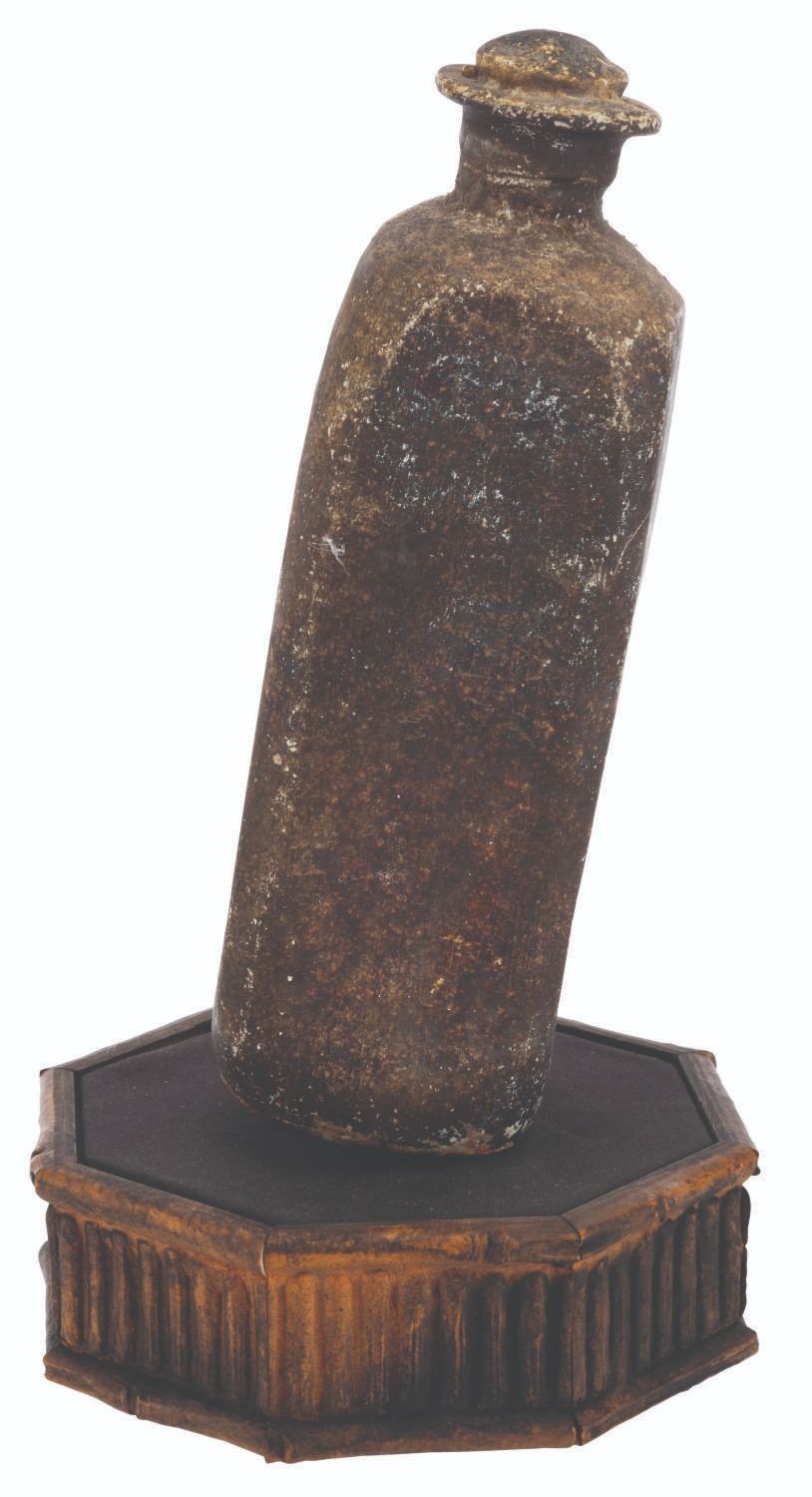 (Disneyland, 1990s) A resin prop bottle from the"Pirates of the Caribbean" attraction at Disneyland. Most likely removed during a renovation, the bottle stands 9" tall and has been mounted to a small wooden stand for presentation. The bottle is in good condition, and is a little loose on its stand, but overall presents itself well.