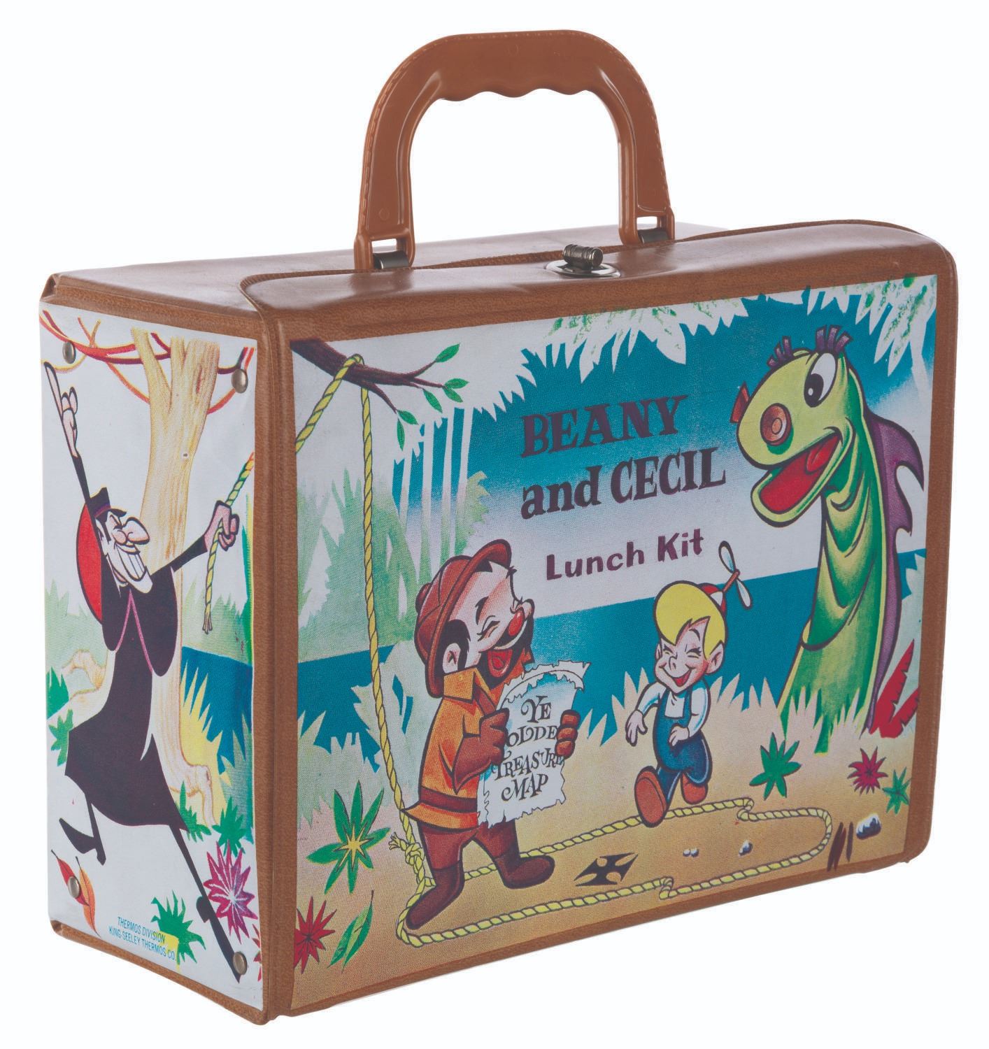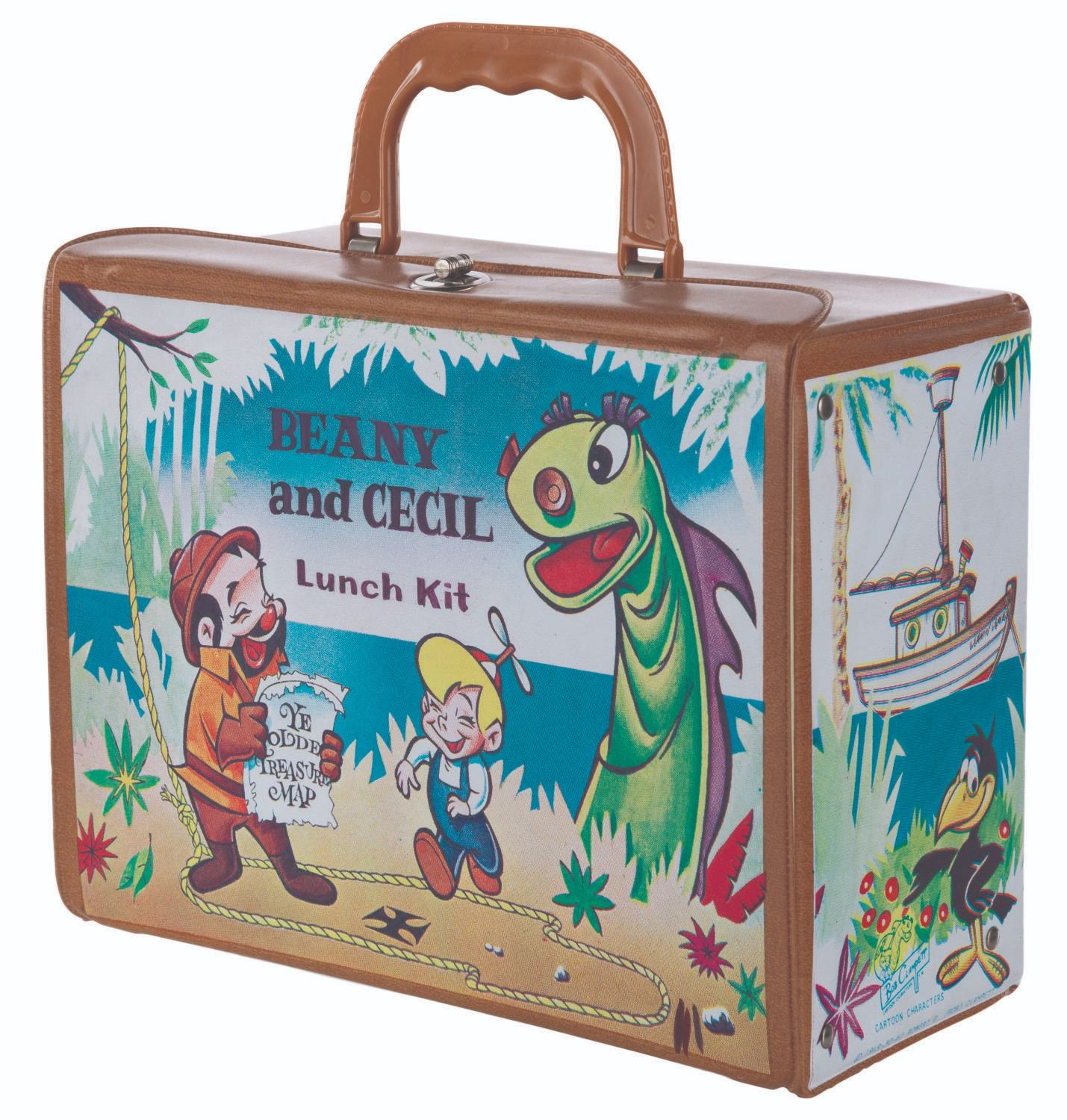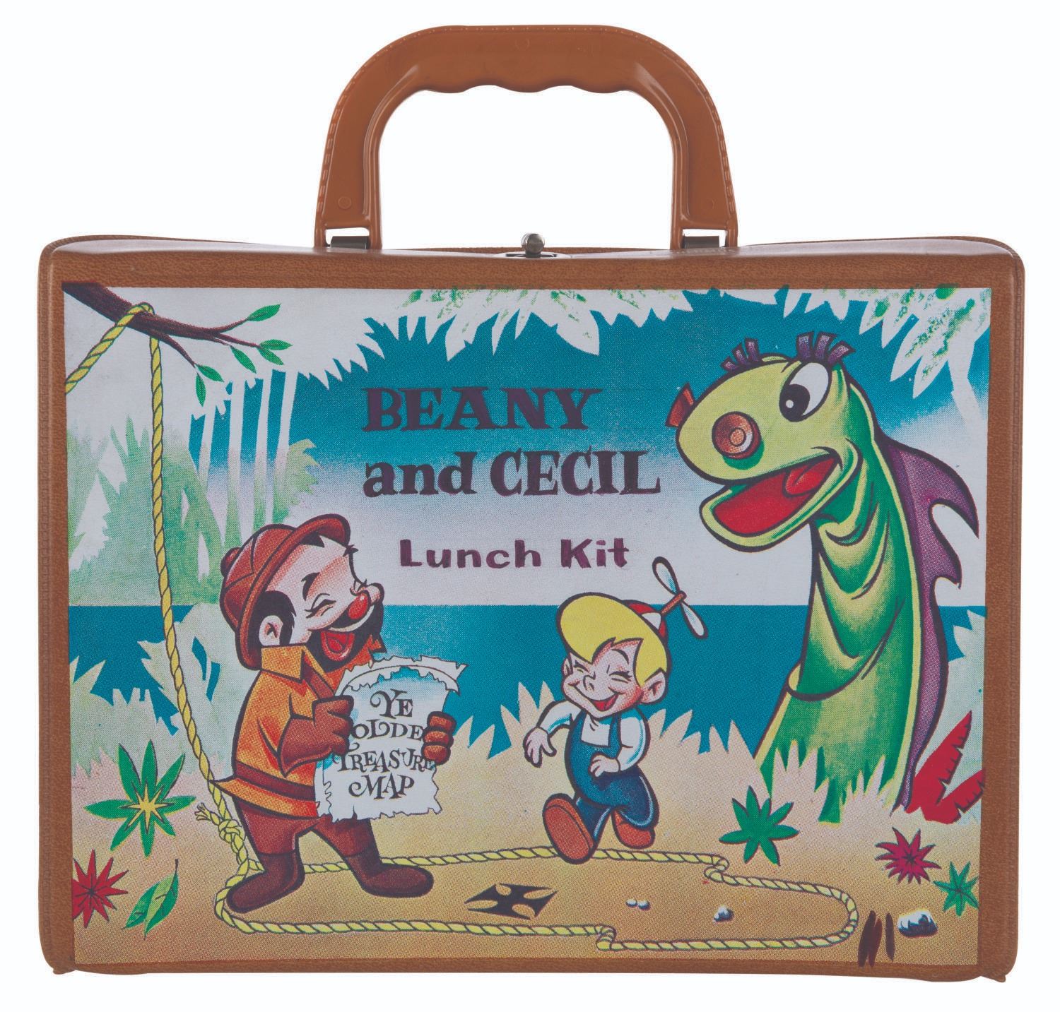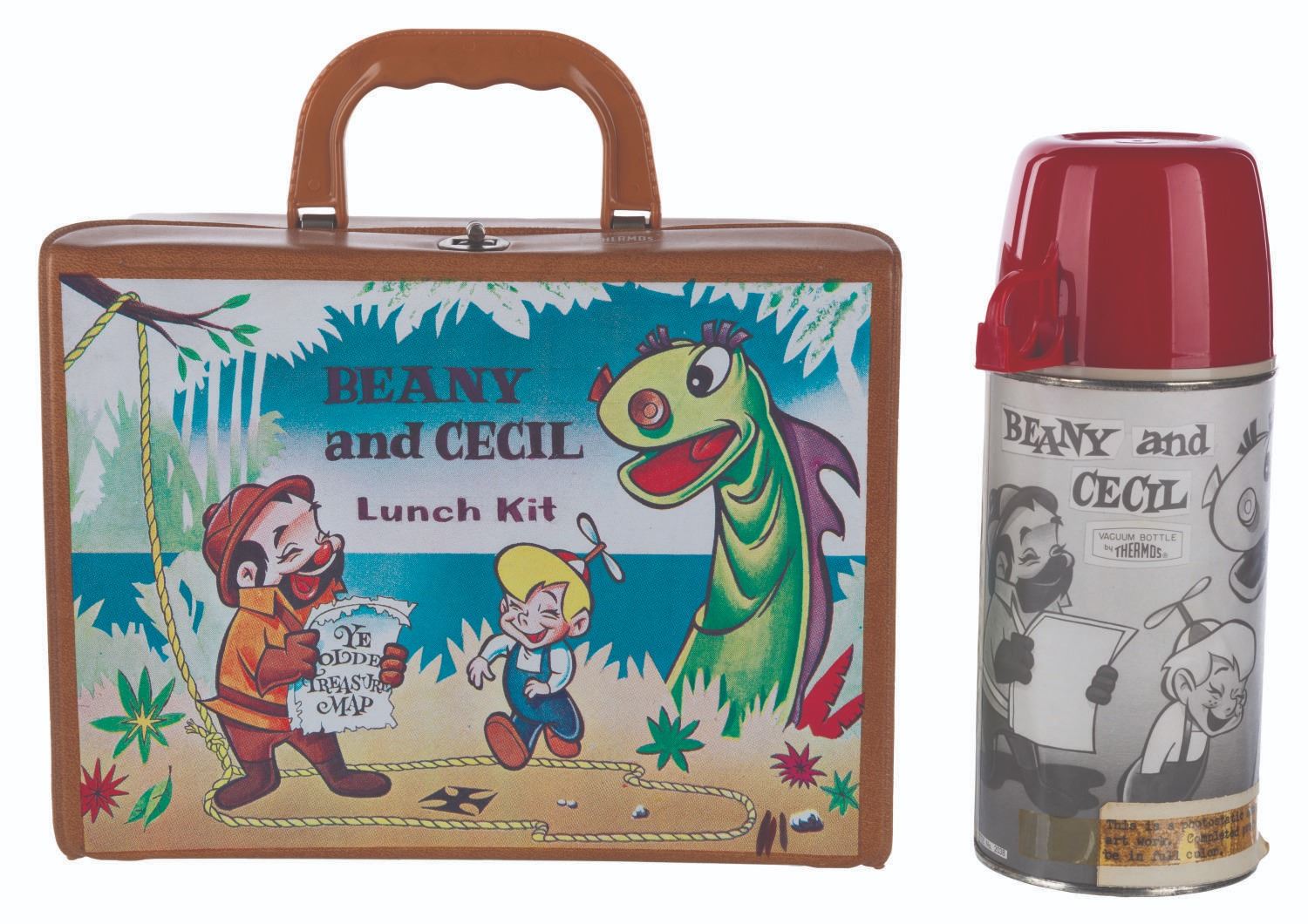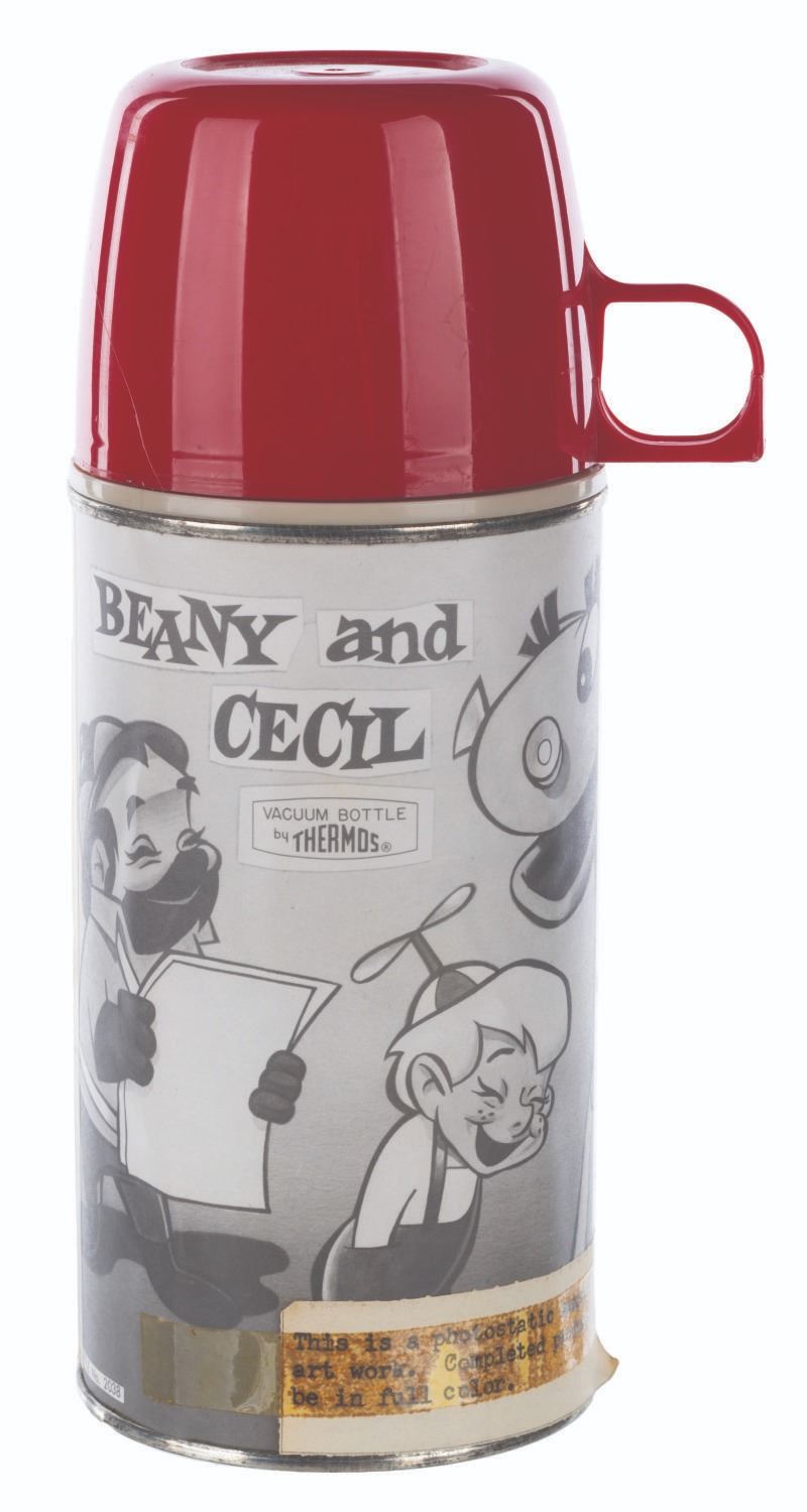 (Thermos, 1960s) A “Beanie and Cecil” lunchbox and prototype Thermos. The Thermos features a wrap-around black and white photostat image of the show's characters and a label stating that the final product will be in full color. The 7” x 9” x 4” deep lunchbox and 8” tall and 3.5” diameter thermos are in fine condition.