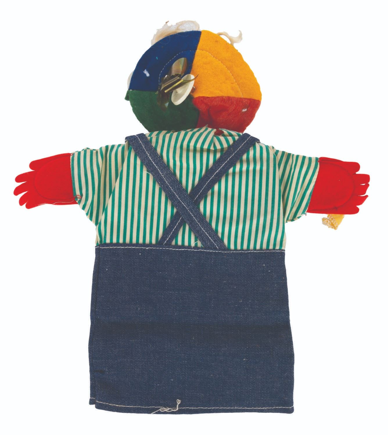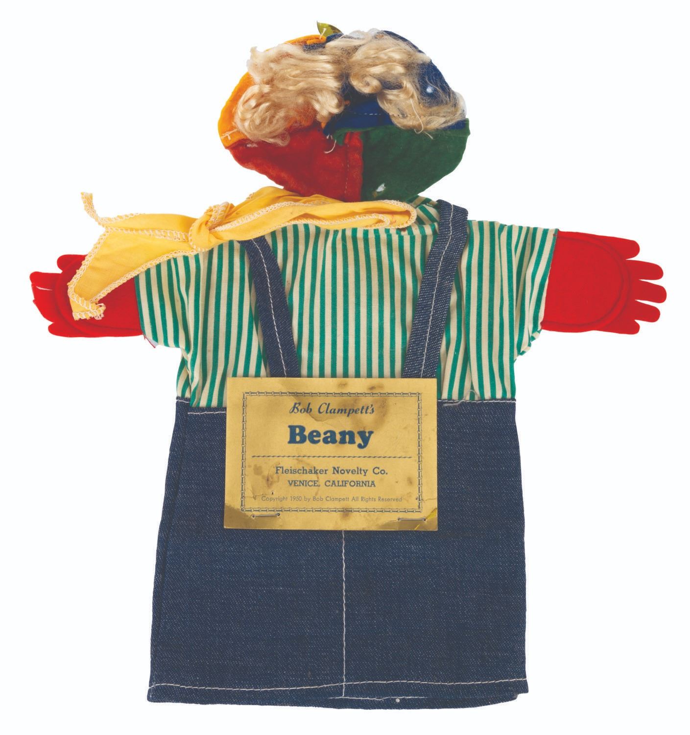 (Fleischaker Novelty Co., 1950) A prototype puppet body for a retail Beany “Time for Beany” hand puppet sent to Bob Clampett for approval. The head was manufactured by a different company, Chemi-plastics. Measuring 8” x 10”, the body is constructed of denim, felt, doll hair, linen, and a plastic propeller, and is in very good, unused condition with two small 0.25” holes in the back of the beany cap and light discoloration from age.