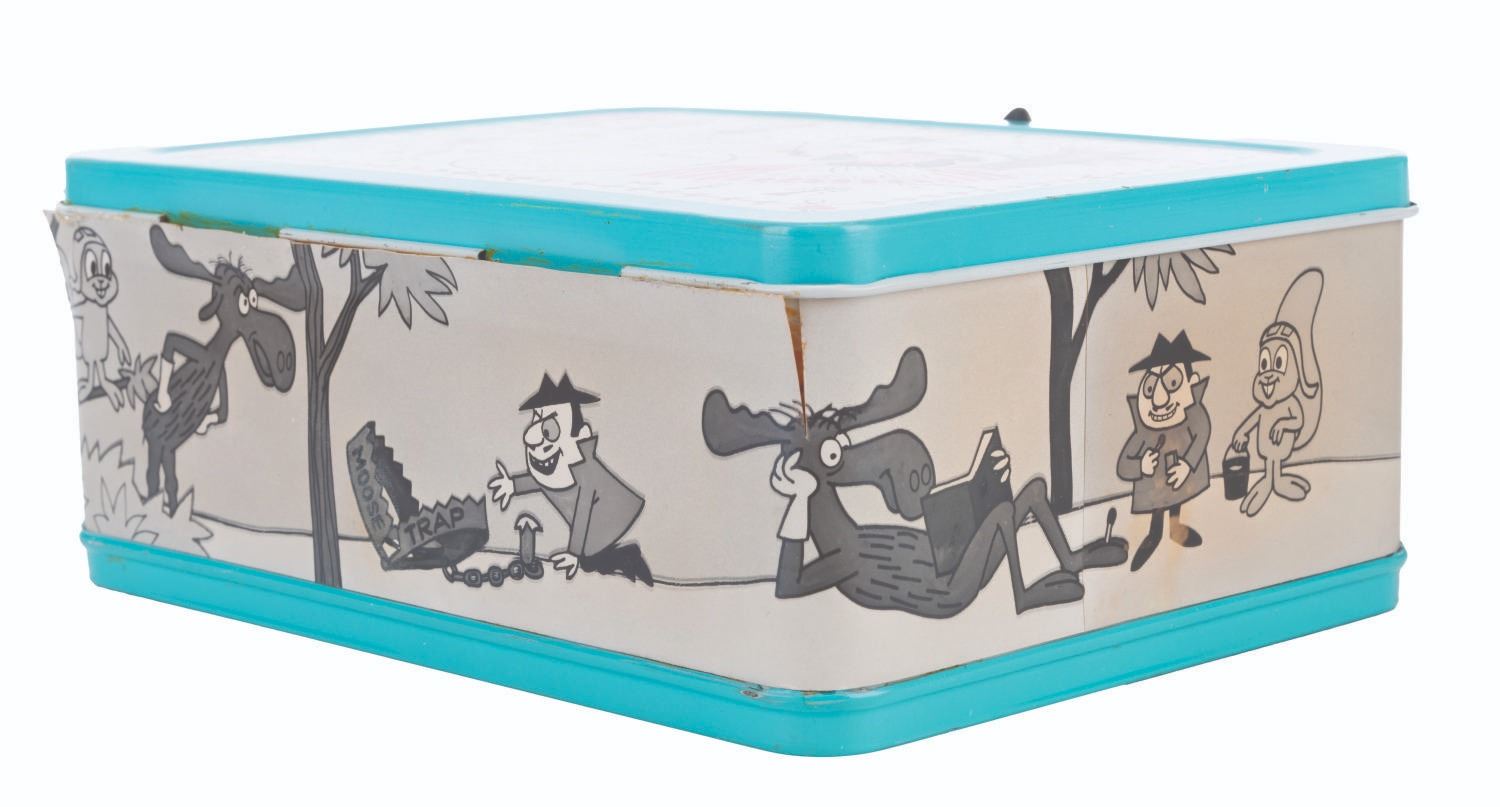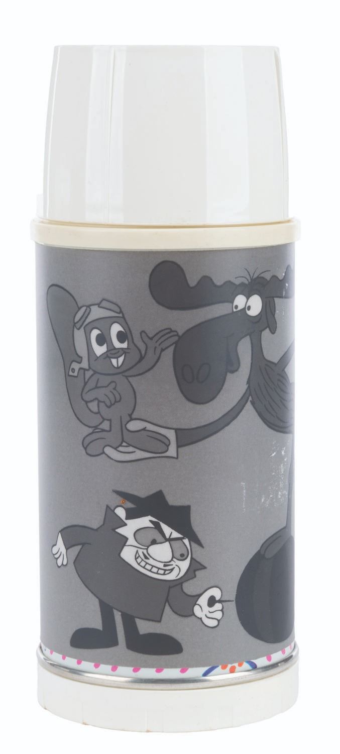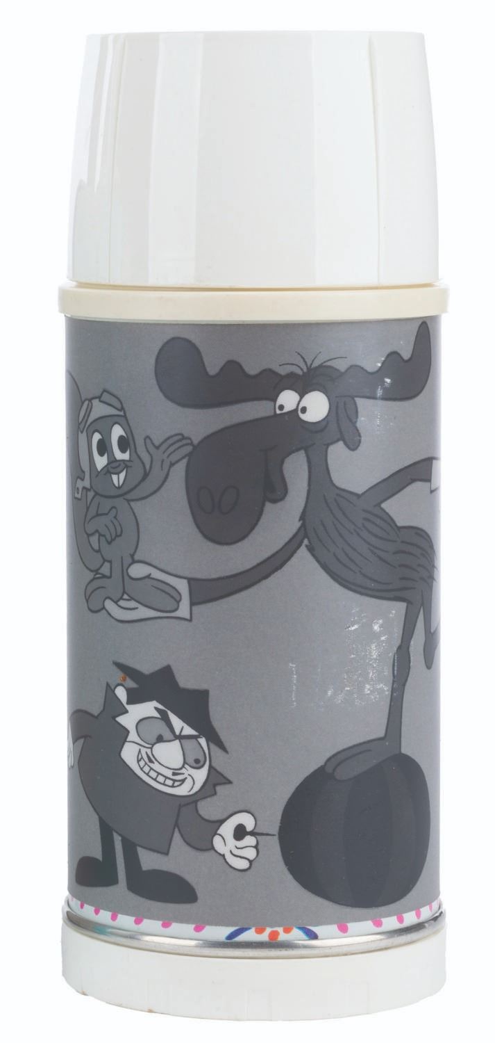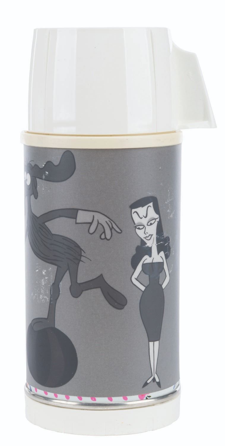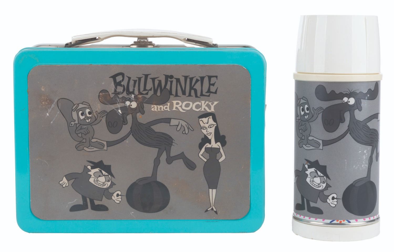 (Universal, 1962) A Bullwinkle and Rocky prototype Thermos and lunchbox manufactured by Universal Vacuum Products. The Thermos features a wrap-around photostat of the show's main characters, while the lunch box has the same photostat on all but one side. This design was produced in color, with the finished products now valuable collectibles. Measuring 8” tall and 3” in diameter and 9” x 3.5” and 7” tall, the Thermos and lunchbox display in good condition with heavy scratches, scuffs, and wear from production use.