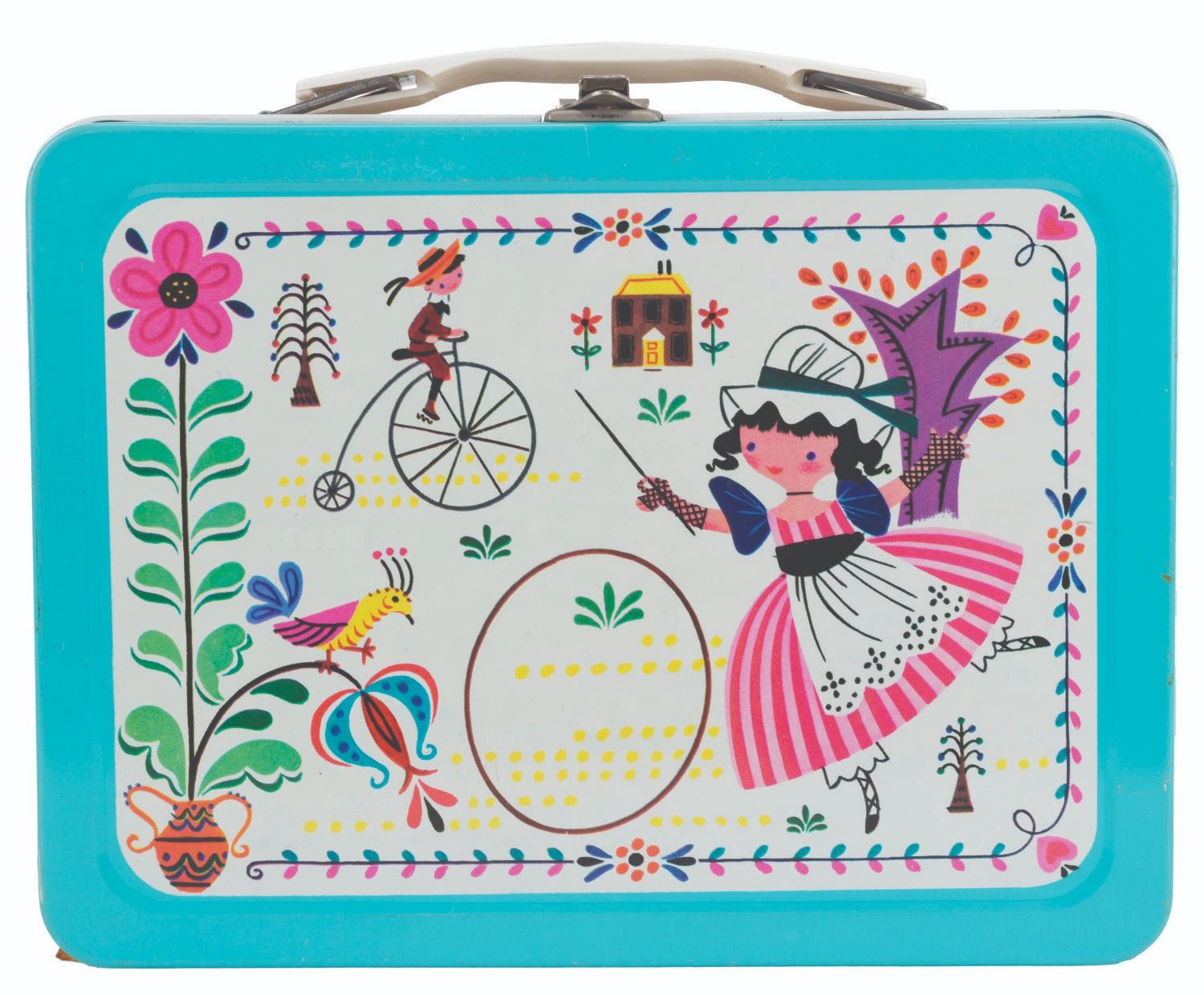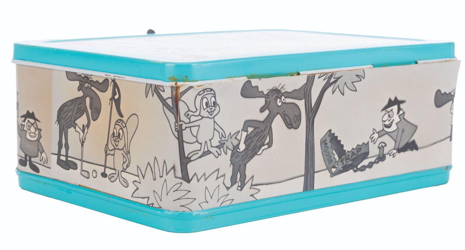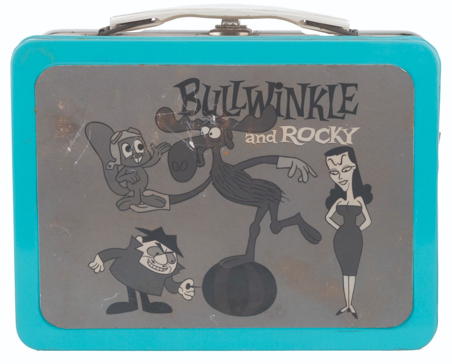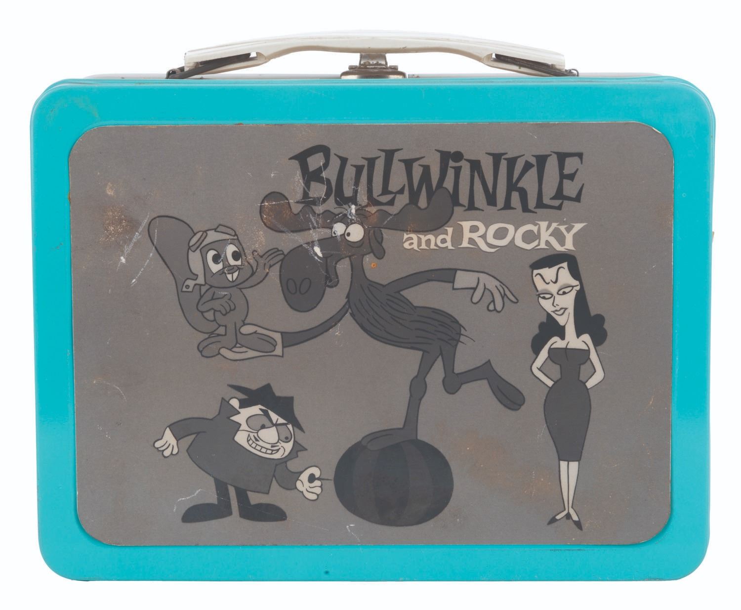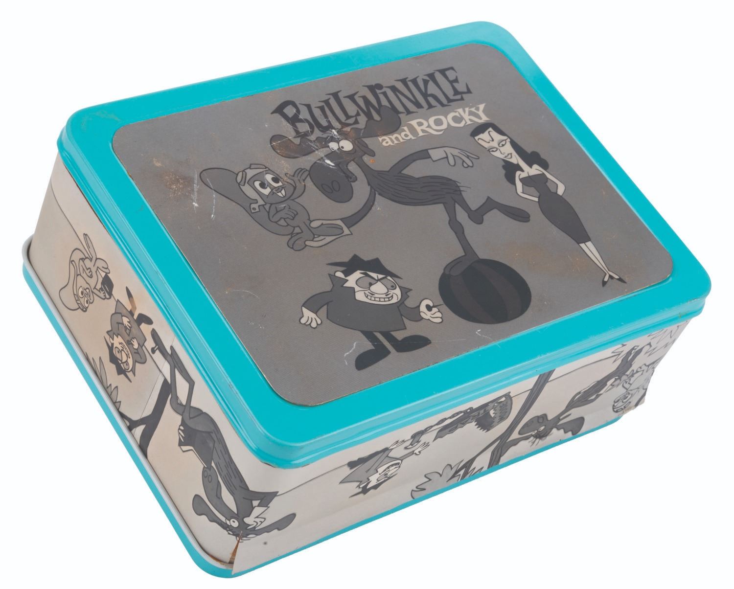 (Universal, 1962) A Bullwinkle and Rocky prototype Thermos and lunchbox manufactured by Universal Vacuum Products. The Thermos features a wrap-around photostat of the show's main characters, while the lunch box has the same photostat on all but one side. This design was produced in color, with the finished products now valuable collectibles. Measuring 8” tall and 3” in diameter and 9” x 3.5” and 7” tall, the Thermos and lunchbox display in good condition with heavy scratches, scuffs, and wear from production use.