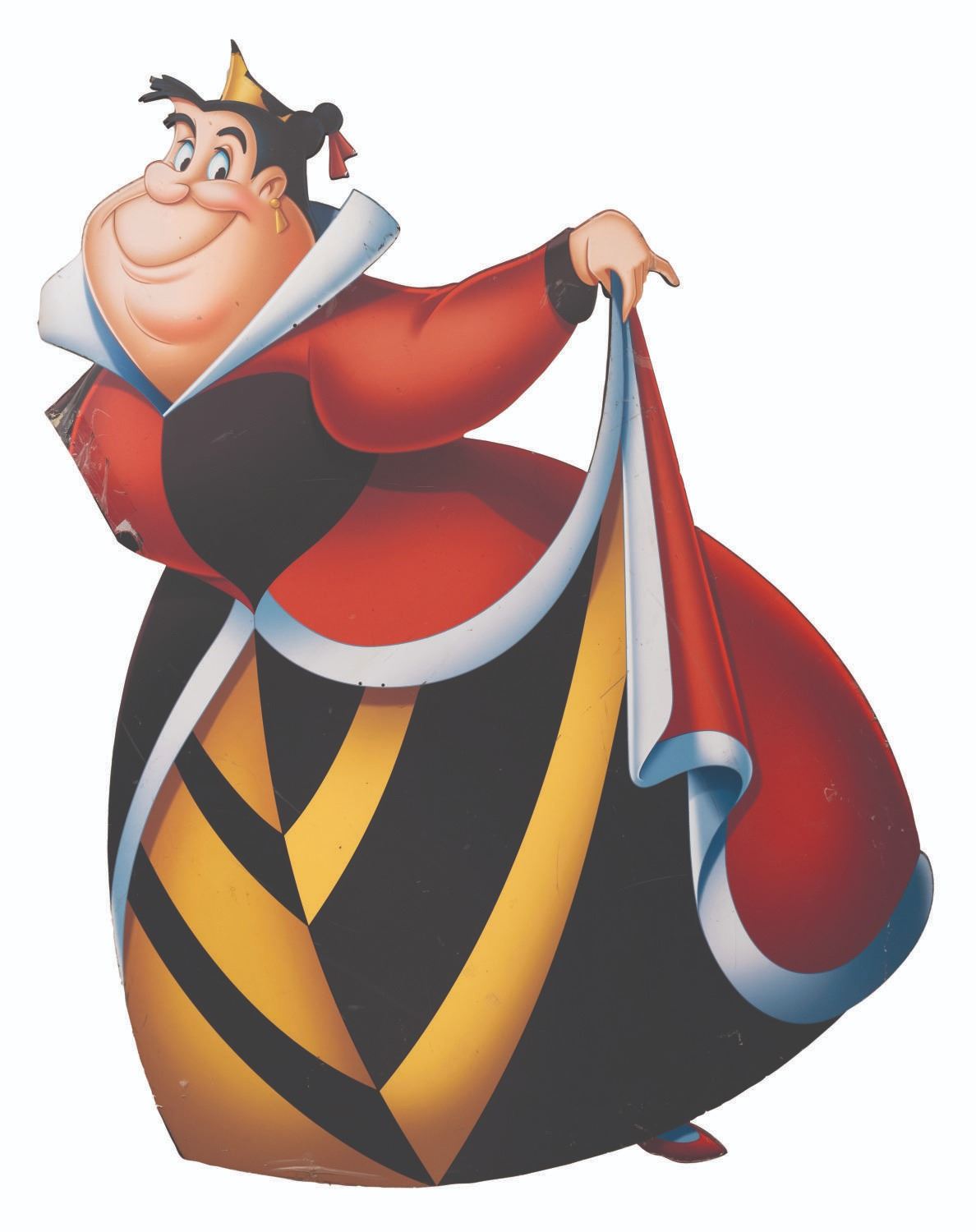 (Disney California Adventure, 2019-2020s) A large display of the Queen of Hearts from "Alice in Wonderland" featured at the Park’s Oogie Boogie Bash. Measuring 62" x 0.5" x 77" tall, the piece displays in fair condition with heavy warping, material loss on the crown, tape, scratches, scuffs, wear from Park use, a missing arm, and intentional holes for display. Due to size and weight, special shipping arrangements are required. Please inquire before bidding.