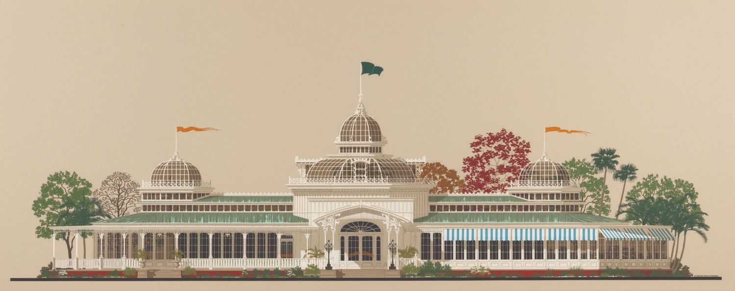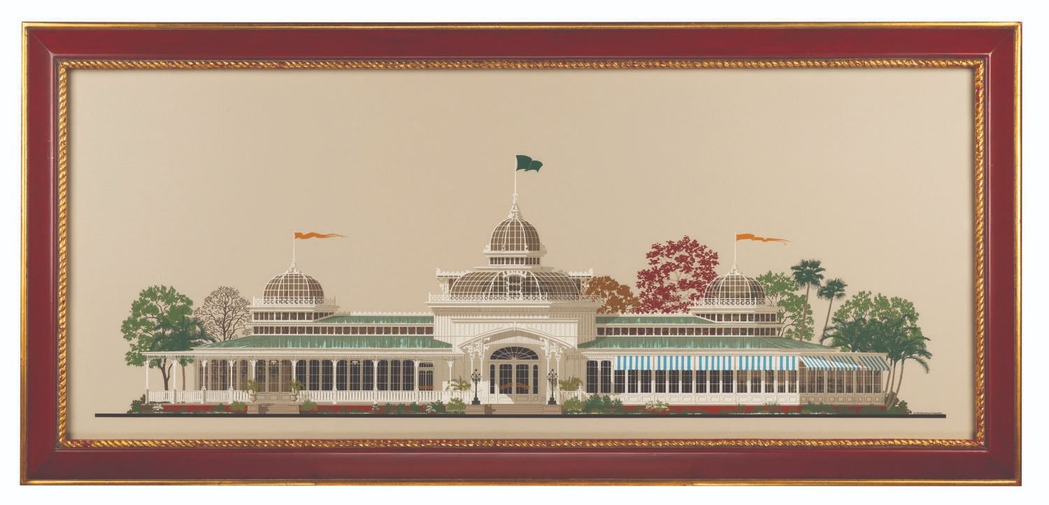 (RETLAW, 1970) An extremely rare large and incredibly detailed hand-silkscreened print depicting the Crystal Palace near the Plaza of Main Street U.S.A. in the Magic Kingdom at Walt Disney World. This colorful conceptual elevation was made exclusively for display at the RETLAW facility and was mainly seen in offices of high-ranking company members. The artwork has an image size of 47.25"x19.25" within its original 24.5"x52.25" RETLAW frame. It is in very good condition exhibiting light wear to its frame and retaining its original RETLAW Enterprises property control label numbered "1490" on the reverse. The artwork comes from the estate of Disney Legend Milt Albright.