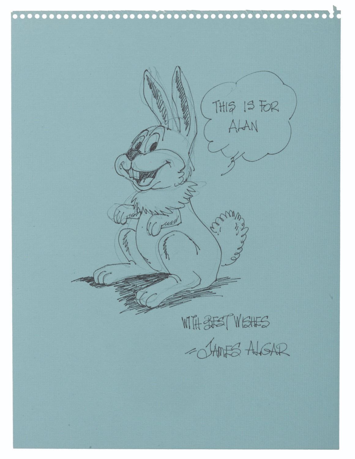 (Algar, 1980s-90s) A black ink rabbit drawing with a personalized dedication by Disney Legend James Algar. With a character image size of 4.75” x 6.5” on a 9” x 12” piece of teal paper, the piece is in fine condition.