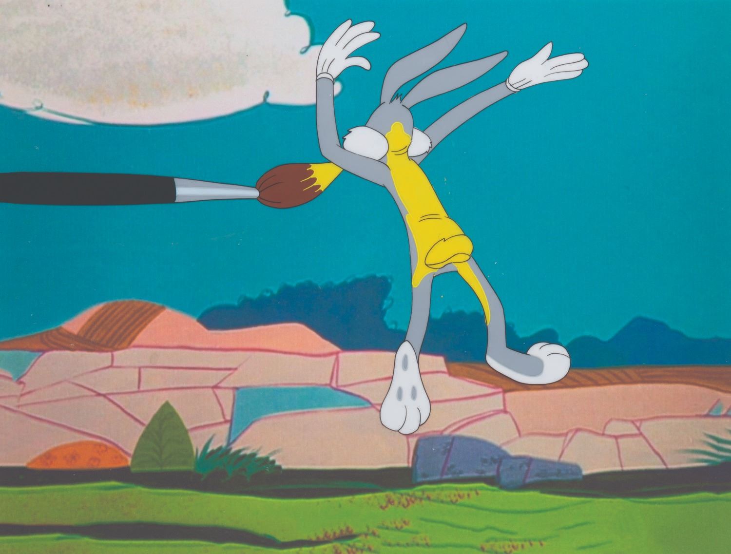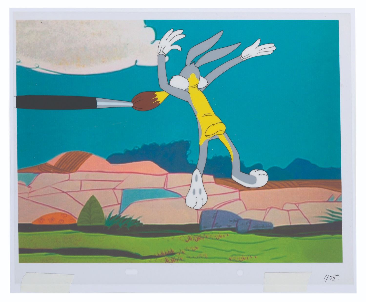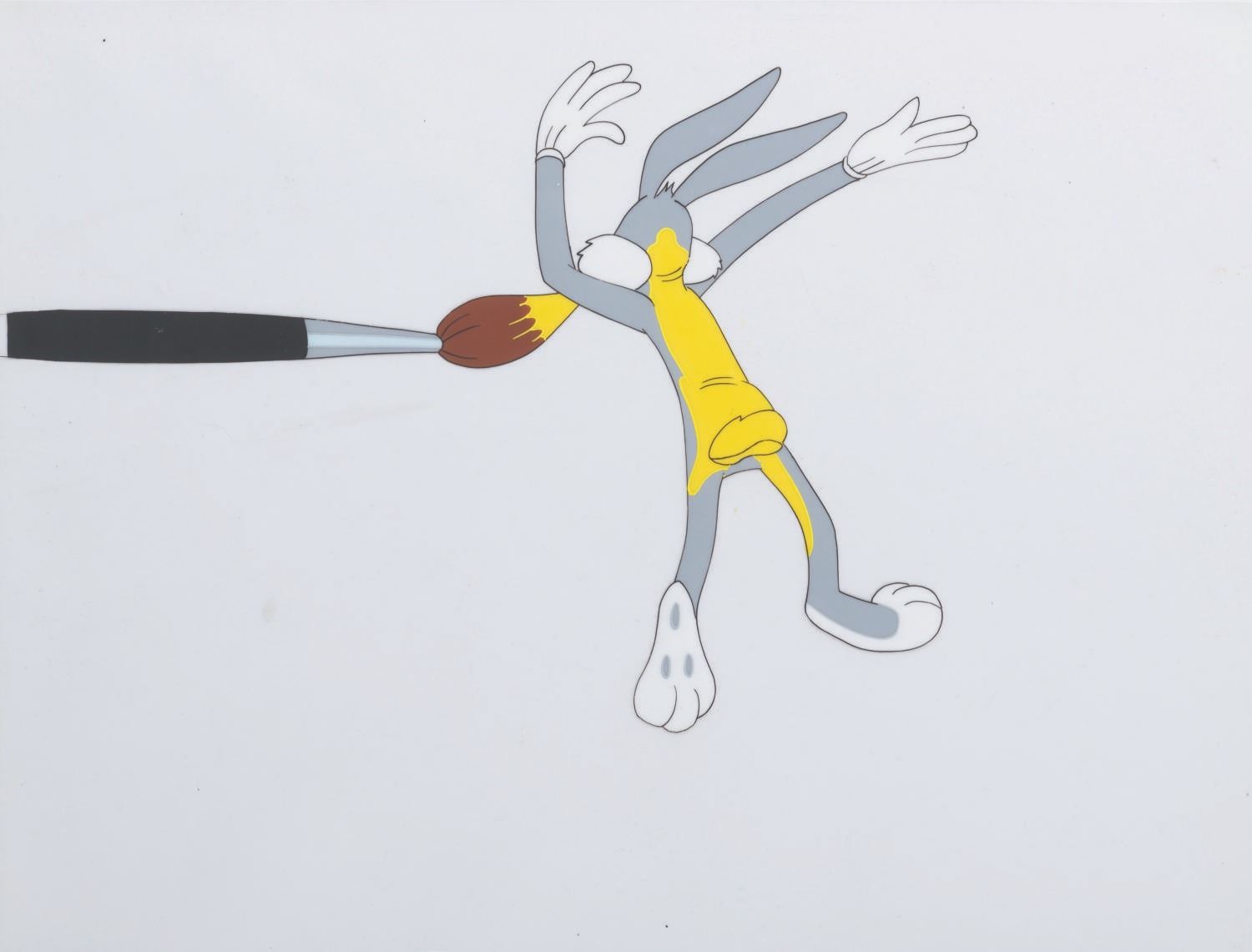 (Warner Bros., 1955) An original production cel of Bugs Bunny from the short"Rabbit Rampage," with a color copy background. Bugs has an image size of 6.75" x 9.5" on a 10.5" x 12.5" cel. The piece is in very good condition, with the paint professionally restored, light scratches, minor curling, and a small stain, which does not affect the image.