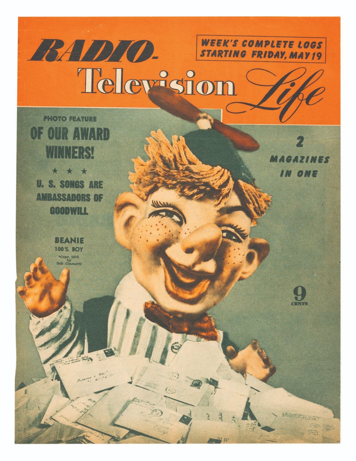 (Radio-Television Life, 1950) A May 19, 1950 Radio-Television Life magazine cover. Featured front and center on the separated cover is “Beanie,” listed as being “100% boy.” Measuring 8.25” x 11”, the cover is in very good condition with staple holes and edge wear from separation.