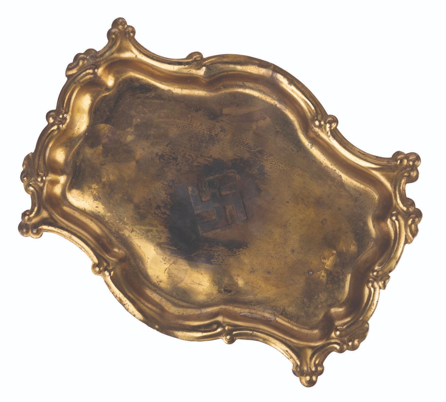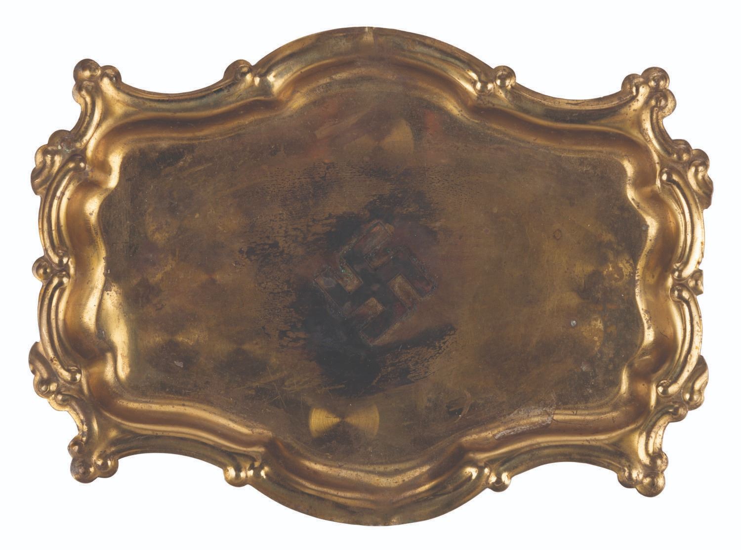 (Paramount, 1981) A prop tray with swastika created for Raiders of the Lost Ark. Made of brass and aged to appear antique, this prop was part of the Nazi treasure chest. Measuring 6"x8.25"x.5", the piece is in very good condition with intentional aging.