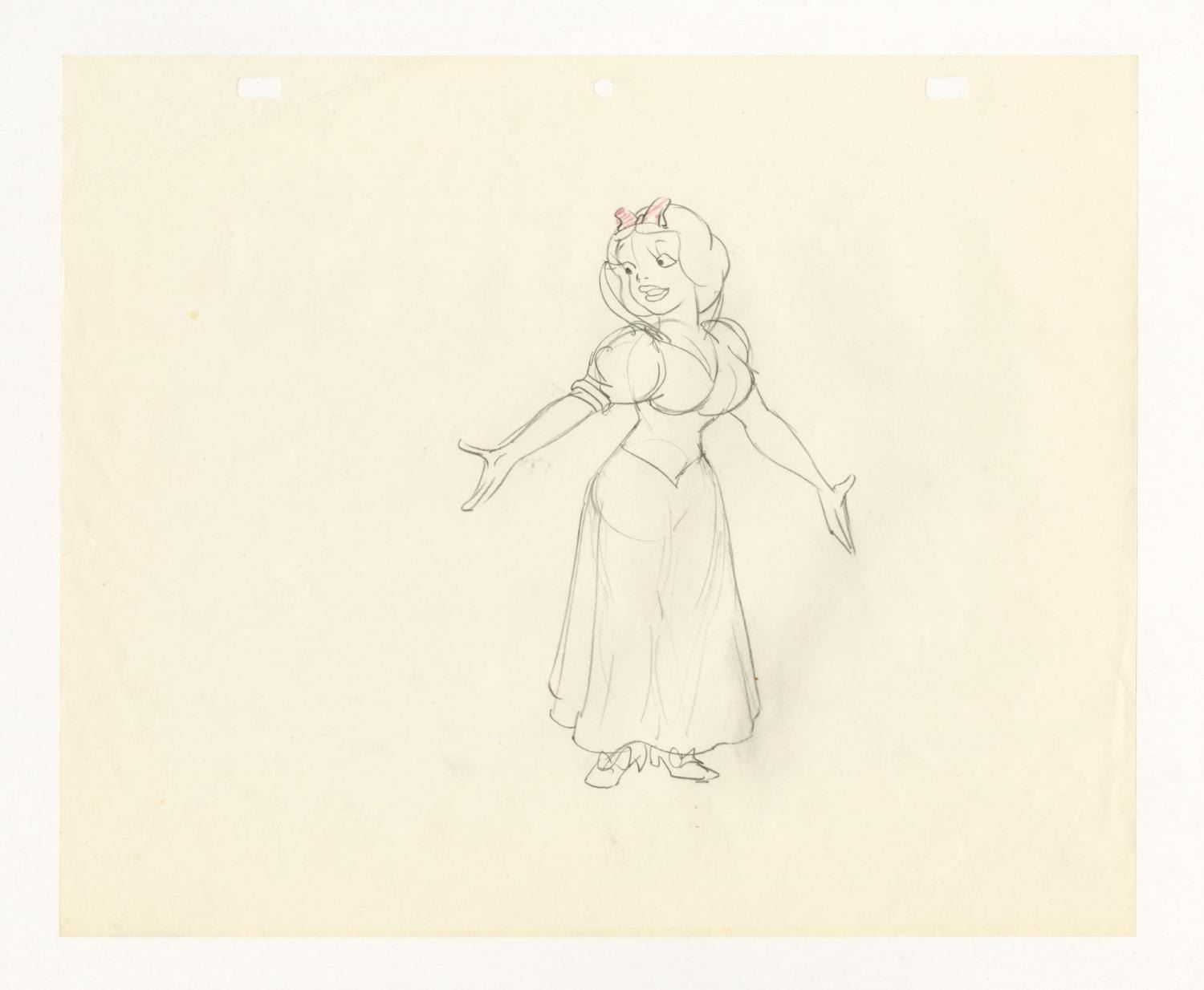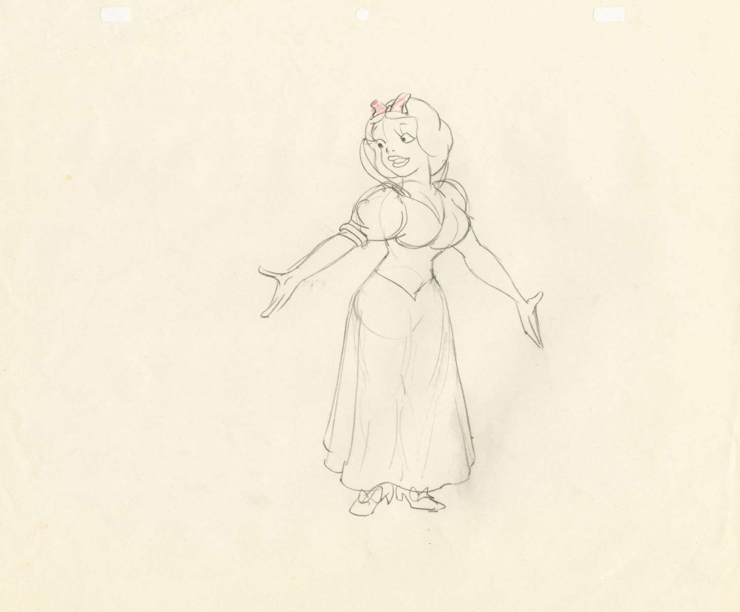 (Bakshi, 1970s-80s) An original development drawing of a woman with a striking resemblance to the Walt Disney Studios Princess Snow White from a 1970s or 1980s Ralph Bakshi production. The character has an image size of 7” x 4.5” on 10.5” x 12.5” animation paper. The graphite drawing is in very good condition with light edge wear, including a fold to the top left corner.