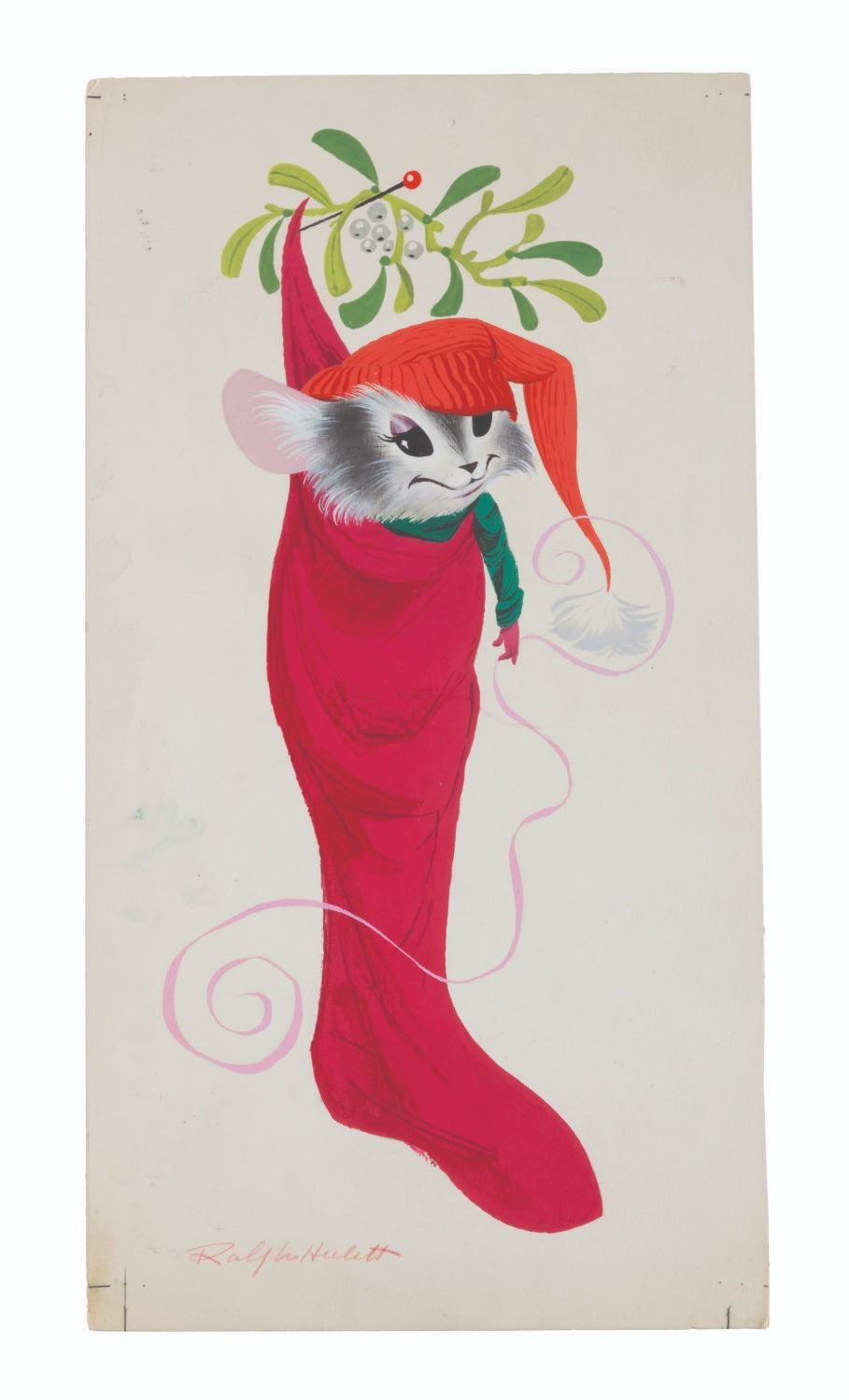(California Artists Inc., 1950s-60s) A Christmas card painting by Ralph Hulett, commissioned by California Artists Inc. Measuring 8.25" x 15.5", the gouache art on artist's board is signed by Hulett and is in good condition with pinholes at the corners, spots of water contact, scratches, spots of discoloration, and edge wear, with the board unevenly cut down the right side.