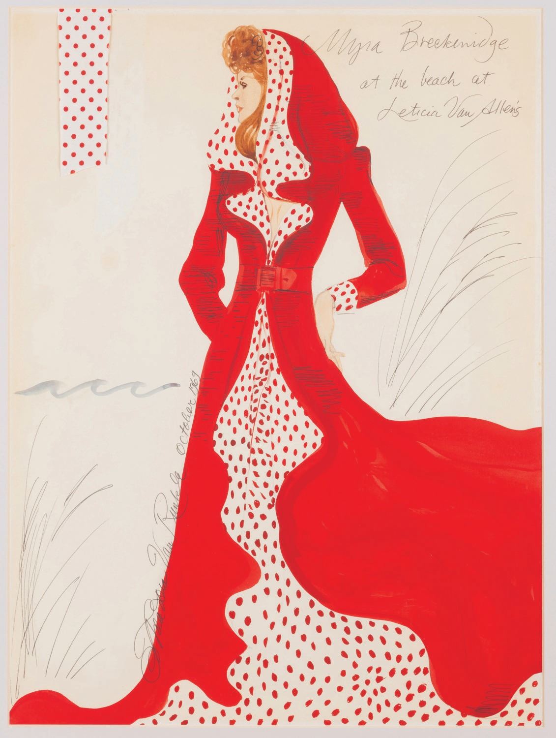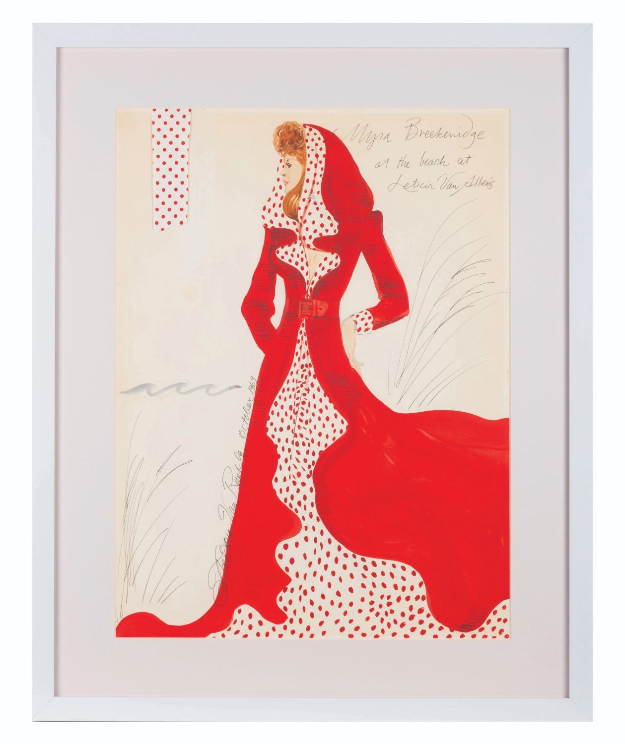 (20th Century Fox, 1970) A costume design for Raquel Welch in “Myra Breckinridge.” The stunning red coat with white trim and polka dots was designed by Theadora Van Runkle, who has signed and dated the sketch “October 1969.” Measuring 14.75” x 19.75” on a 19.75” x 24.75” matte with a 1.5” x 4.75” fabric swatch sample included, this art from the controversial film displays in very good condition with light scratches, scuffs, and stains.