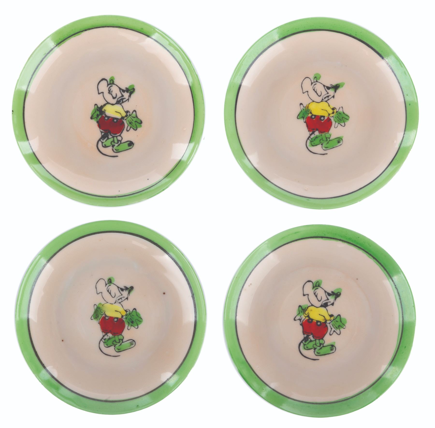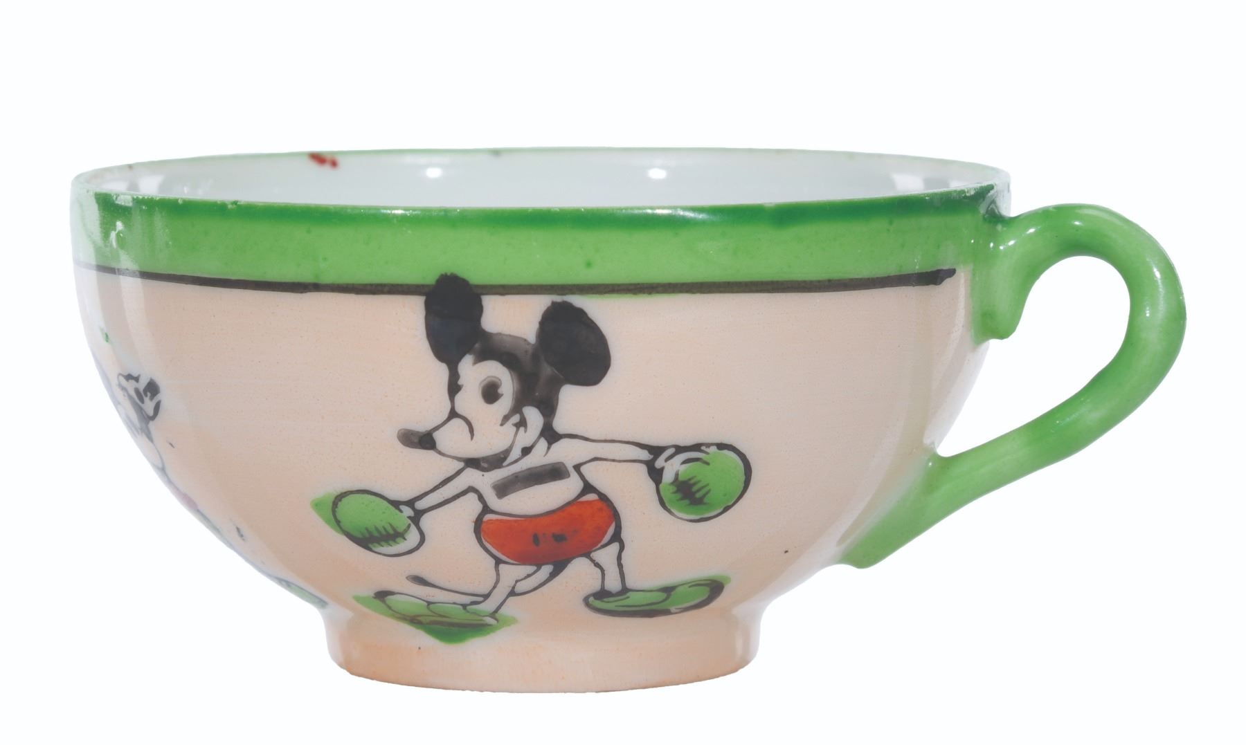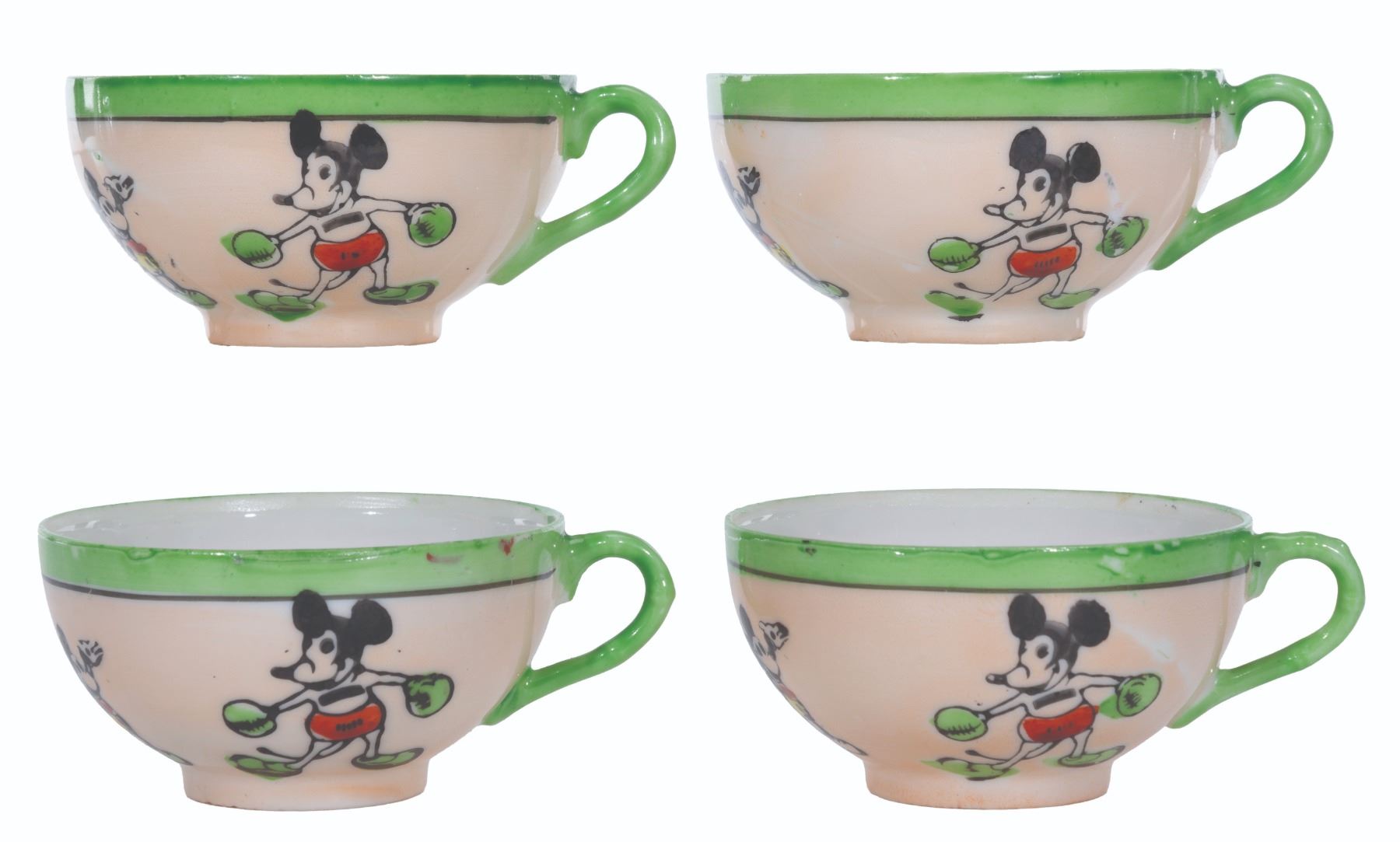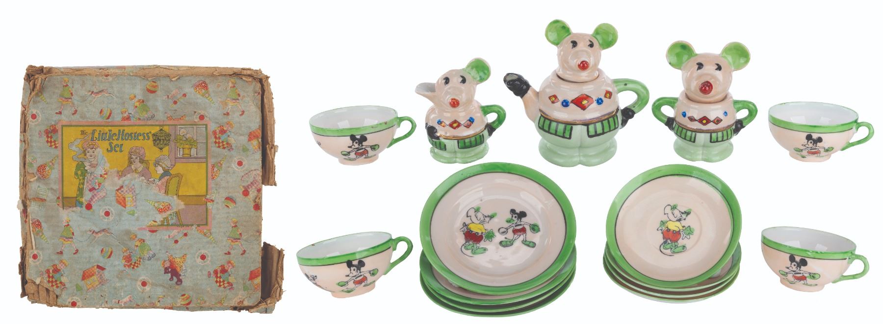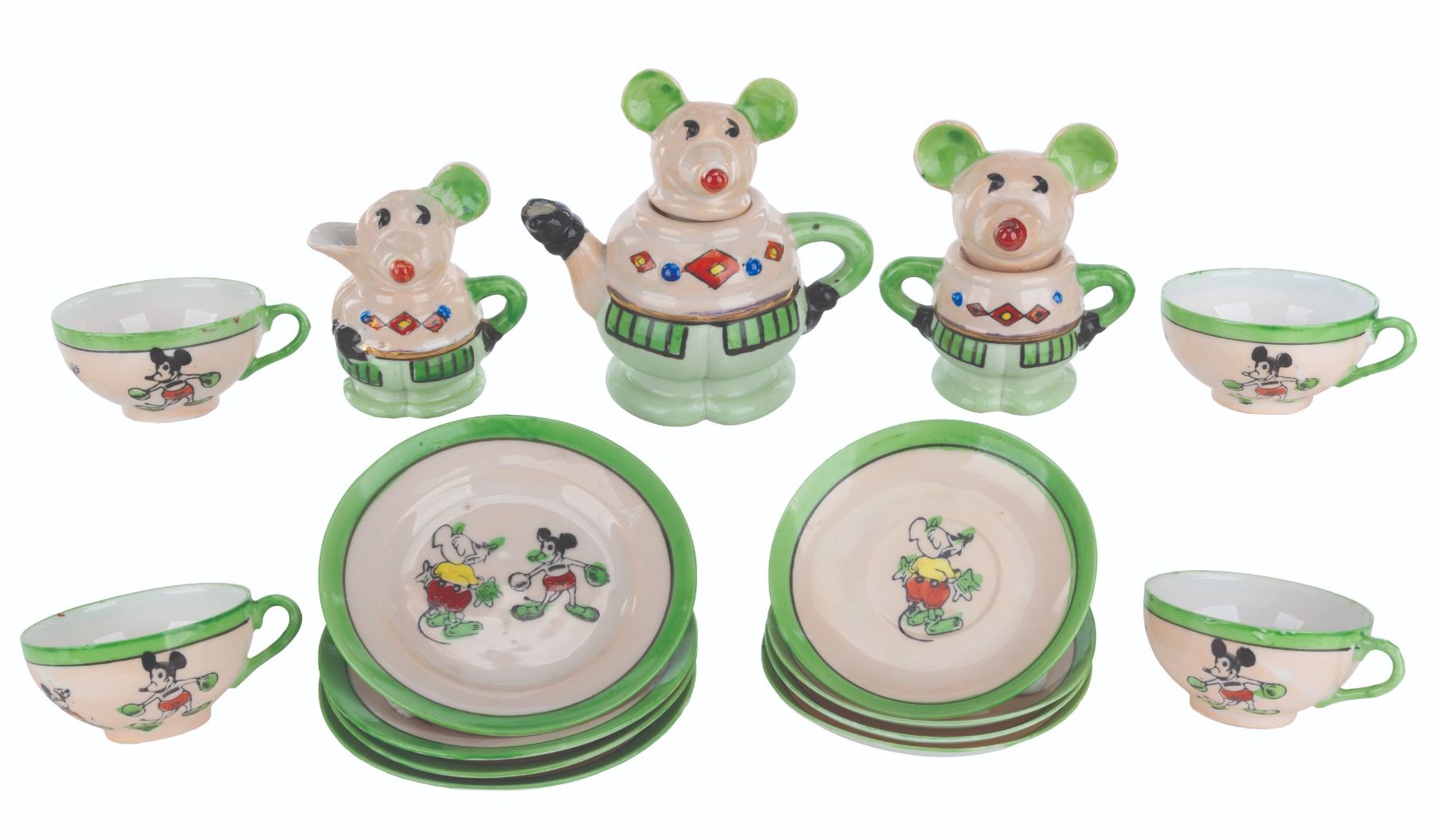 (Borgfeldt, 1930s) A rare Mickey Mouse porcelain serving set by Borgfeldt, the first major distributor of Disney merchandise. Included in the 15-item set are a teapot, a creamer, a sugar bowl, 4 teacups, 4 saucers, and 4 small plates. Ranging in size from the 3” in diameter teacups to the 5” x 5” teapot, the collection is in good to very good condition with scuffs, stains, pinholes, chips, wear, and paint loss.