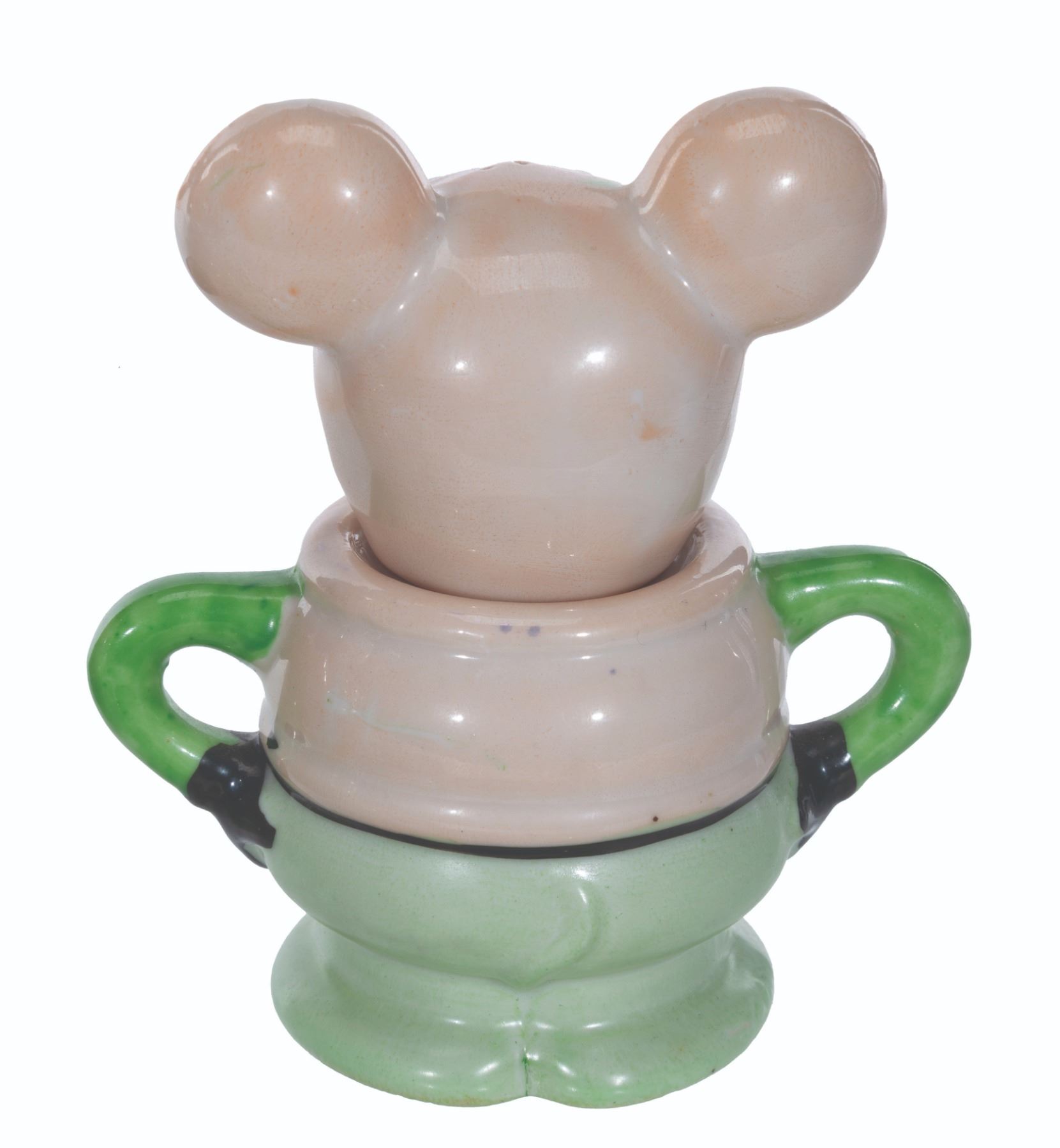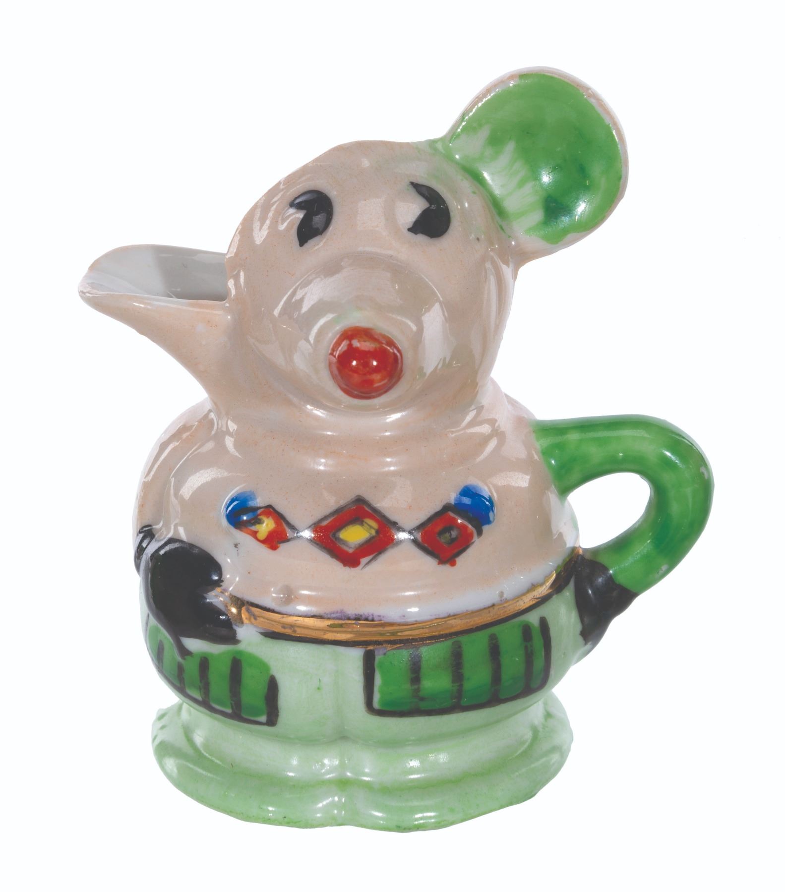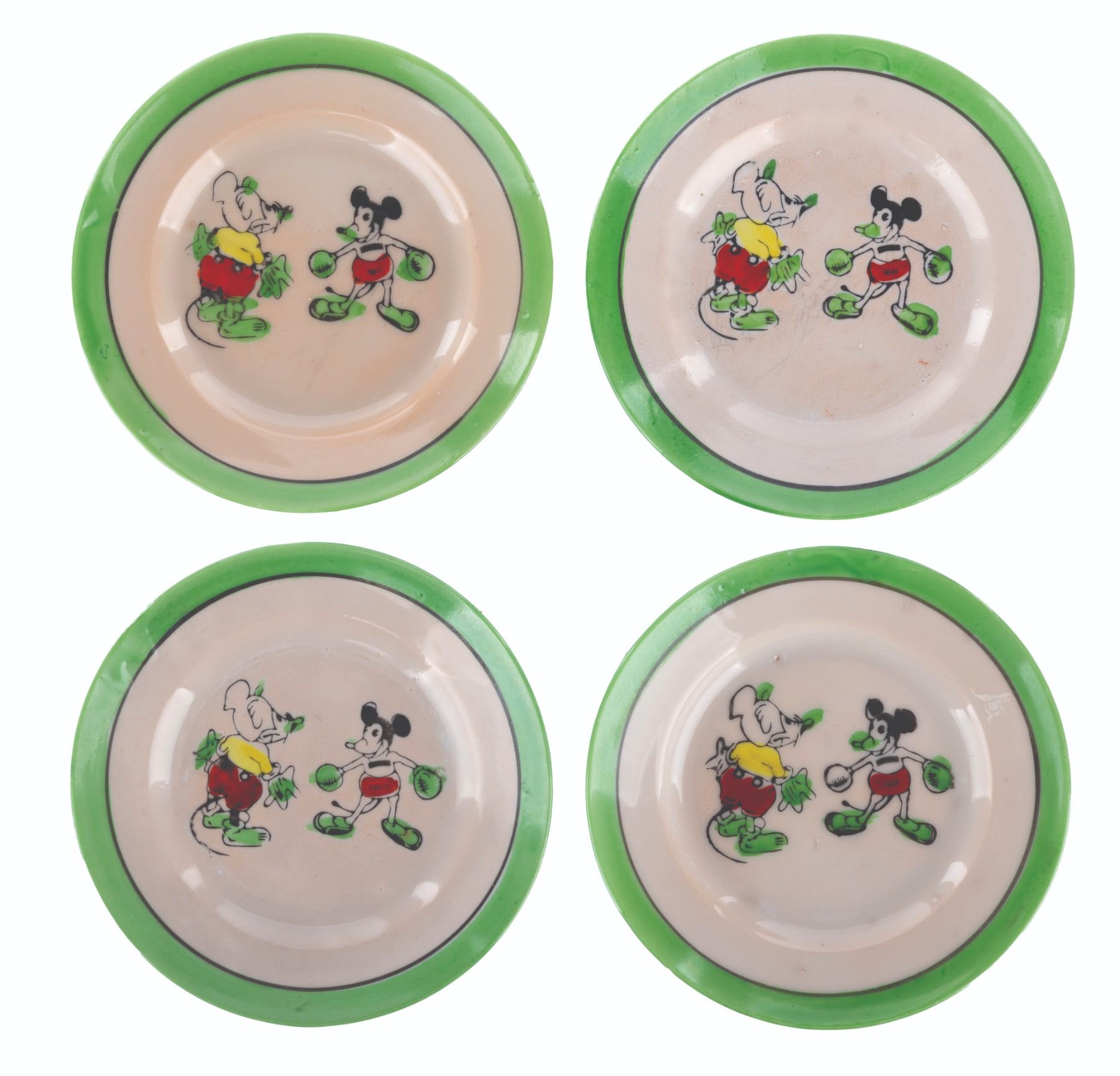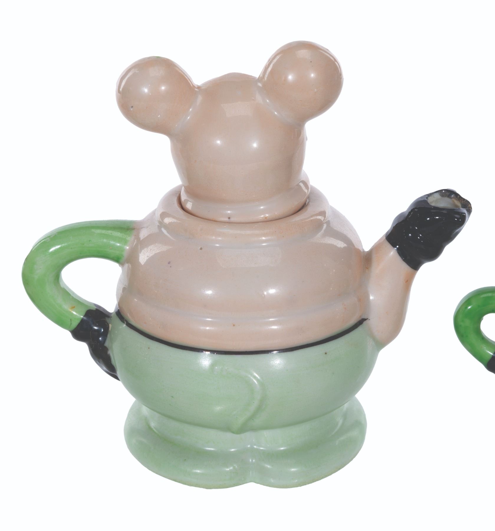 (Borgfeldt, 1930s) A rare Mickey Mouse porcelain serving set by Borgfeldt, the first major distributor of Disney merchandise. Included in the 15-item set are a teapot, a creamer, a sugar bowl, 4 teacups, 4 saucers, and 4 small plates. Ranging in size from the 3” in diameter teacups to the 5” x 5” teapot, the collection is in good to very good condition with scuffs, stains, pinholes, chips, wear, and paint loss.