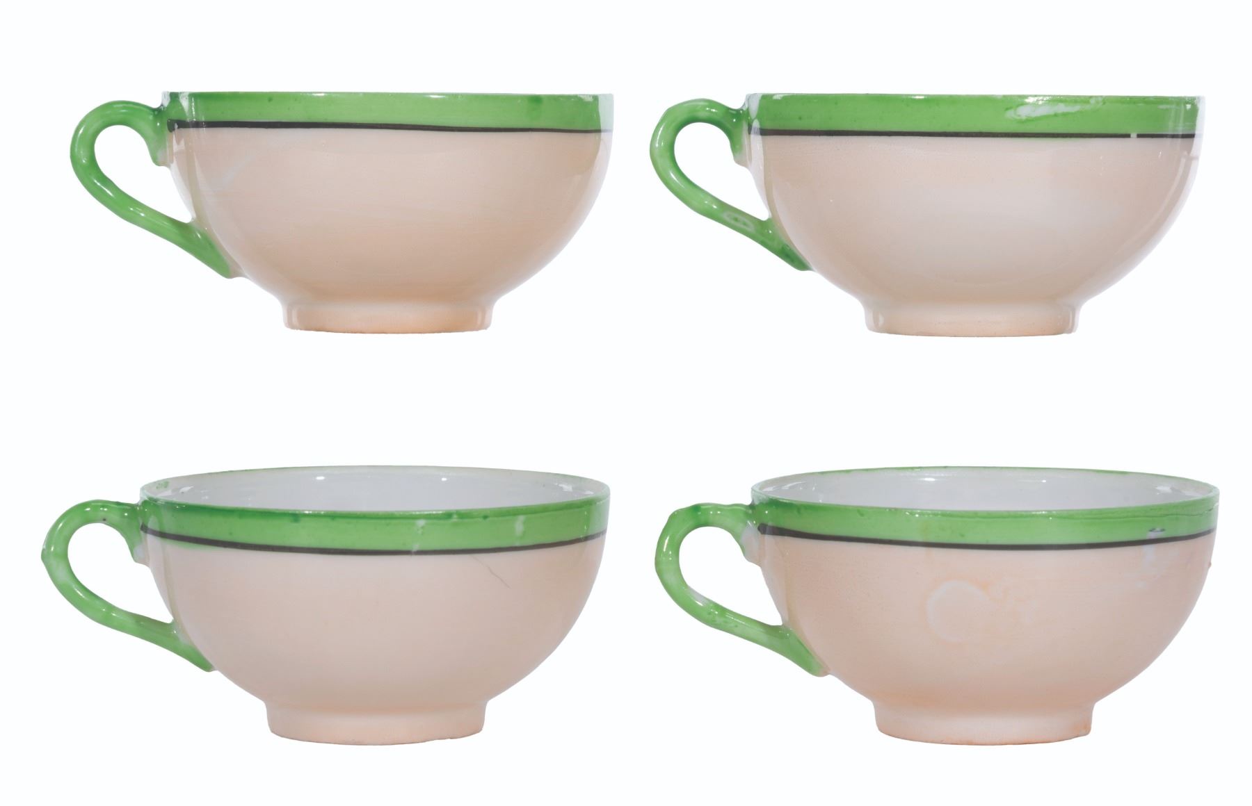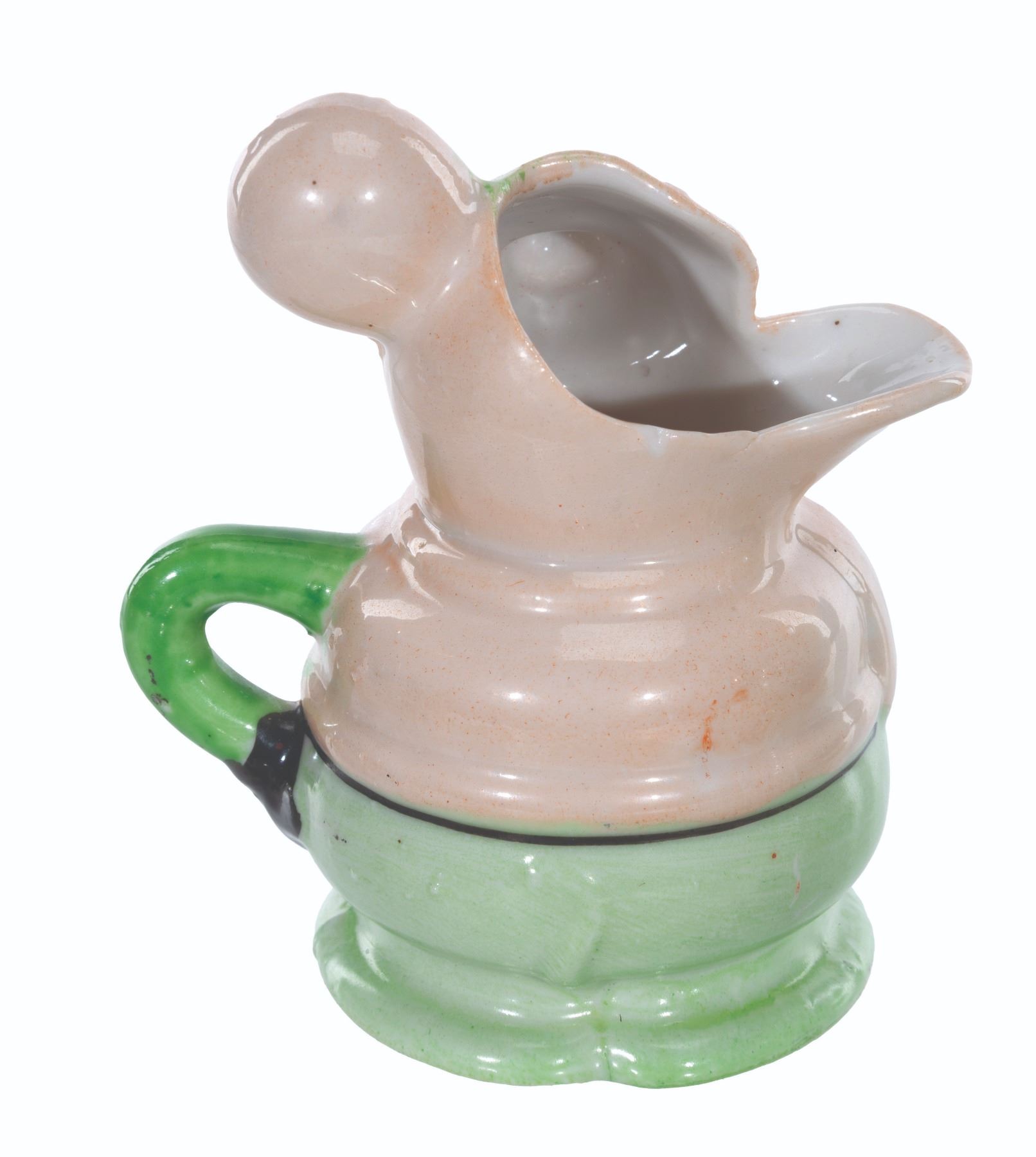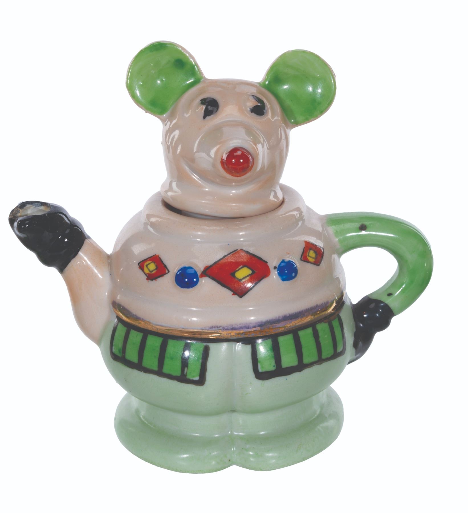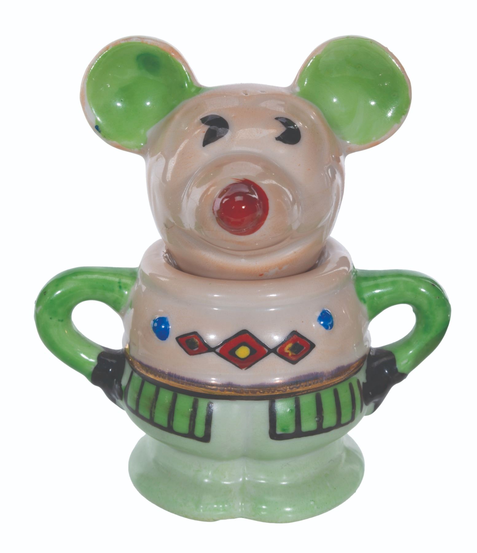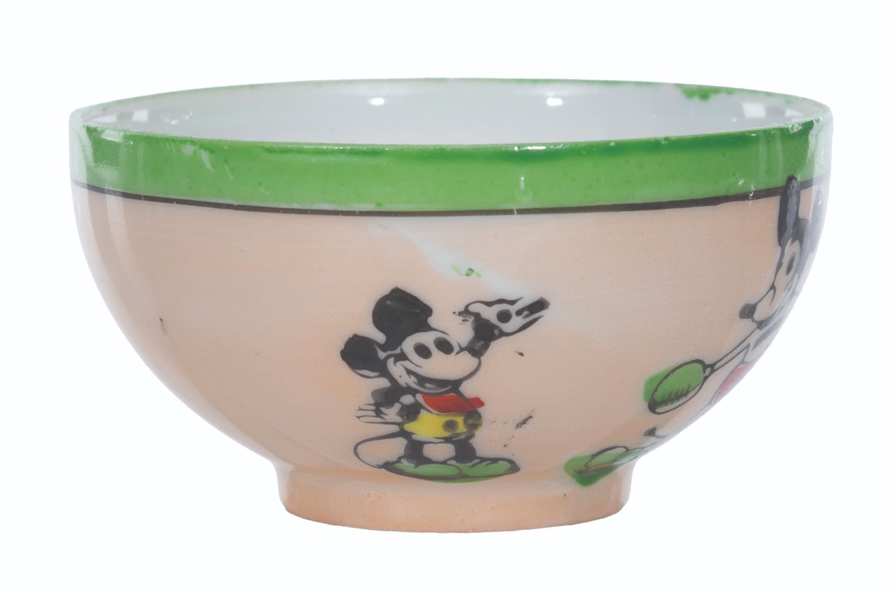 (Borgfeldt, 1930s) A rare Mickey Mouse porcelain serving set by Borgfeldt, the first major distributor of Disney merchandise. Included in the 15-item set are a teapot, a creamer, a sugar bowl, 4 teacups, 4 saucers, and 4 small plates. Ranging in size from the 3” in diameter teacups to the 5” x 5” teapot, the collection is in good to very good condition with scuffs, stains, pinholes, chips, wear, and paint loss.