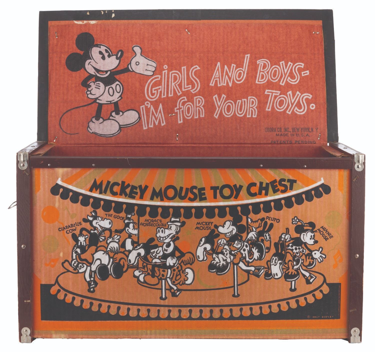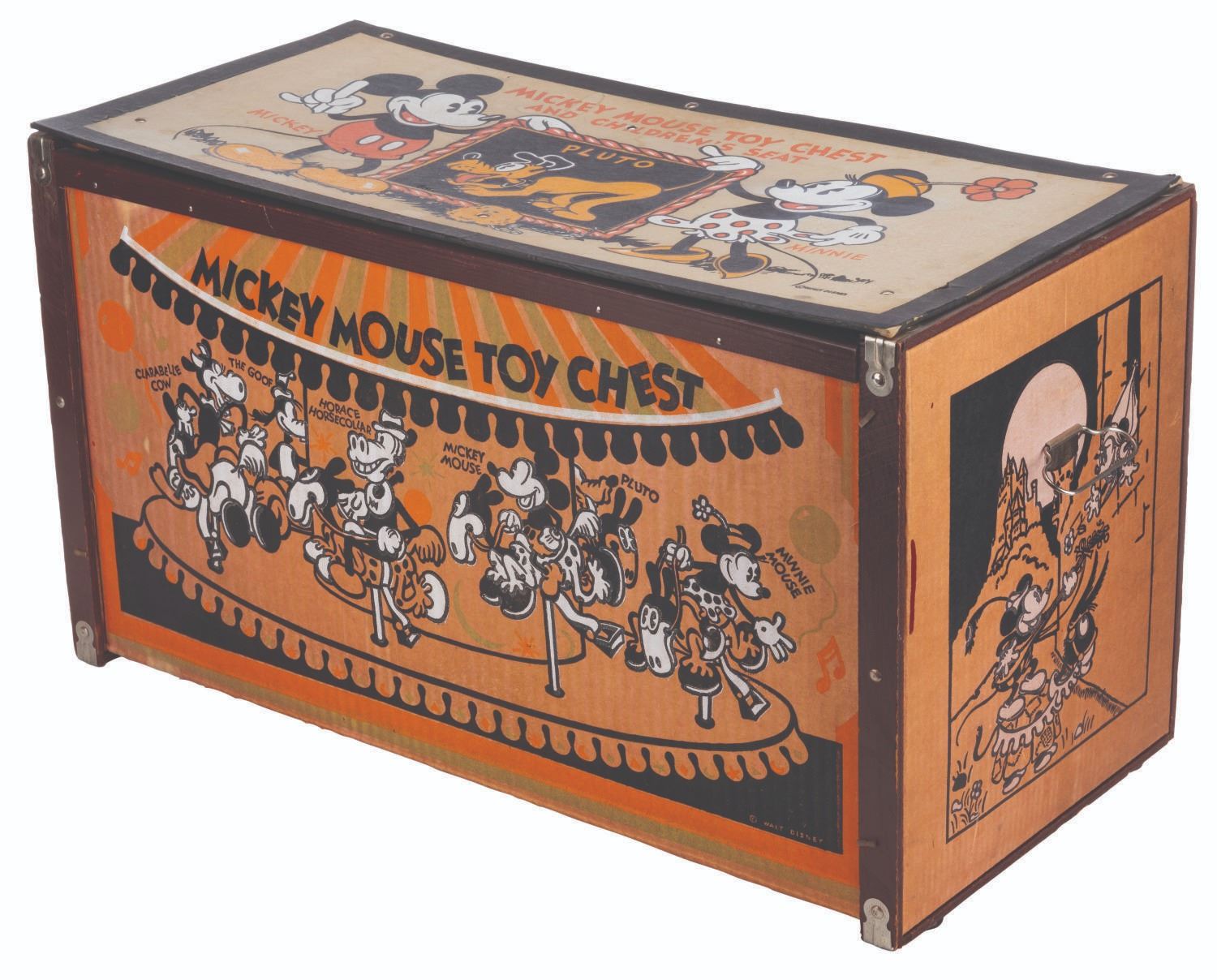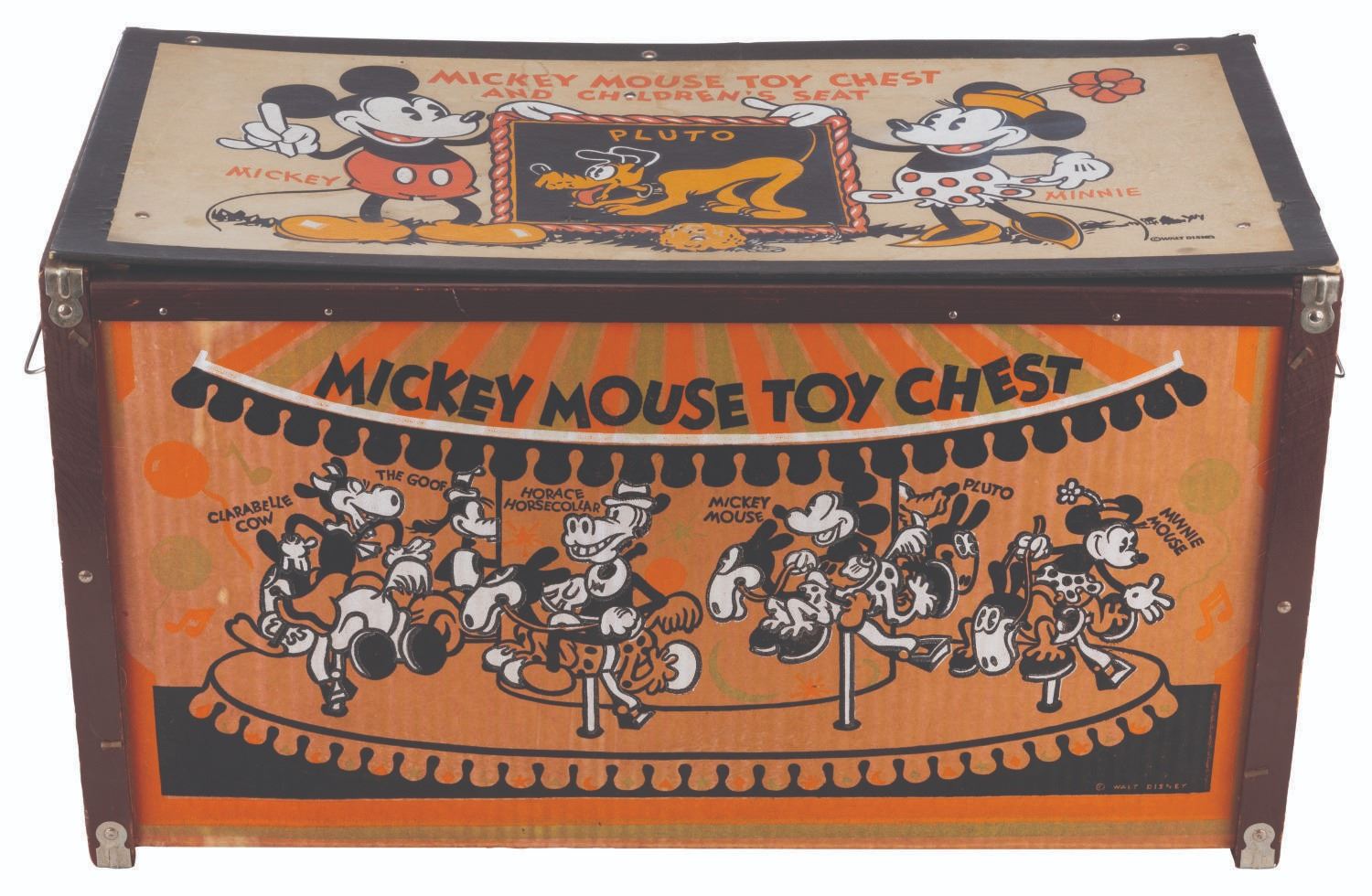 (Odora, 1930s) A rare Mickey Mouse toy chest featuring Mickey, Minnie, Pluto,"The Goof," and early characters Clarabelle Cow and Horace Horsecollar. The inside of the lid reads "Girls and boys - I'm for your toys." Measuring 15" x 26.25" x 12.25" tall, the chest displays in very good condition with creases, water damage, scuffs, discoloration from age, and wear.