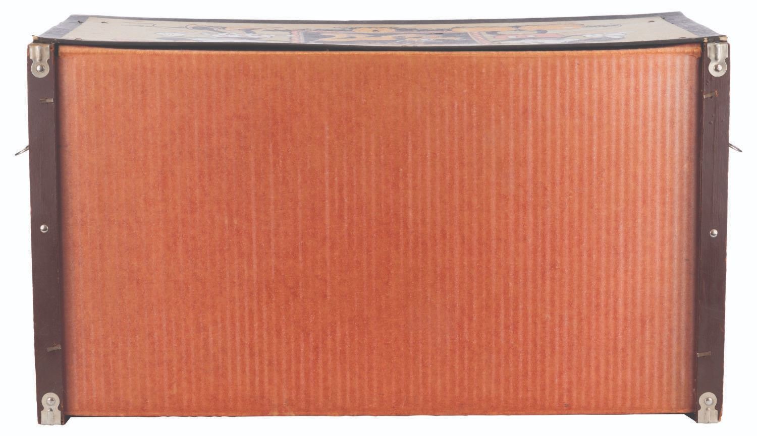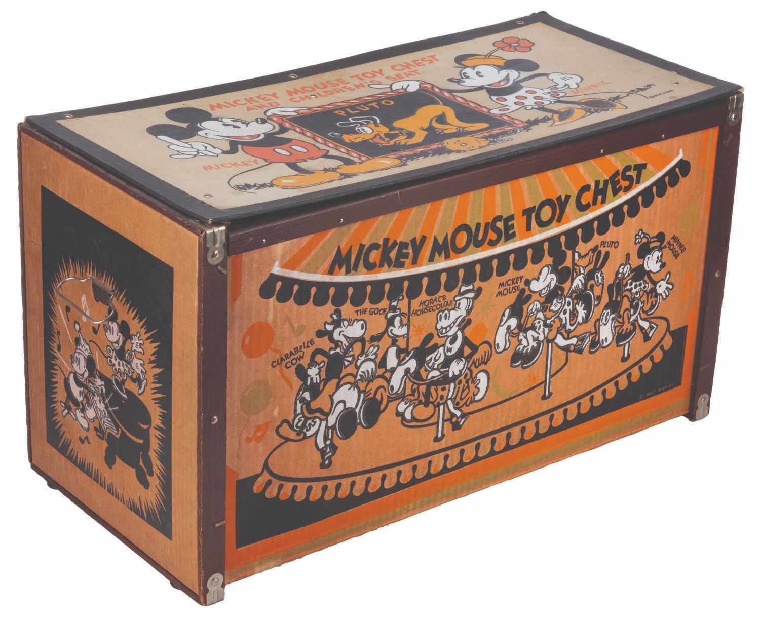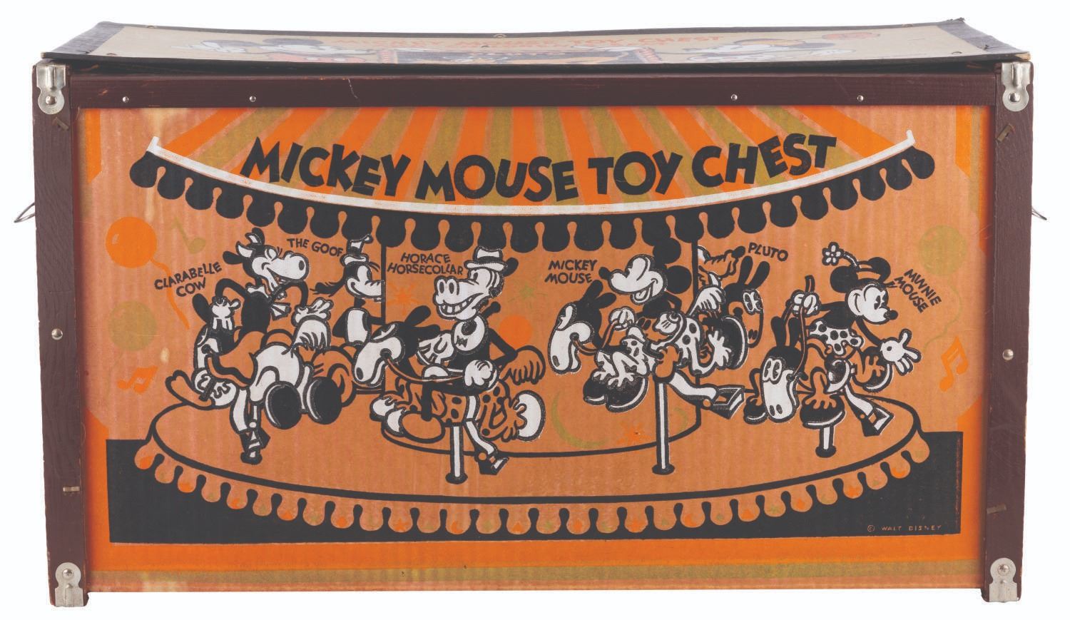 (Odora, 1930s) A rare Mickey Mouse toy chest featuring Mickey, Minnie, Pluto,"The Goof," and early characters Clarabelle Cow and Horace Horsecollar. The inside of the lid reads "Girls and boys - I'm for your toys." Measuring 15" x 26.25" x 12.25" tall, the chest displays in very good condition with creases, water damage, scuffs, discoloration from age, and wear.