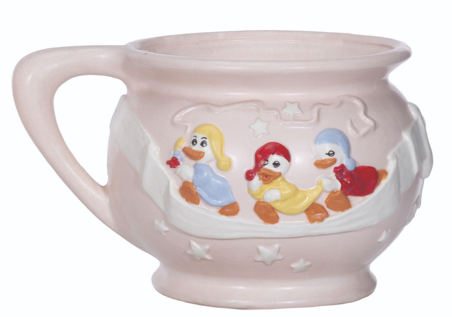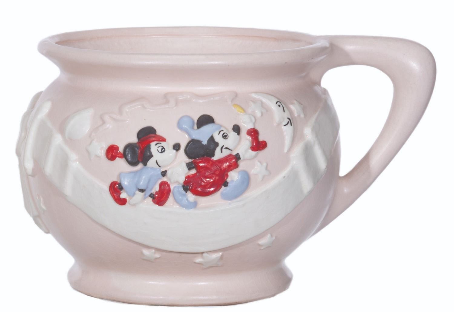 (Vernon Kilns, 1940s) A very rare painted ceramic chamber pot made by Vernon Kilns pottery. Chamber pots like this were used exclusively as gifts from Walt Disney to Studio staff upon the birth of a child. The chamber pots were first made by Vernon Kilns in the 1940s and later by Evan K. Shaw Pottery in the 1950s, with the latter being slightly smaller and glossier. Measuring 6.5" in diameter and 4.75" tall, this pink pot displays in very good condition with light crazing throughout and minimal soiling.