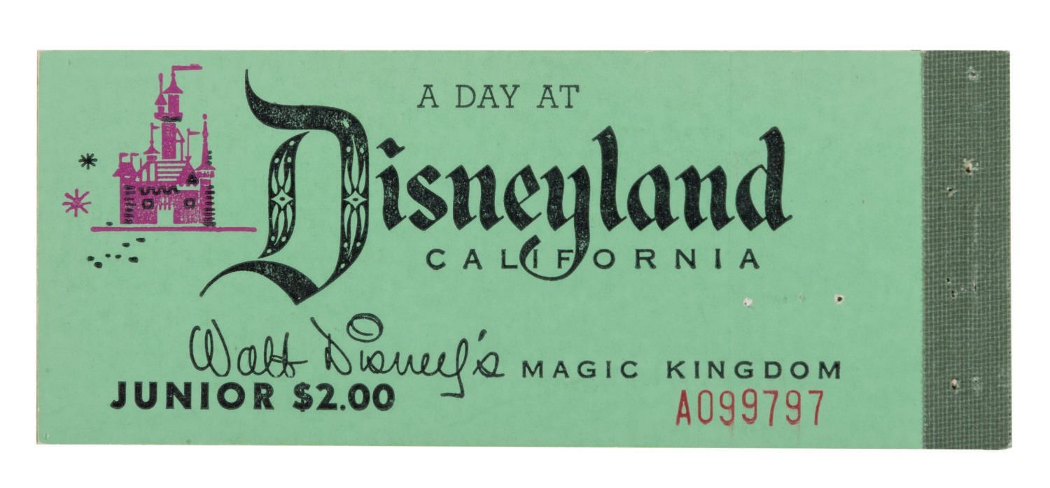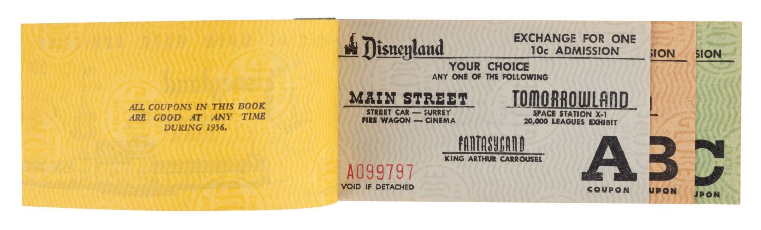 (Disneyland, 1955) an extremely rare complete first version of the famous Disneyland Ticket Books available in October of 1955. In answer to guest feedback following the park's first summer season, Disneyland created a ticket book option in the Fall. "A Day At Disneyland" ticket books were offered to provide volume discounts for multiple attraction purchases due to complaints of Disneyland's high cost. This rare 8-ride ticket book in "Junior" denomination is complete , featuring the gorgeous admission ticket, (3) "A" Tickets, (2) "B" Tickets, and (3) "C" Tickets ("D" and "E" Tickets were added later). Measuring 2"x5", the book is in fine condition with crisp edges and no fading. There are two staple holes on the rear cover just below the word "California." This is the best example of this ticket book we have ever seen.
