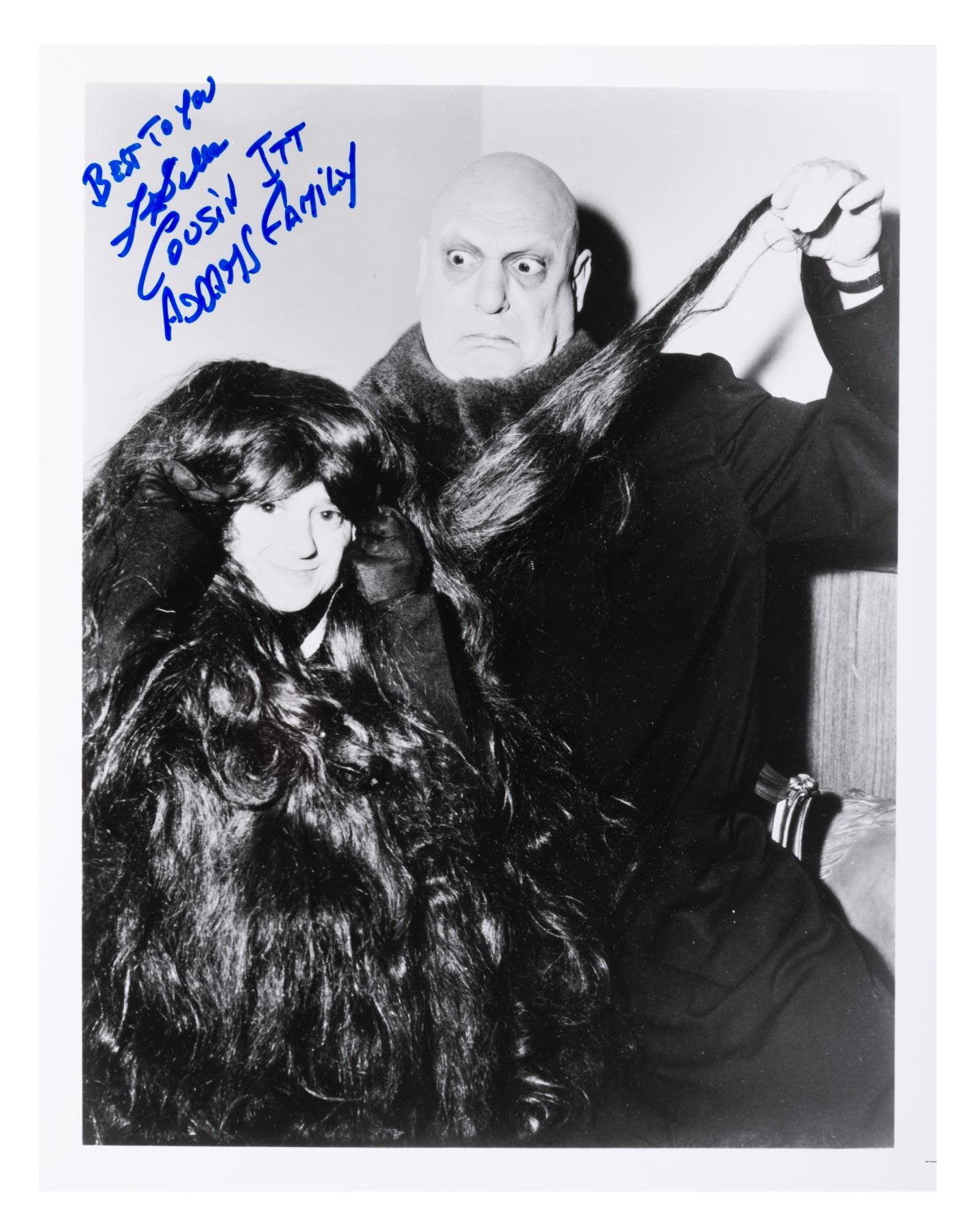(ABC, 1970s-90s) A rare behind-the-scenes photograph of Felix Silla as Cousin Itt from ABC's "The Addams Family" signed by the actor himself. Measuring 8" x 10", the signed photo is in fine condition.