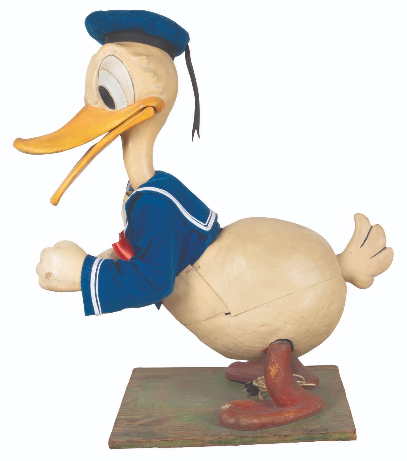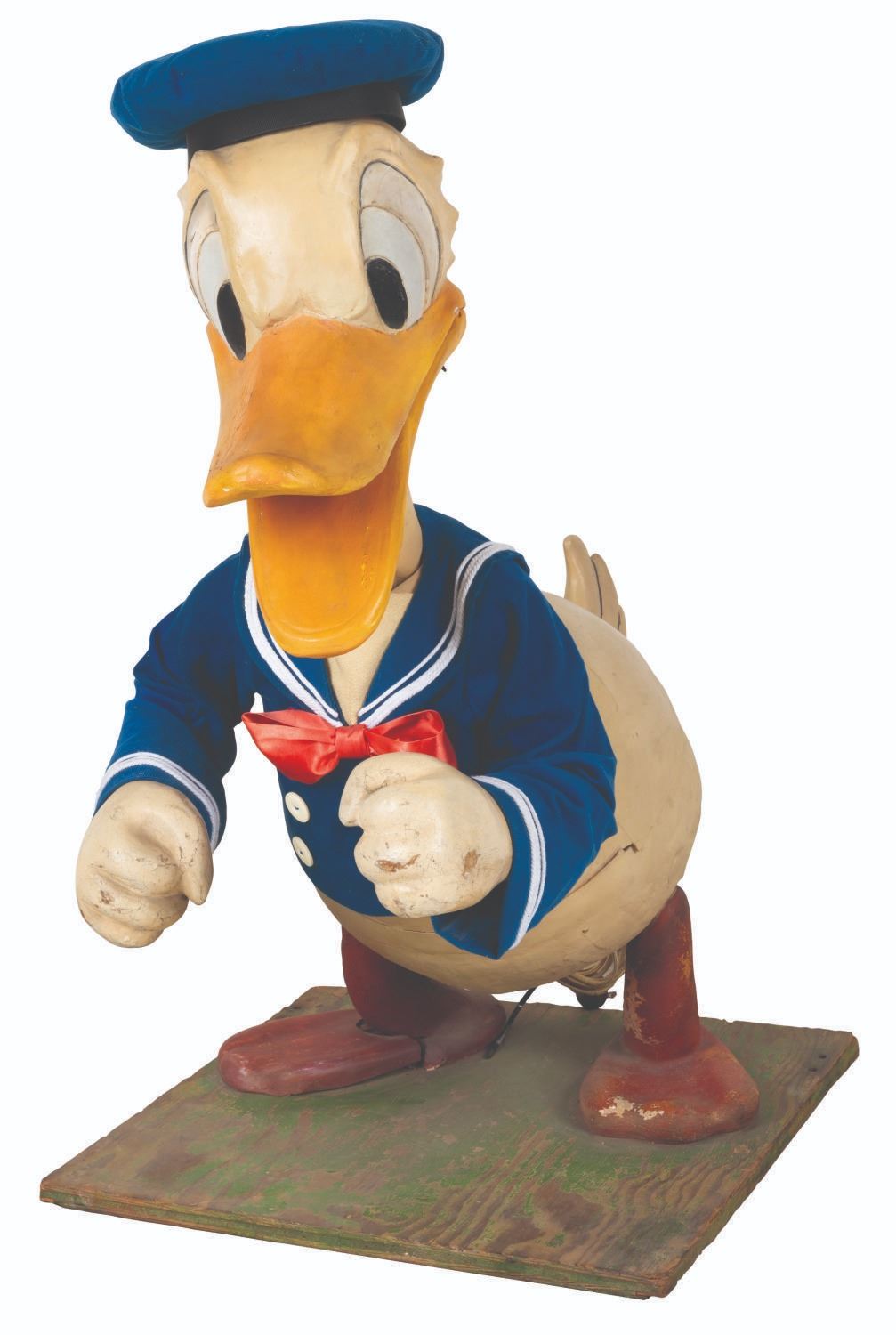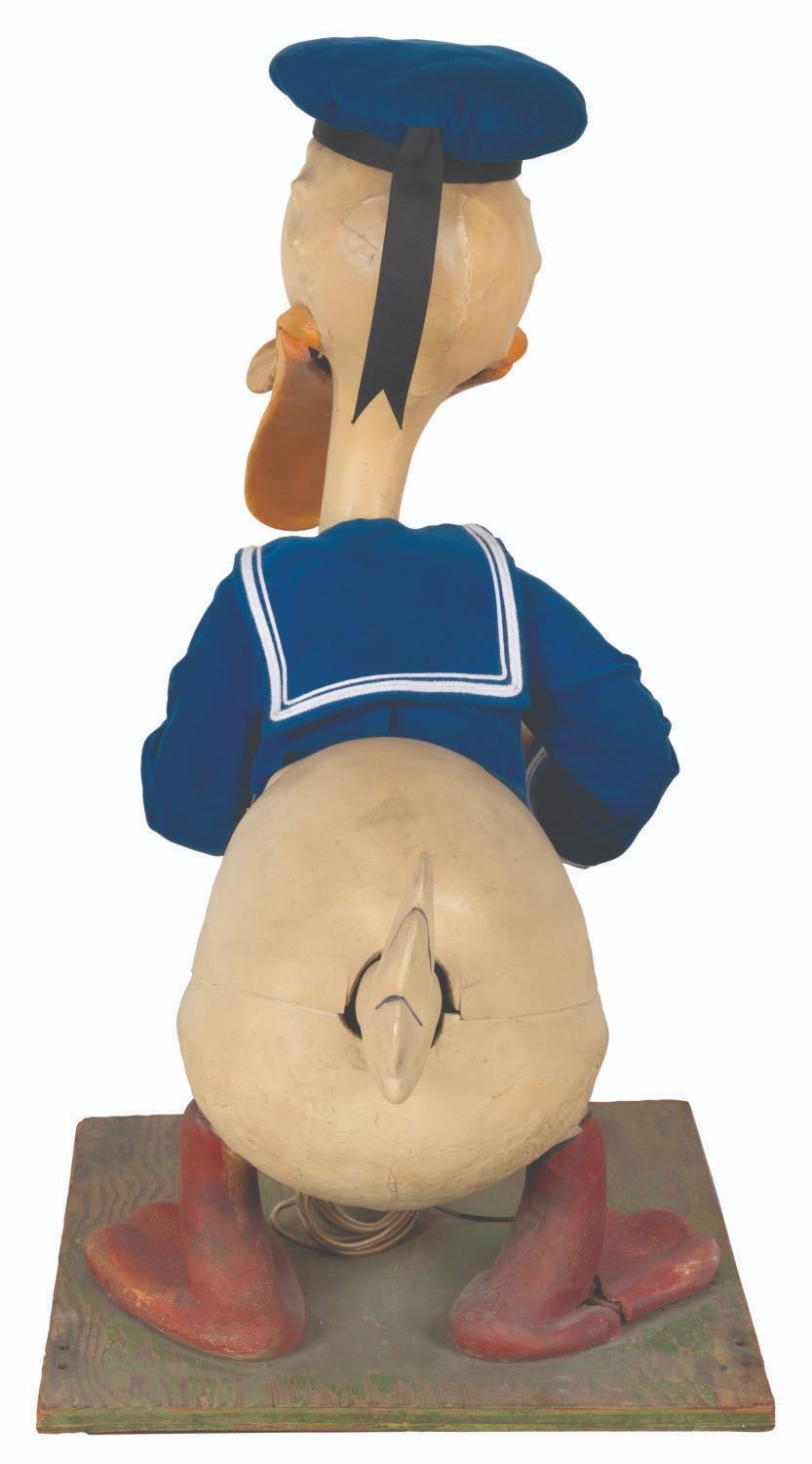 (Disney, 1940s) A very rare animated store display figure of Donald Duck. Unlike the Old King Cole flat display figures, this full figure Donald can be viewed from any angle, designed to rock back and forth and put up his fists, while his head turns left and right, and tail feathers waggle. A bulb inside his head is meant to light up his eyes, but the animation and light are non-functional due to age. Donald's hat and jacket were custom-made for the figure by Bob Baker Marionettes. Measuring 22” x 13” x 34.5” tall and affixed to a 20” x 20” wooden base, the figure displays in very good condition, with some scuffs and spots of paint wear from age. This lot requires special shipping arrangements. Please inquire before bidding.