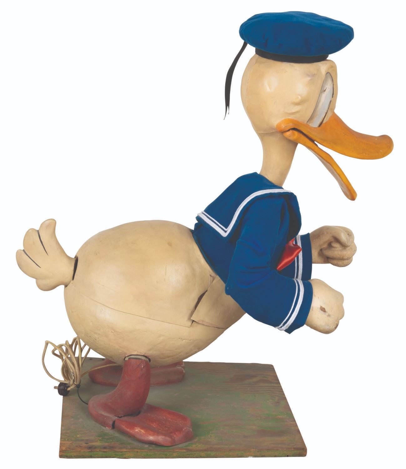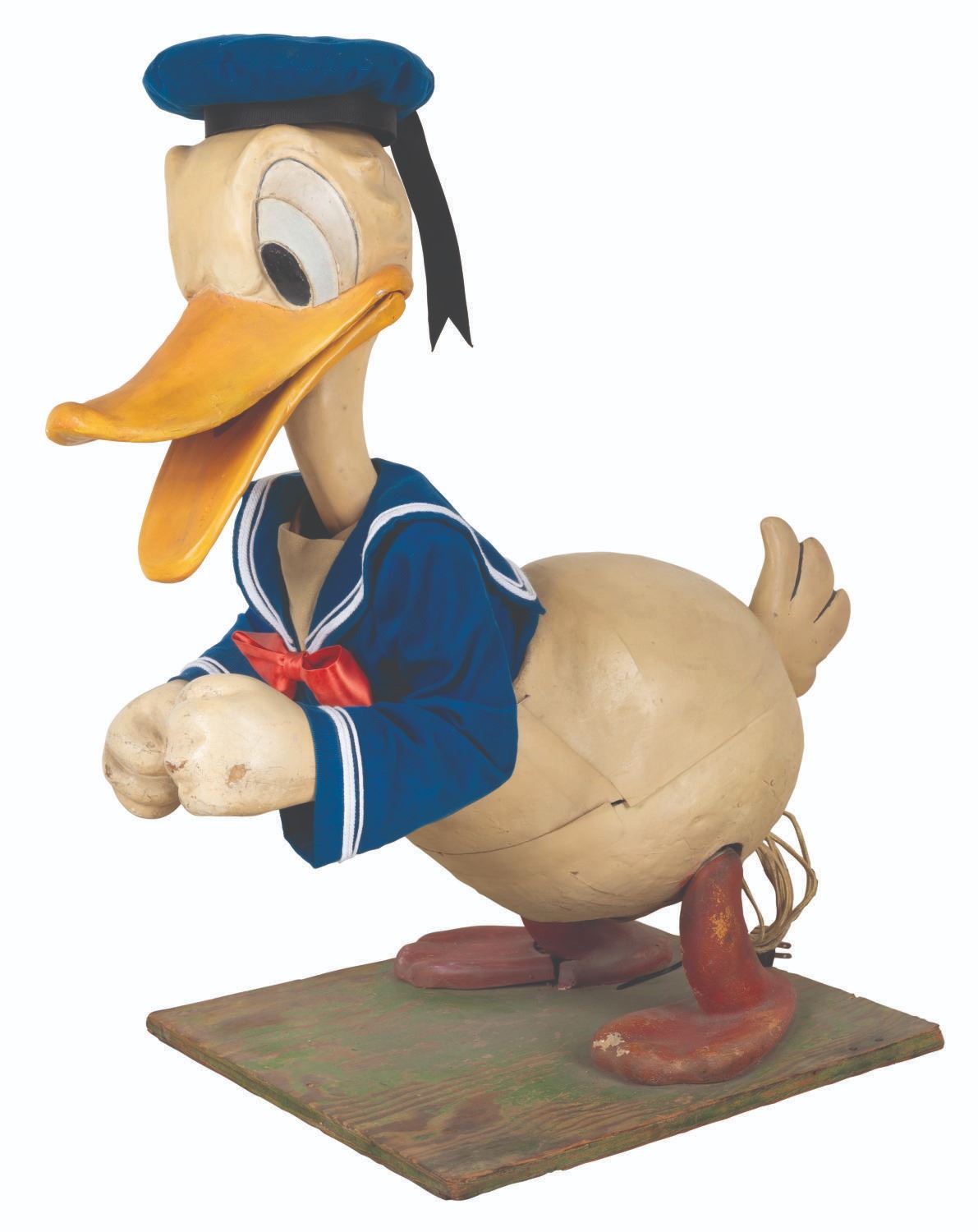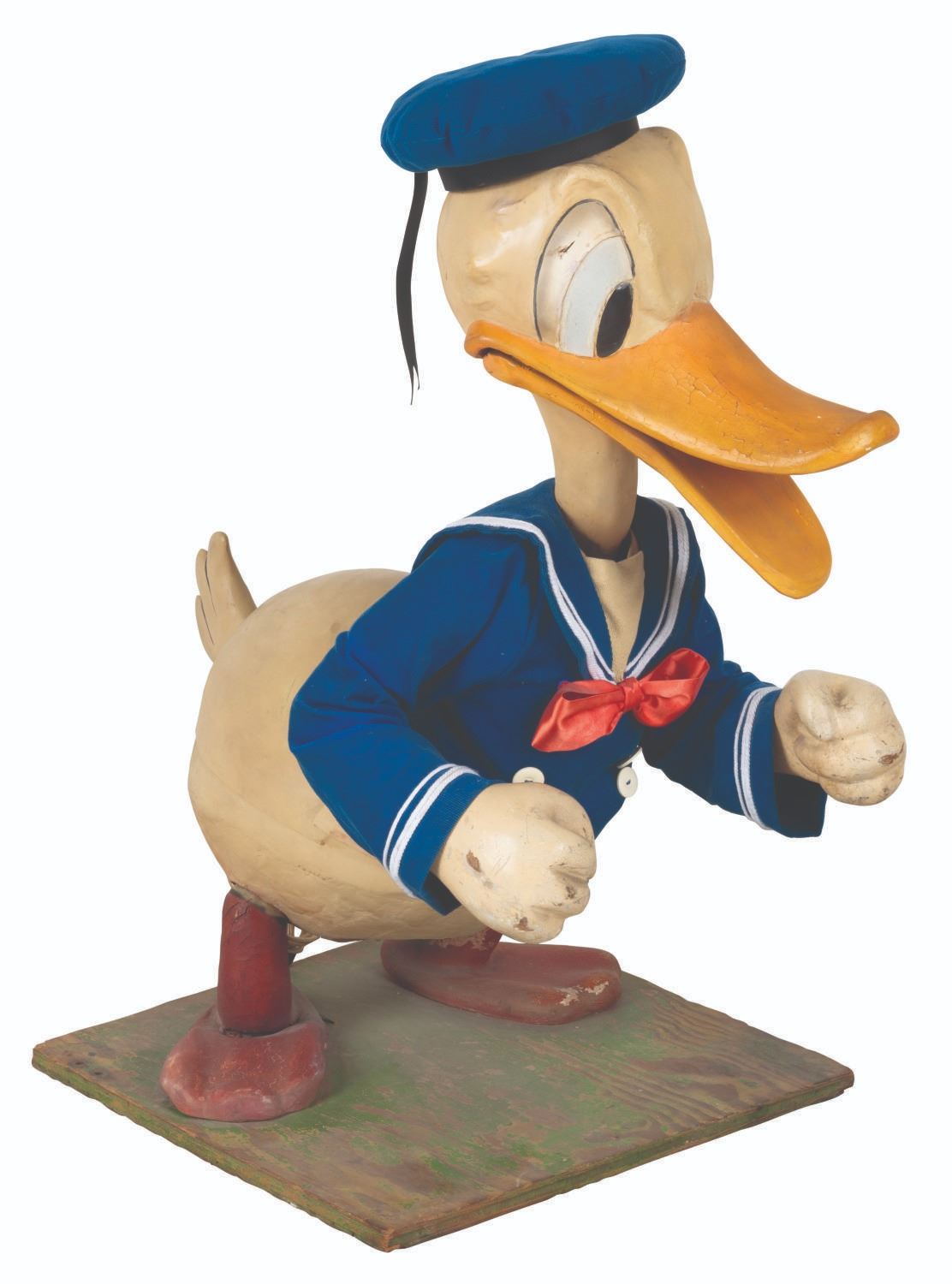 (Disney, 1940s) A very rare animated store display figure of Donald Duck. Unlike the Old King Cole flat display figures, this full figure Donald can be viewed from any angle, designed to rock back and forth and put up his fists, while his head turns left and right, and tail feathers waggle. A bulb inside his head is meant to light up his eyes, but the animation and light are non-functional due to age. Donald's hat and jacket were custom-made for the figure by Bob Baker Marionettes. Measuring 22” x 13” x 34.5” tall and affixed to a 20” x 20” wooden base, the figure displays in very good condition, with some scuffs and spots of paint wear from age. This lot requires special shipping arrangements. Please inquire before bidding.