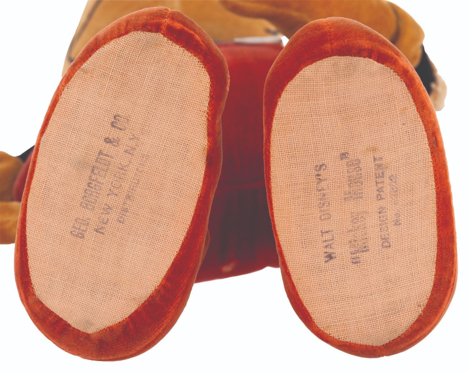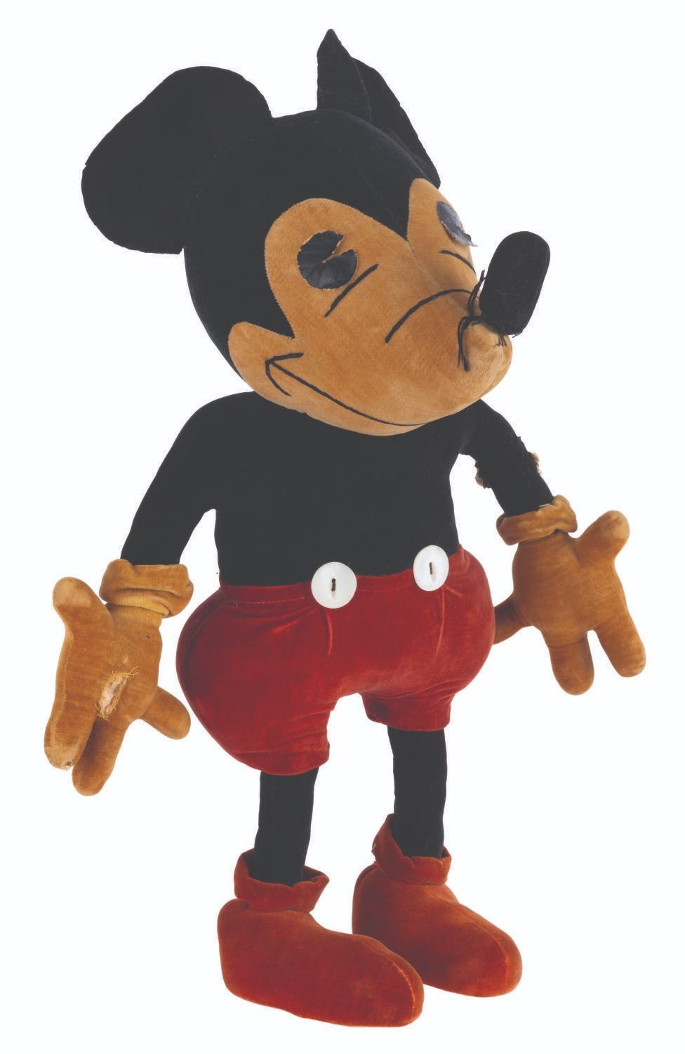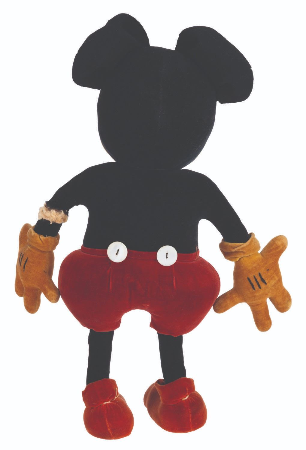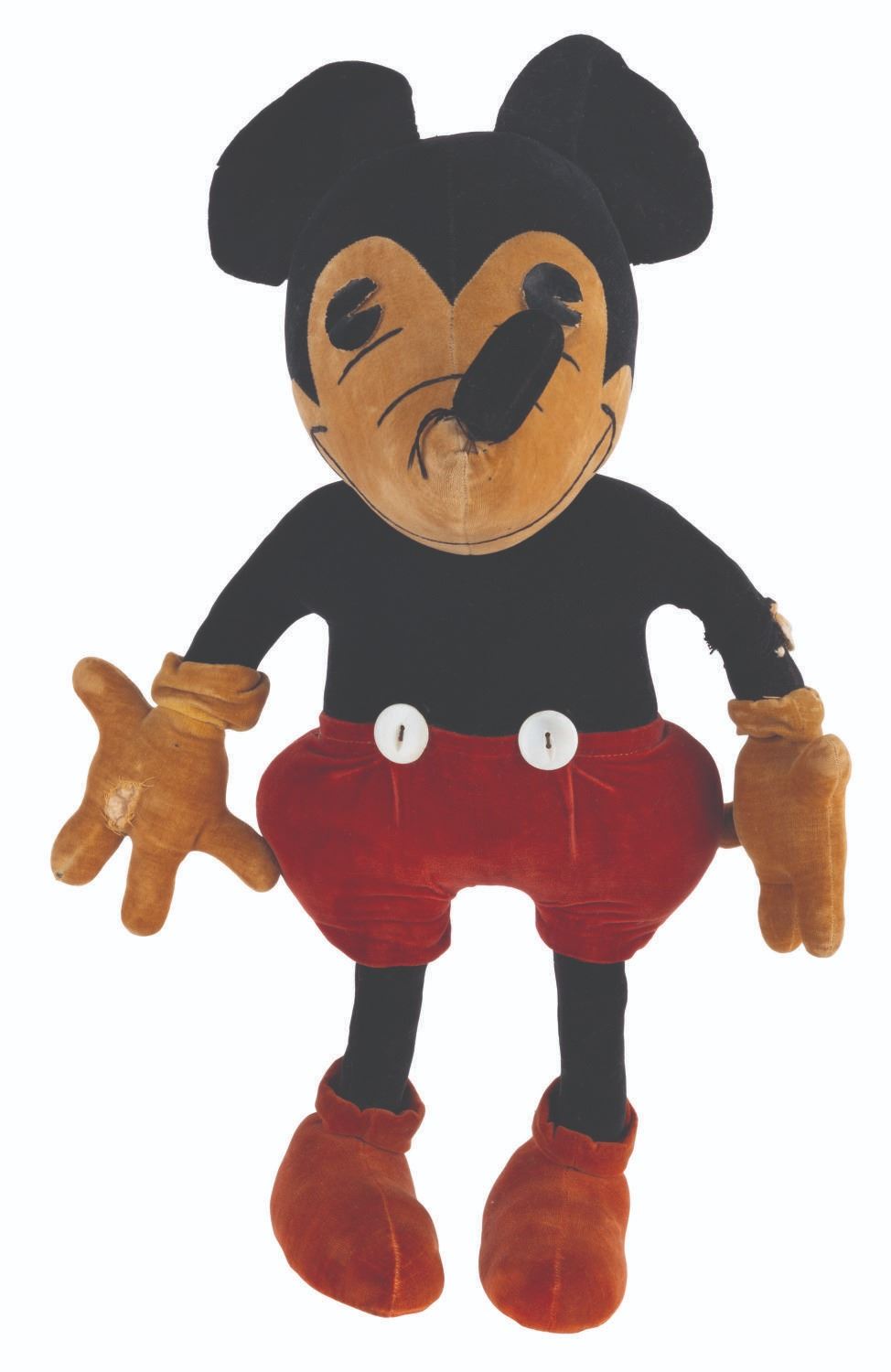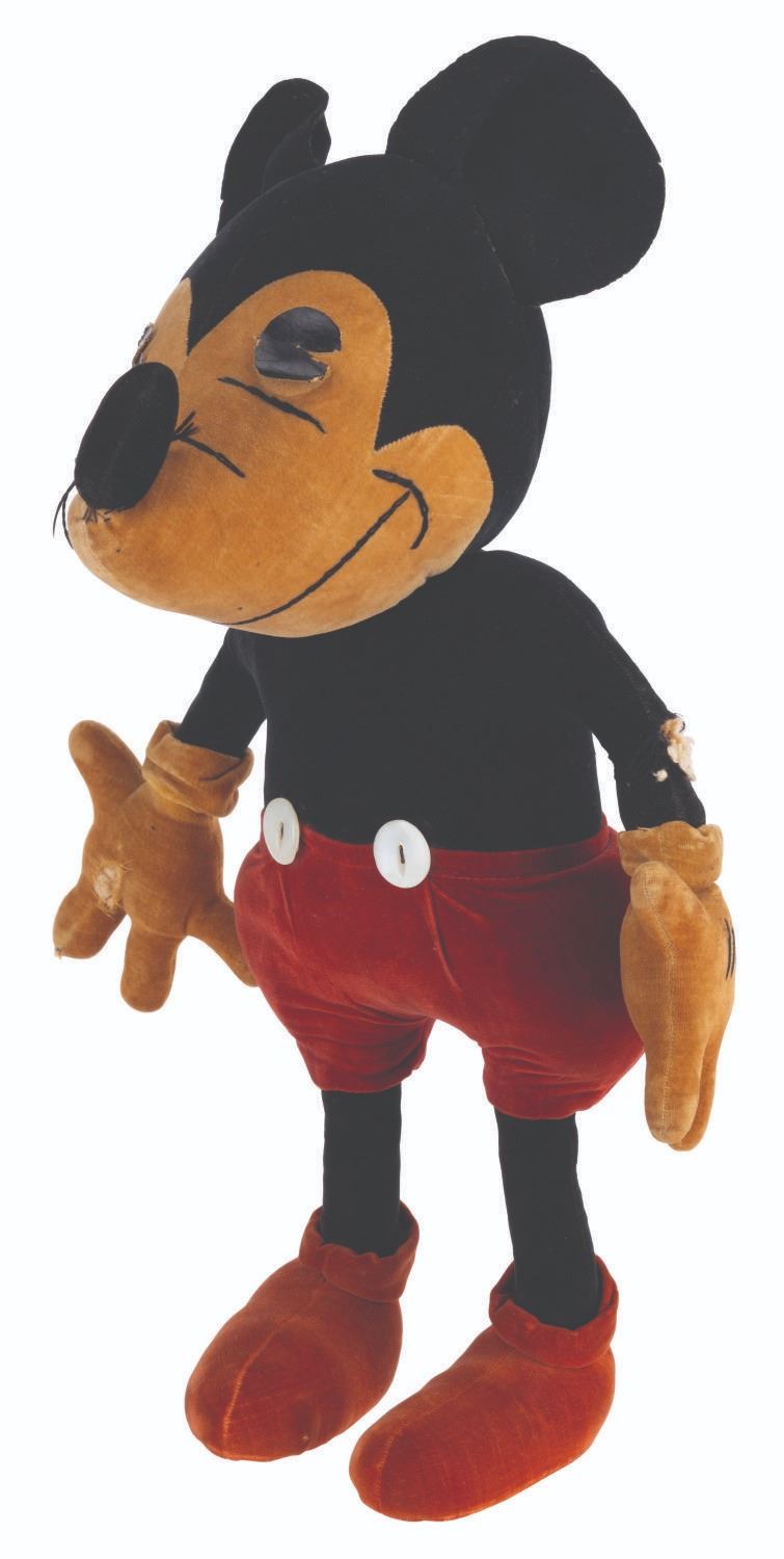 (Charlotte Clark, 1930) A rare Charlotte Clark Mickey Mouse Doll. This 18" version of the doll was likely manufactured at the Studio Shop where Bob Clampett worked. The bottom of the doll's feet are stamped with Walt Disney's copyright and George Borgefeldt & Co., the distributors for Disney Merchandise at the time. With a velveteen body and oilcloth eyes, the doll is in good condition with a tear to Mickey's left arm exposing the stuffing and staining from age throughout. It still presents well overall and is a wonderful example of a piece of Disney History. This item does not come from the Bob Clampett Collection.
