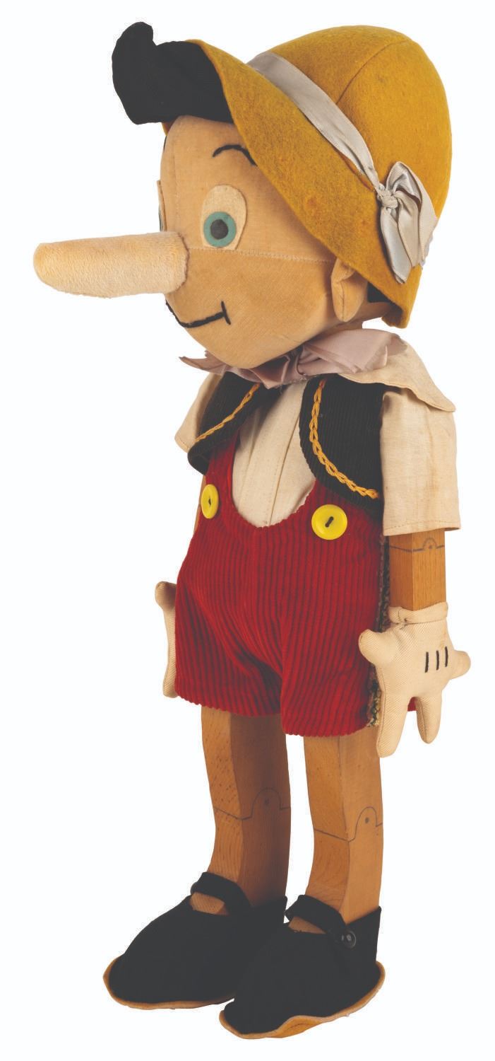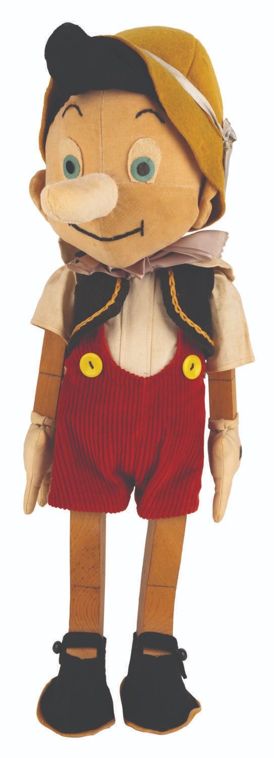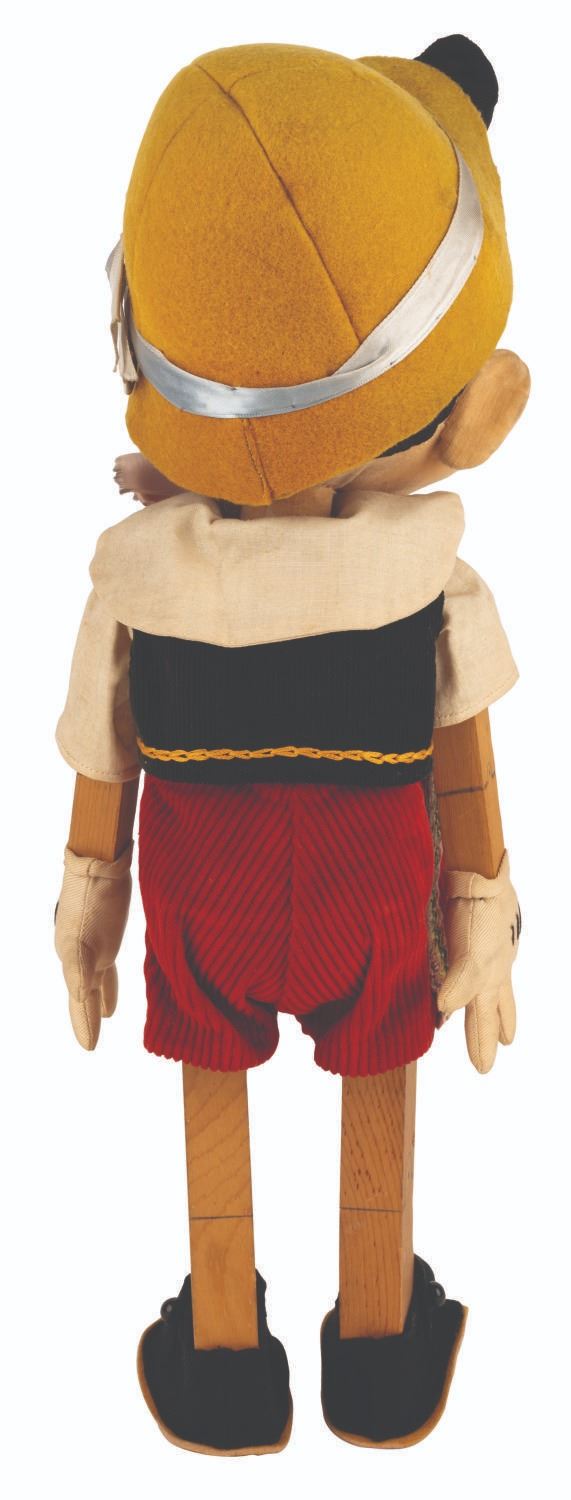 (Charlotte Clark, 1940s) An extremely rare Pinocchio Doll by Charlotte Clark. Unlike her other dolls, Pinocchio incorporates solid wood legs and arms and a stuffed head and body. The arms and legs have pencil line drawings at the mid points to imply hinging but are solid wood. The doll came from Clark's personal collection and was given to relatives in the late 40s. Pinocchio is in very good condition, however the nose (which was a separate piece) may have been replaced at some point. Overall, the doll presents beautifully and is one of only three we have ever seen.