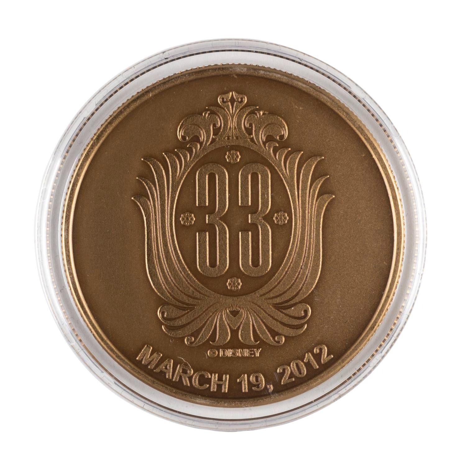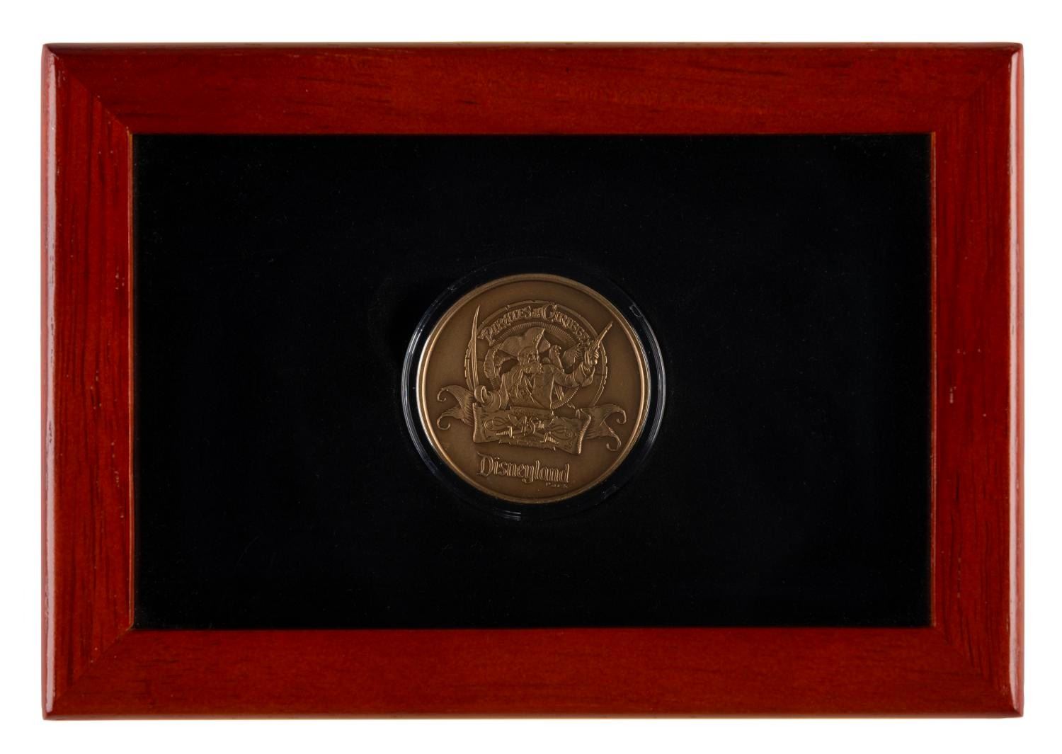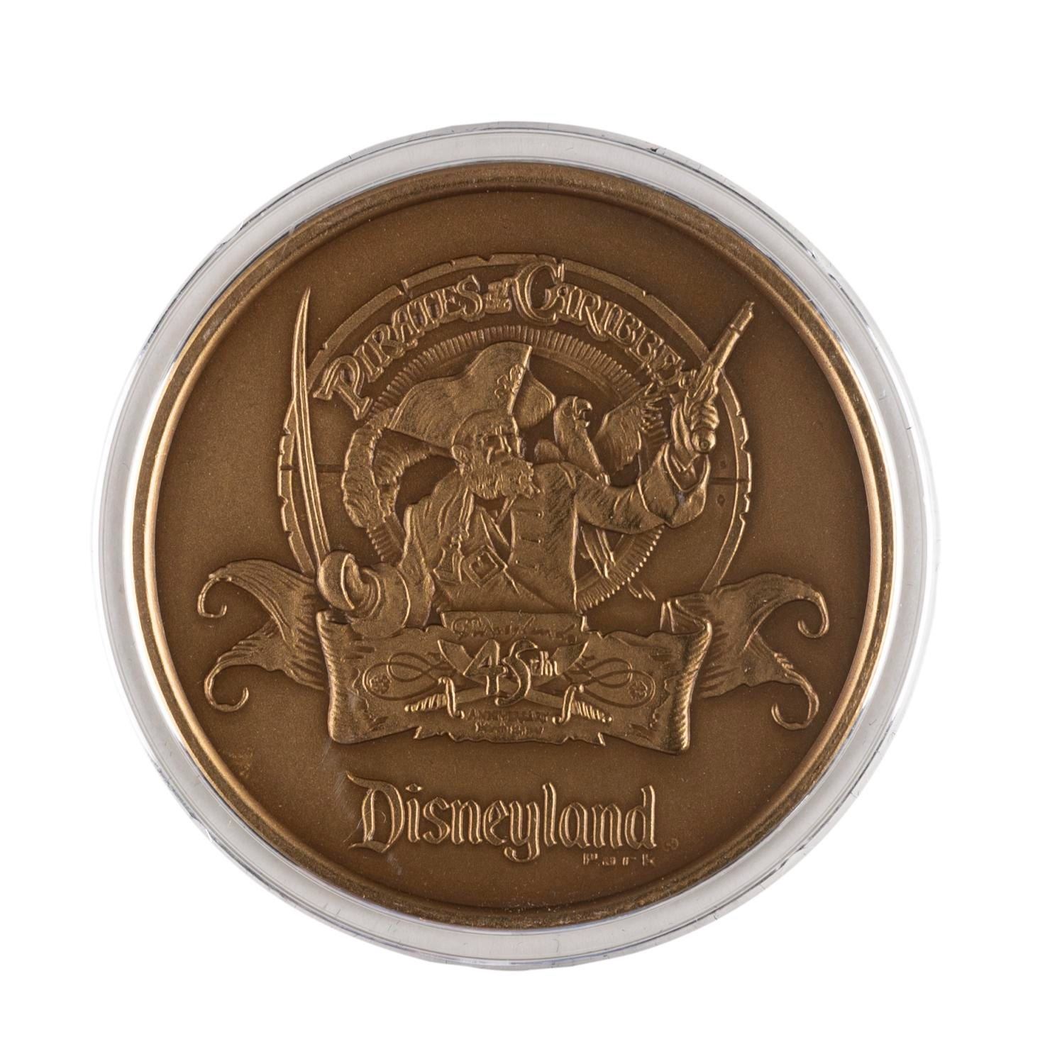 (Disneyland, 2012) An exclusive Club 33 challenge coin released for the 45th anniversary of the Pirates of the Caribbean attraction. Featuring a relief of Pirates of the Caribbean and the original Club 33 emblem on the back, the coin measures 1.5" in diameter. The medallion was a special gift and not sold to the public. The medallion is in fine condition with its original case, and certificate of authenticity numbered 25 of 125.
