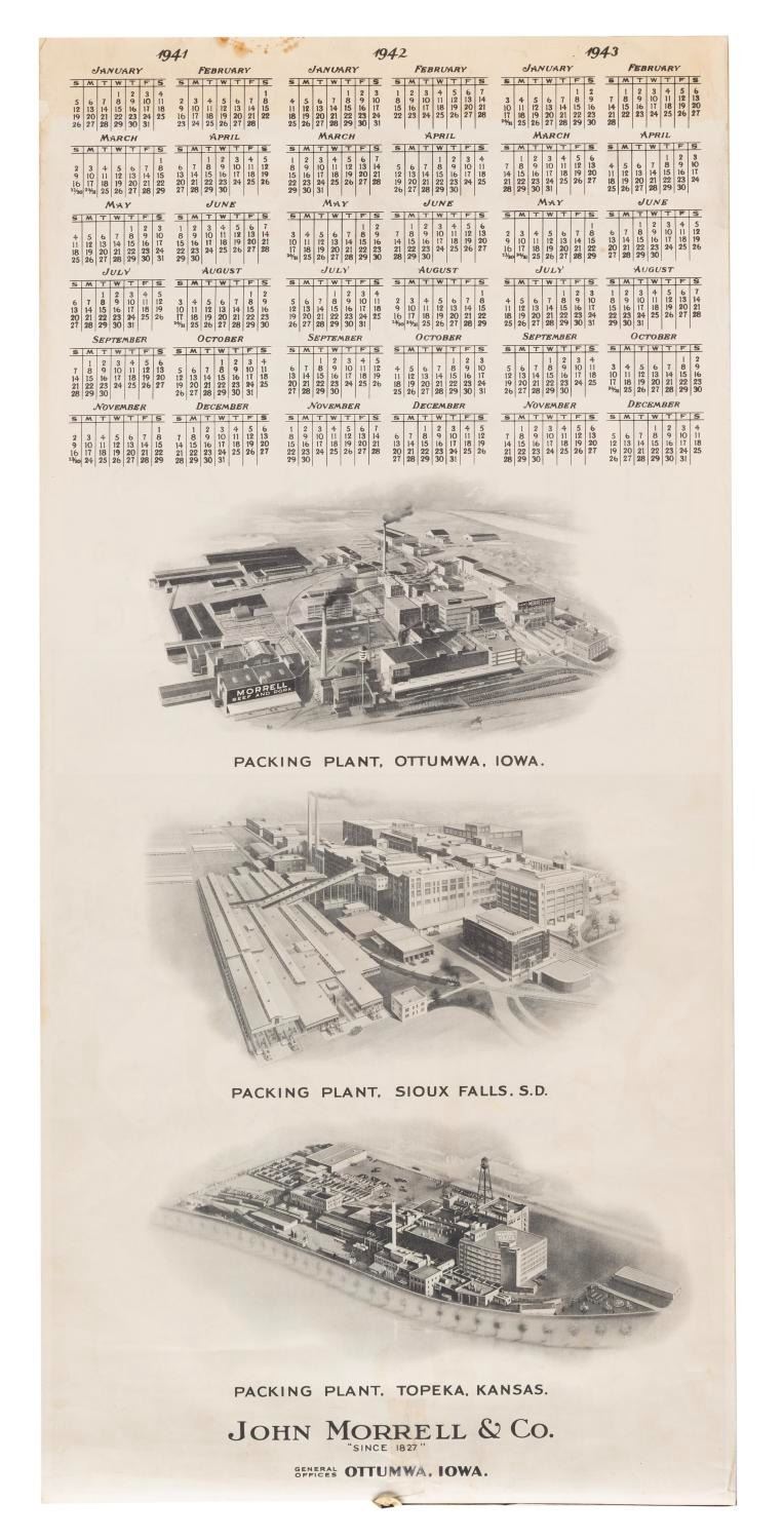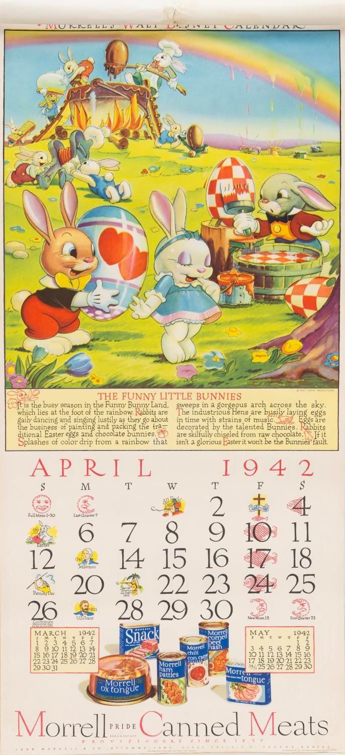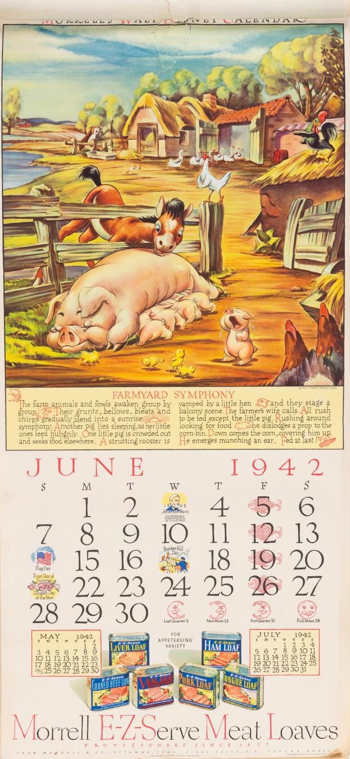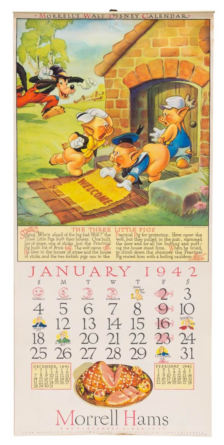 (John Morell & Co., 1941) A complete promotional Morrell Hams calendar featuring early Disney animated shorts. With colorful art of scenes from "The Three Little Pigs, " "The Ugly Duckling, " "Farmyard Symphony, " and more on each month, often single pages are found, but rarely a full 12-month calendar like this. Measuring 14 " x 30 ", the calendar is in good condition with moderate stains, discoloration, tears, edge wear, and creasing.