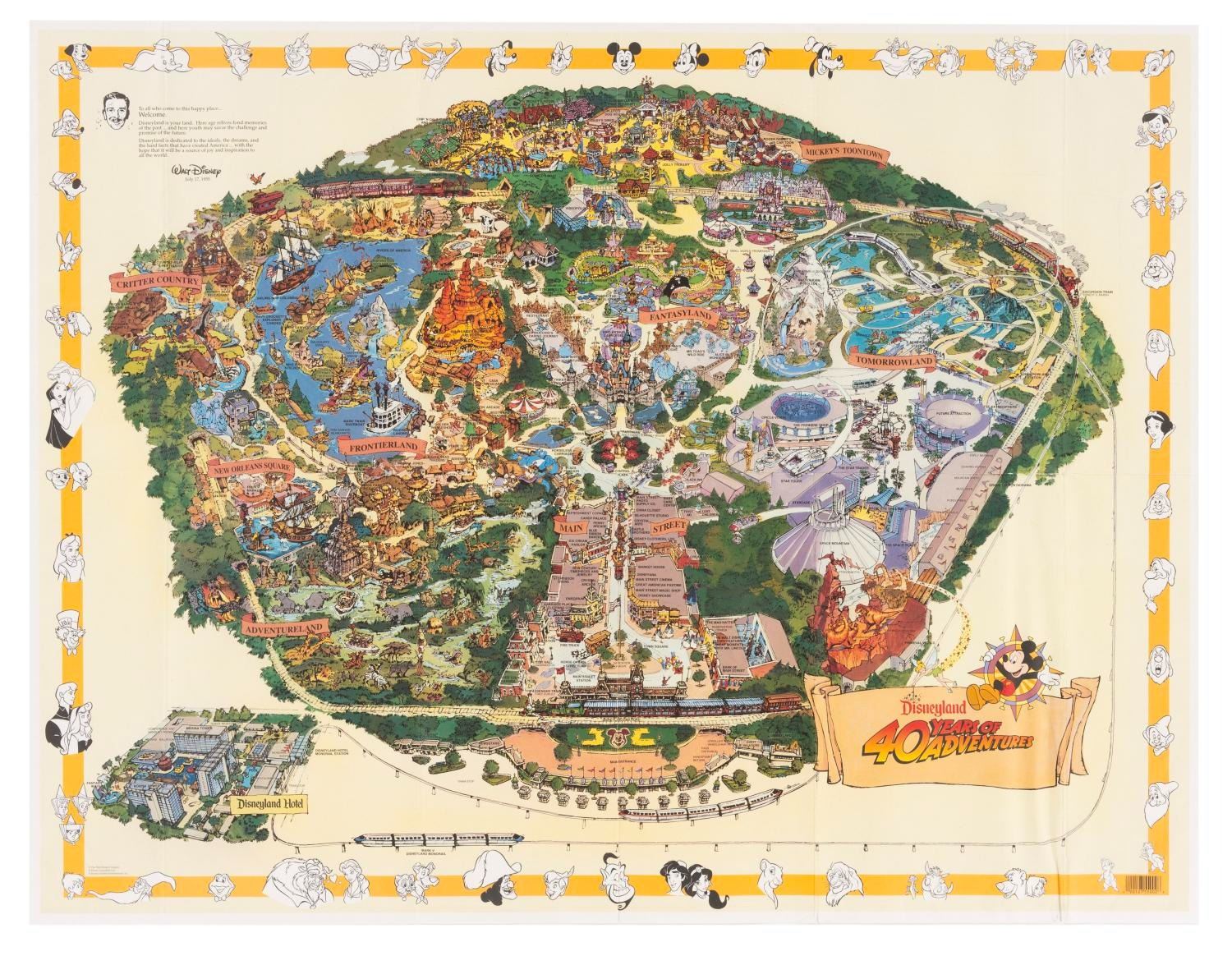 (Disneyland, 1995) A large souvenir map of Disneyland from 1995 featuring the 40 Years of Adventure banner in the lower right-hand corner. This is the second, rarer version of the map released that year, after the first included several printing errors. This was the first map to feature Mickey's Toontown and the Indiana Jones Adventure attraction, as well as the last appearance of the PeopleMover. Measuring 27” x 35”, the map is in very good condition with creases along the original folds, and some scuffing along one interior fold line.