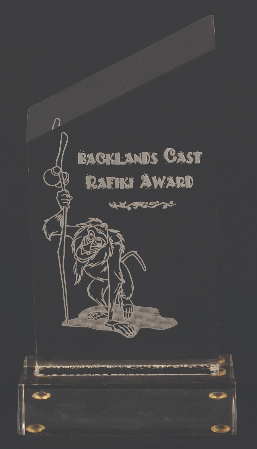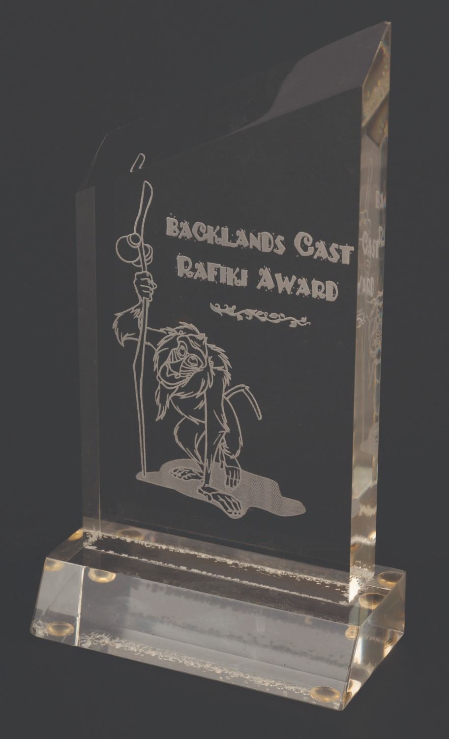 (Disney's Hollywood Studios, 2010s) A rare Backlands Cast Rafiki Award issued to a Cast Member who worked behind the scenes (the backlands) at Disney's Hollywood Studios. Measuring 6.75" tall and 3.5"x1.75", the engraved lucite award is in good condition exhibiting scuffs, scratches, and light wear.