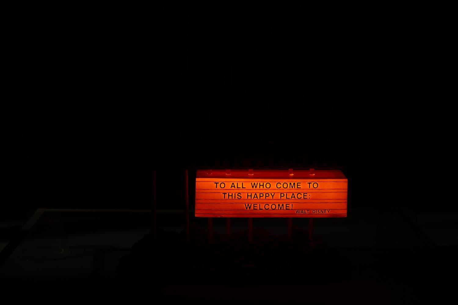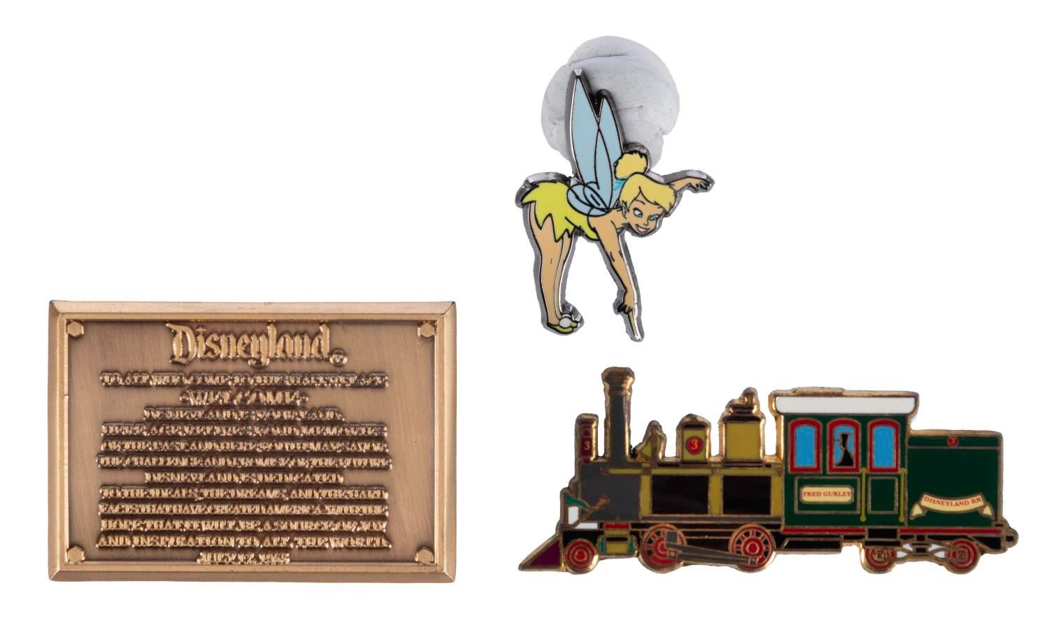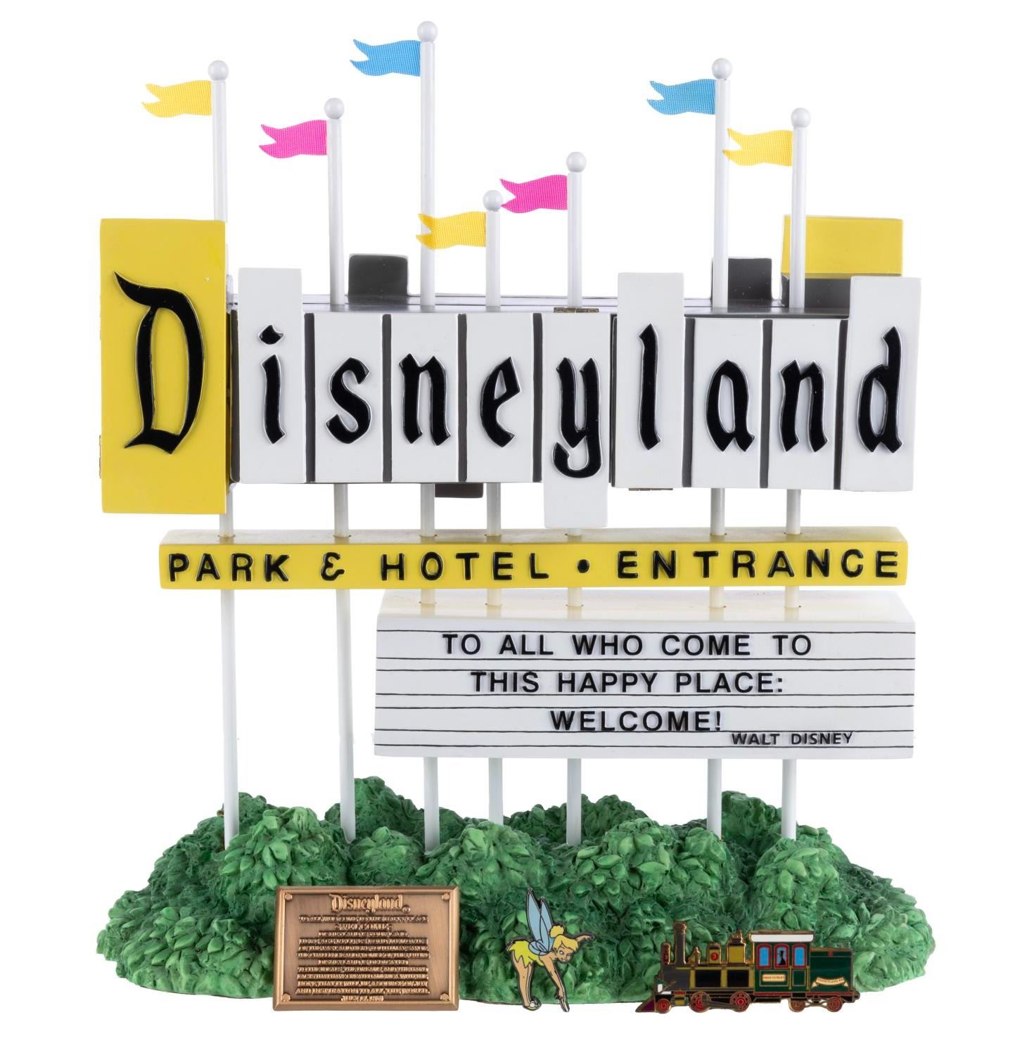 (Disneyland, 2005) A rare Disneyland 50th Marquee figurine and pin set. This figure was released in an edition size of 300 and features illumination with two AA batteries (not included). It is accompanied by three pins of Tinker Bell, the Fred Gurley, and the Dedication Plaque. Measuring 10.5"x9.25"x4", this figure and pin set are in fine condition.